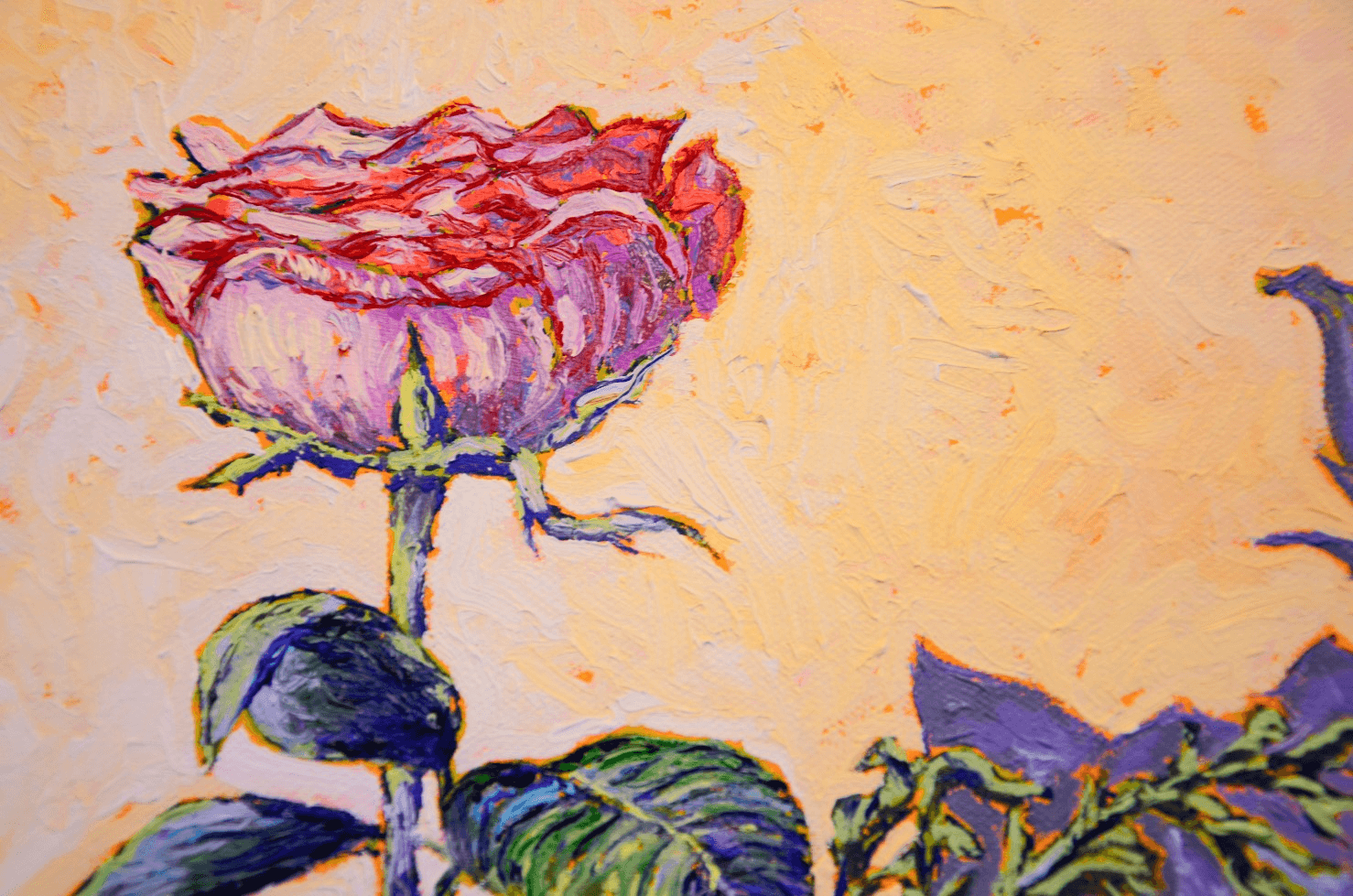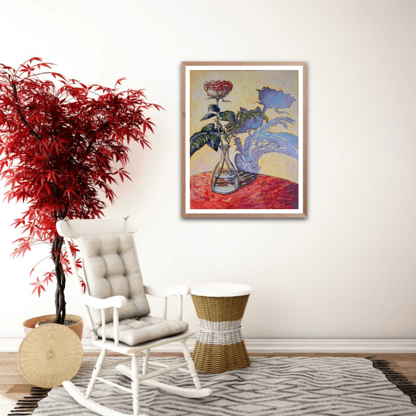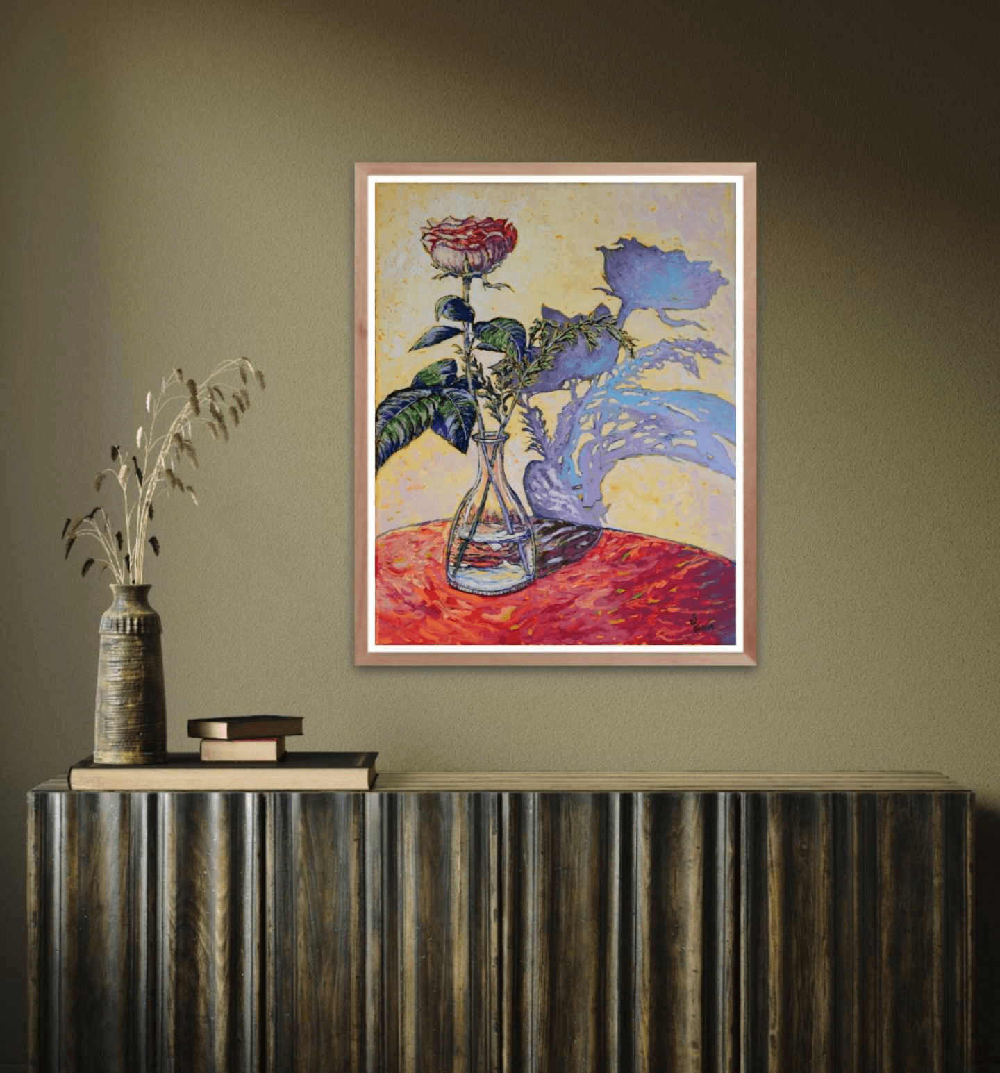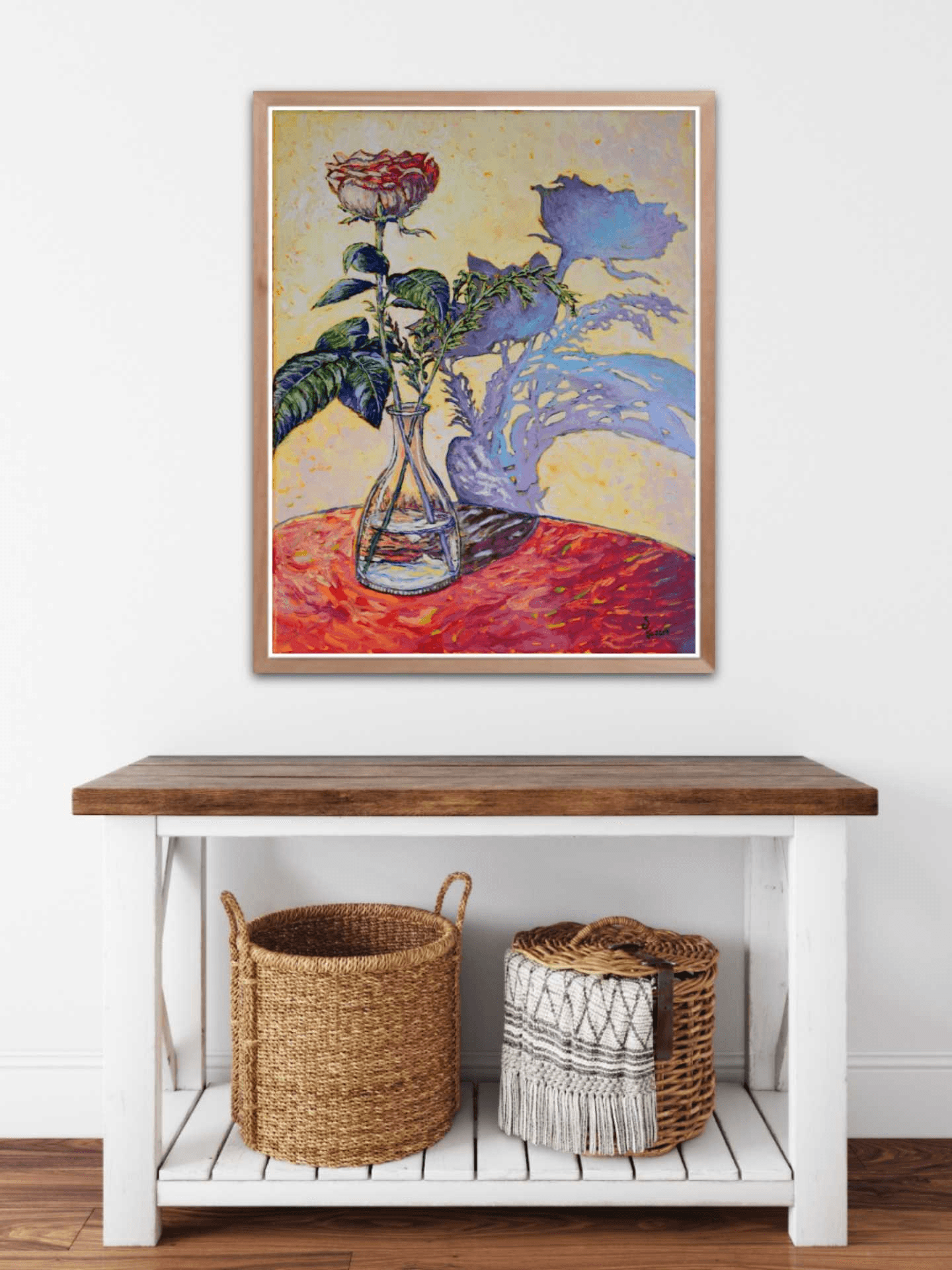 An elegant, single rose, standing in a clear glass vase, its soft and mellow shadow cast against the wall behind it. The composition of this lovely still-life gives the illusion that the flower and its shadow are intertwined, dancing and languishing in an ever-lasting embrace.