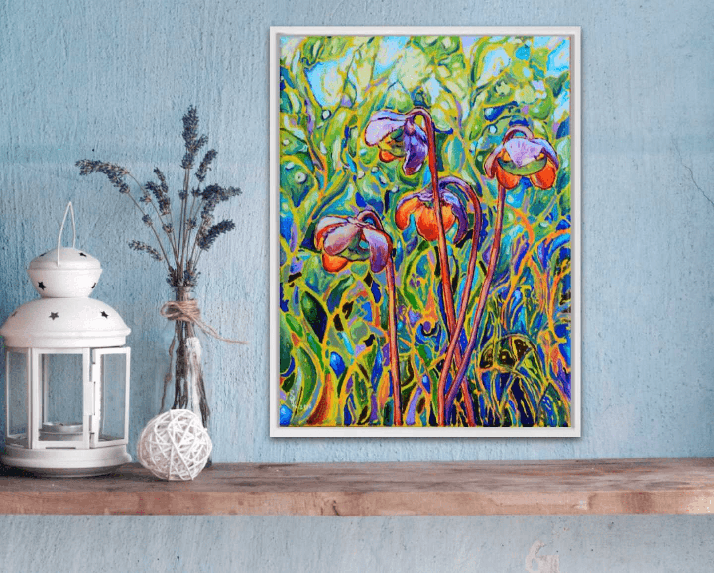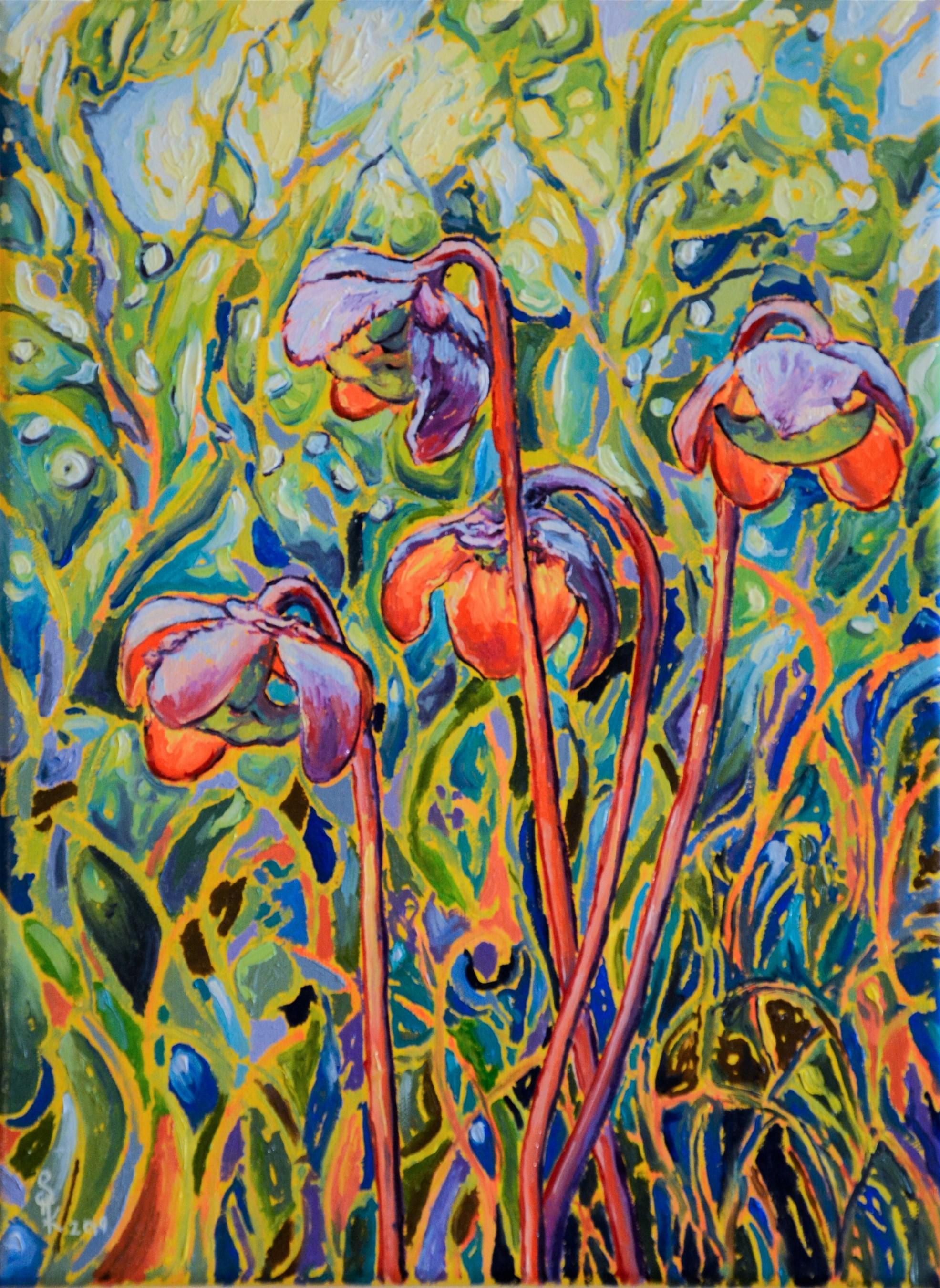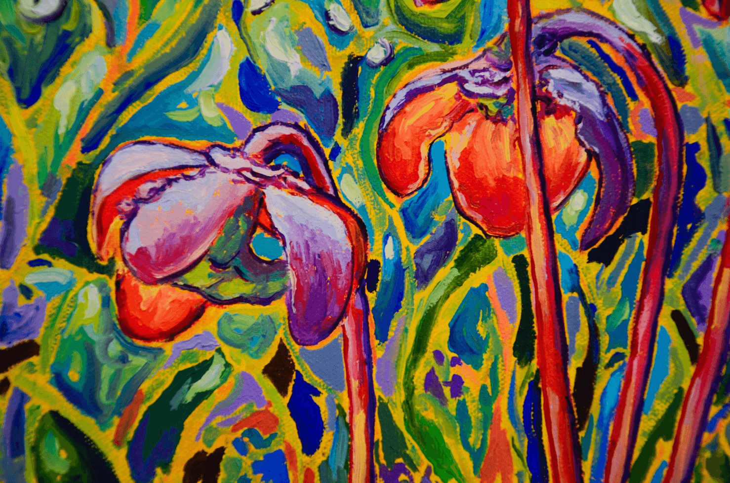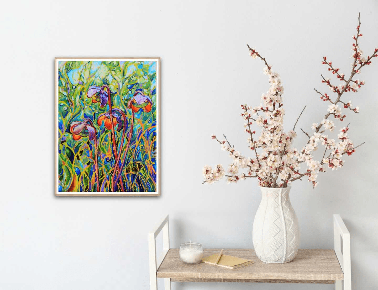 This is a painting of one of the most beautiful, strange and unique flowers to ever catch my attention during my summer hikes in Newfoundland. With its unusual shape and vivid purple and red tones, the Pitcher Plant already looks like the type of flora you don't want to be messing around with. So it comes to no surprise that it is a carnivorous plant, feasting on bugs and insects. Adding more to its menacing and savage charm, it has been chosen as the emblem and official flower of the province of Newfoundland and Labrador, making it the most unusual of Canada's official flowers. In my humble opinion, it deserves all the recognition it is getting. In this painting, the background shapes perfectly complement and mimic the shape of the plant, while the vivid blues and greens accentuate the colors of its petals. This is a painting that has a very special place in my heart.