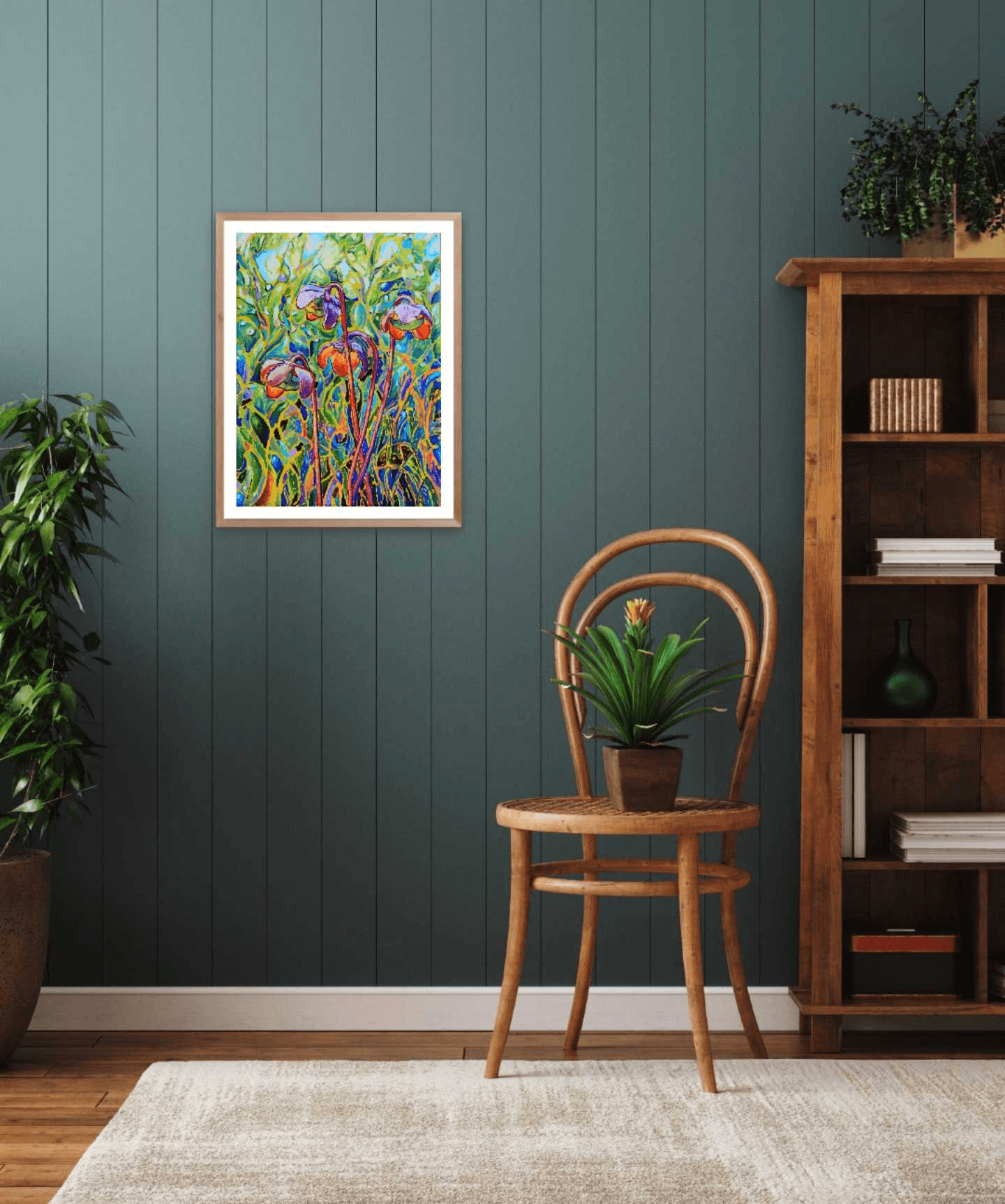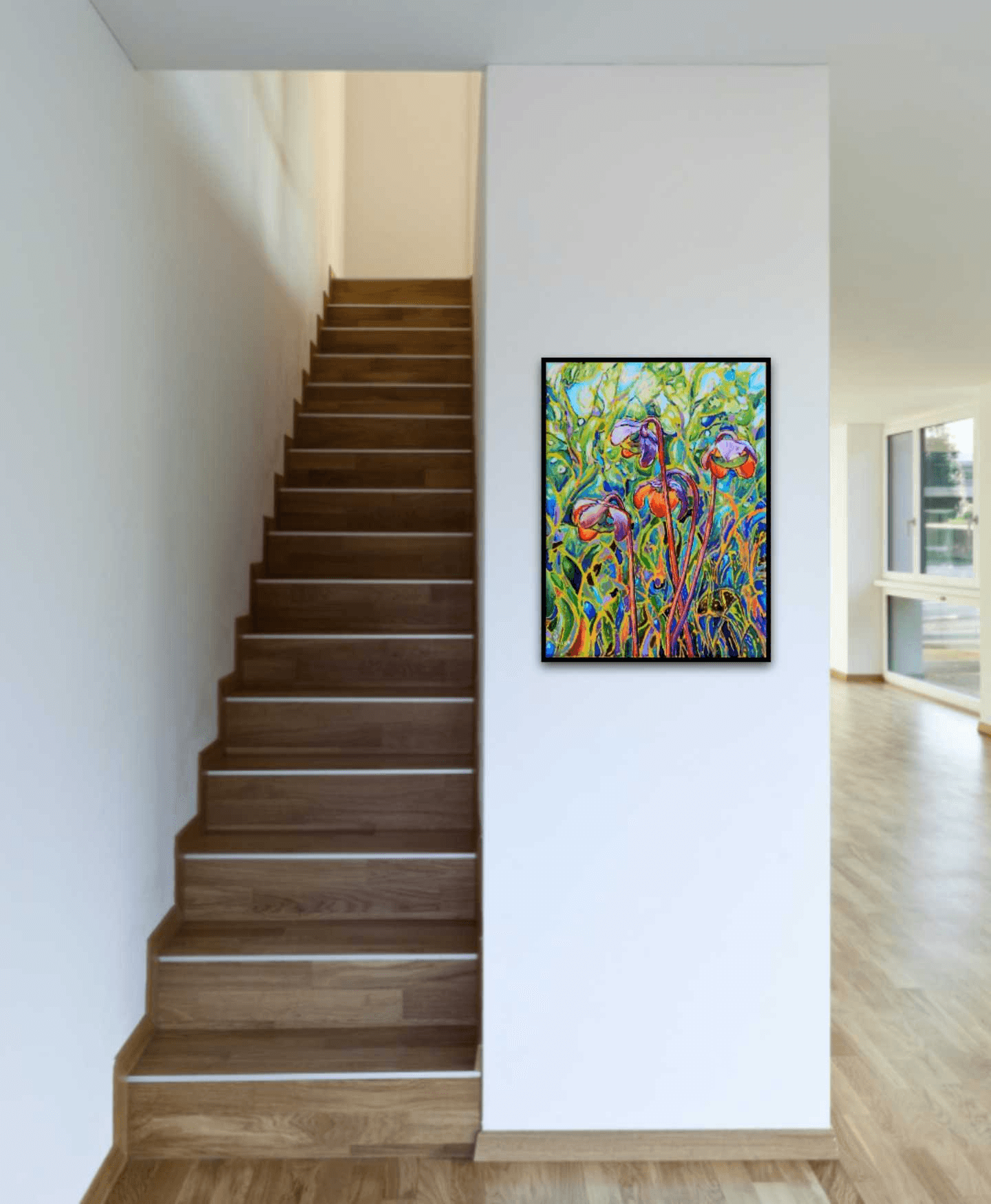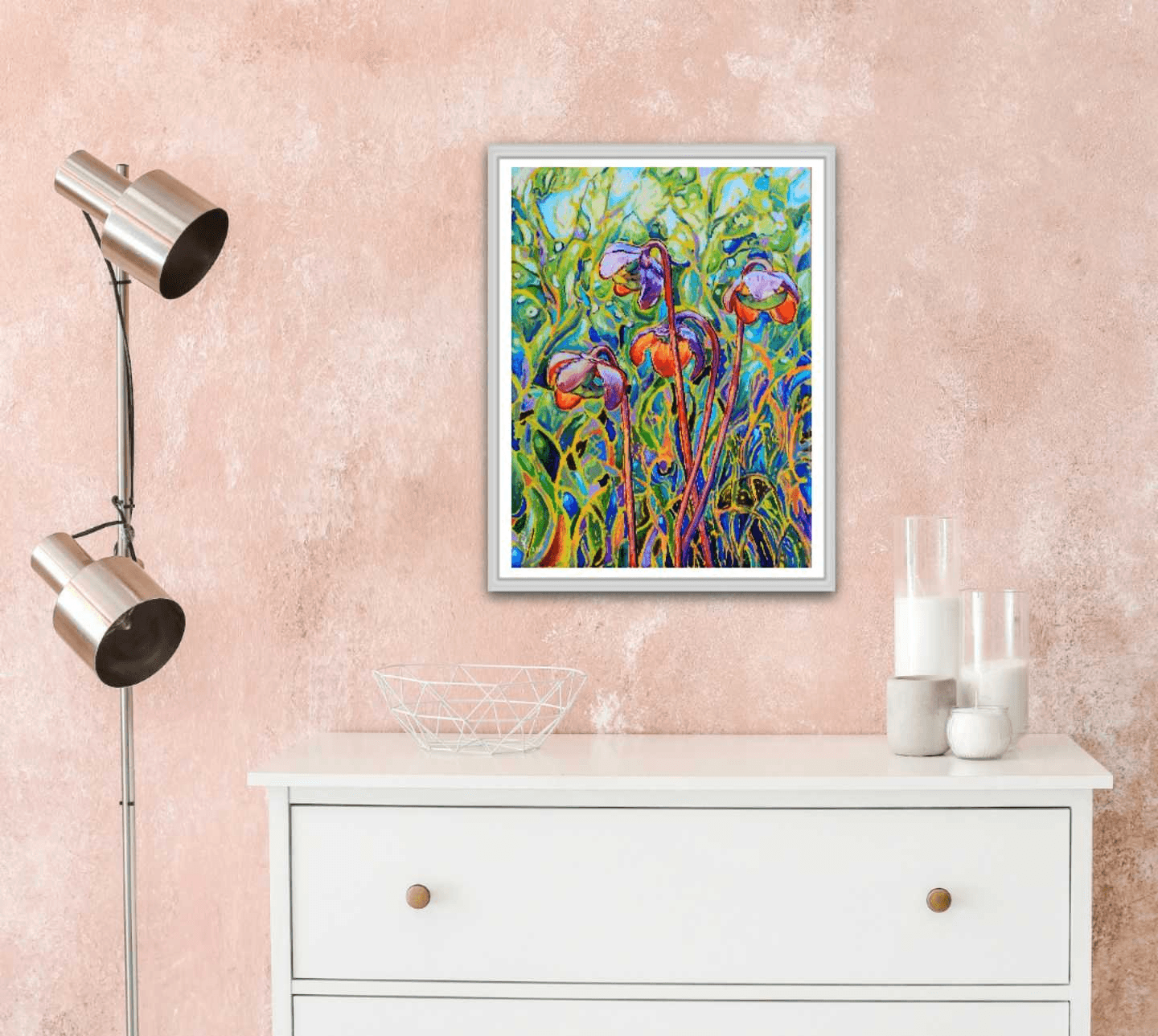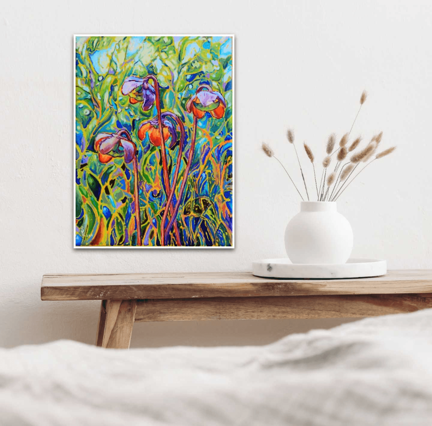 This is a painting of one of the most beautiful, strange and unique flowers to ever catch my attention during my summer hikes in Newfoundland. With its unusual shape and vivid purple and red tones, the Pitcher Plant already looks like the type of flora you don't want to be messing around with. So it comes to no surprise that it is a carnivorous plant, feasting on bugs and insects. Adding more to its menacing and savage charm, it has been chosen as the emblem and official flower of the province of Newfoundland and Labrador, making it the most unusual of Canada's official flowers. In my humble opinion, it deserves all the recognition it is getting. In this painting, the background shapes perfectly complement and mimic the shape of the plant, while the vivid blues and greens accentuate the colors of its petals. This is a painting that has a very special place in my heart.