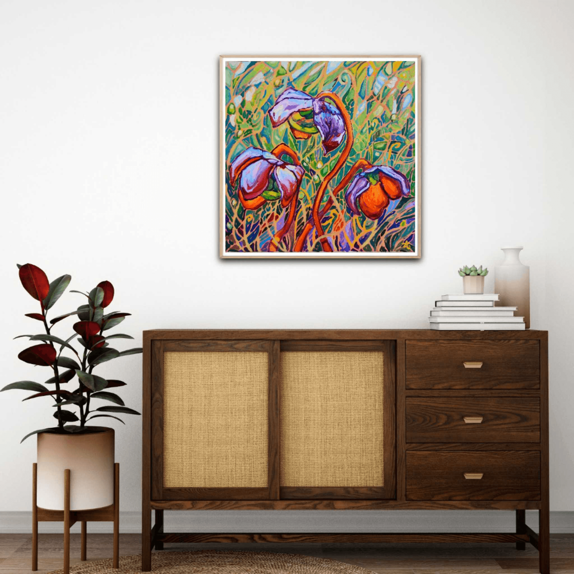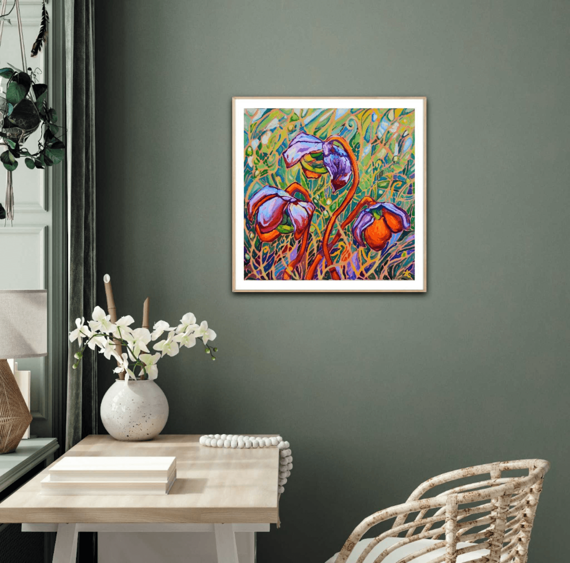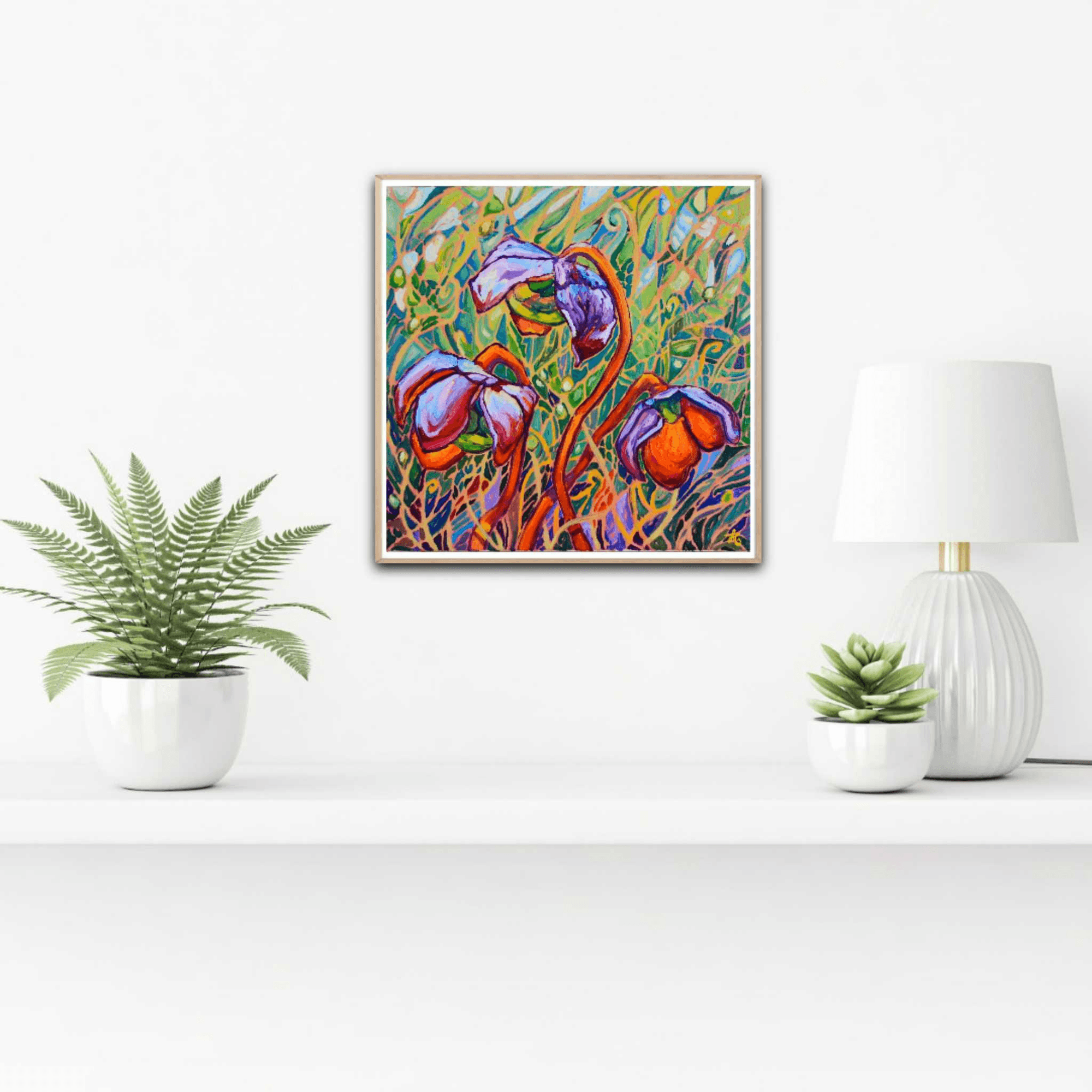 This is my third painting of Pitcher Plants and I can honestly say, it is definitely not my last. This is the national flower of Newfoundland and I fell in love with its vivid colors and wildness from the first moment I spotted it during one of many hikes in Gros Morne, while visiting the province. It is definitely not the most delicate of flowers, given that it is carnivorous, but to me, that only adds to its fascinating charm.