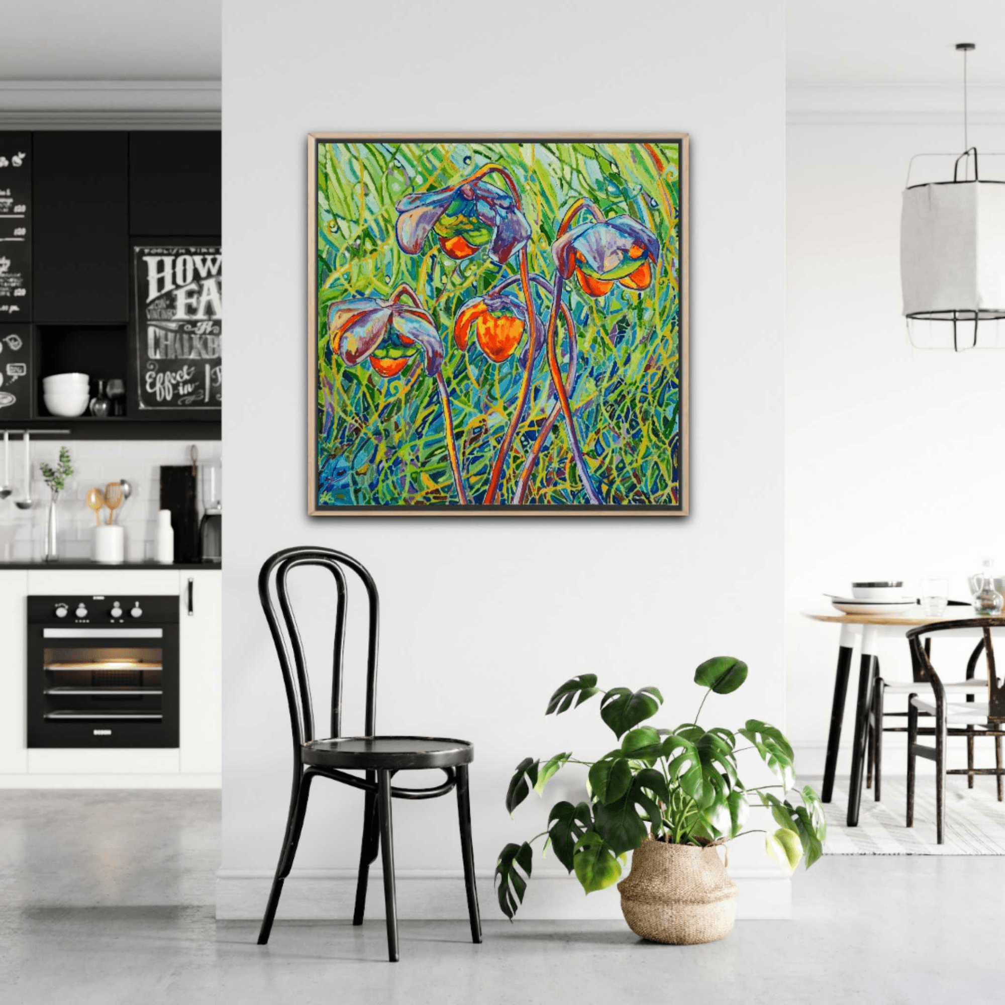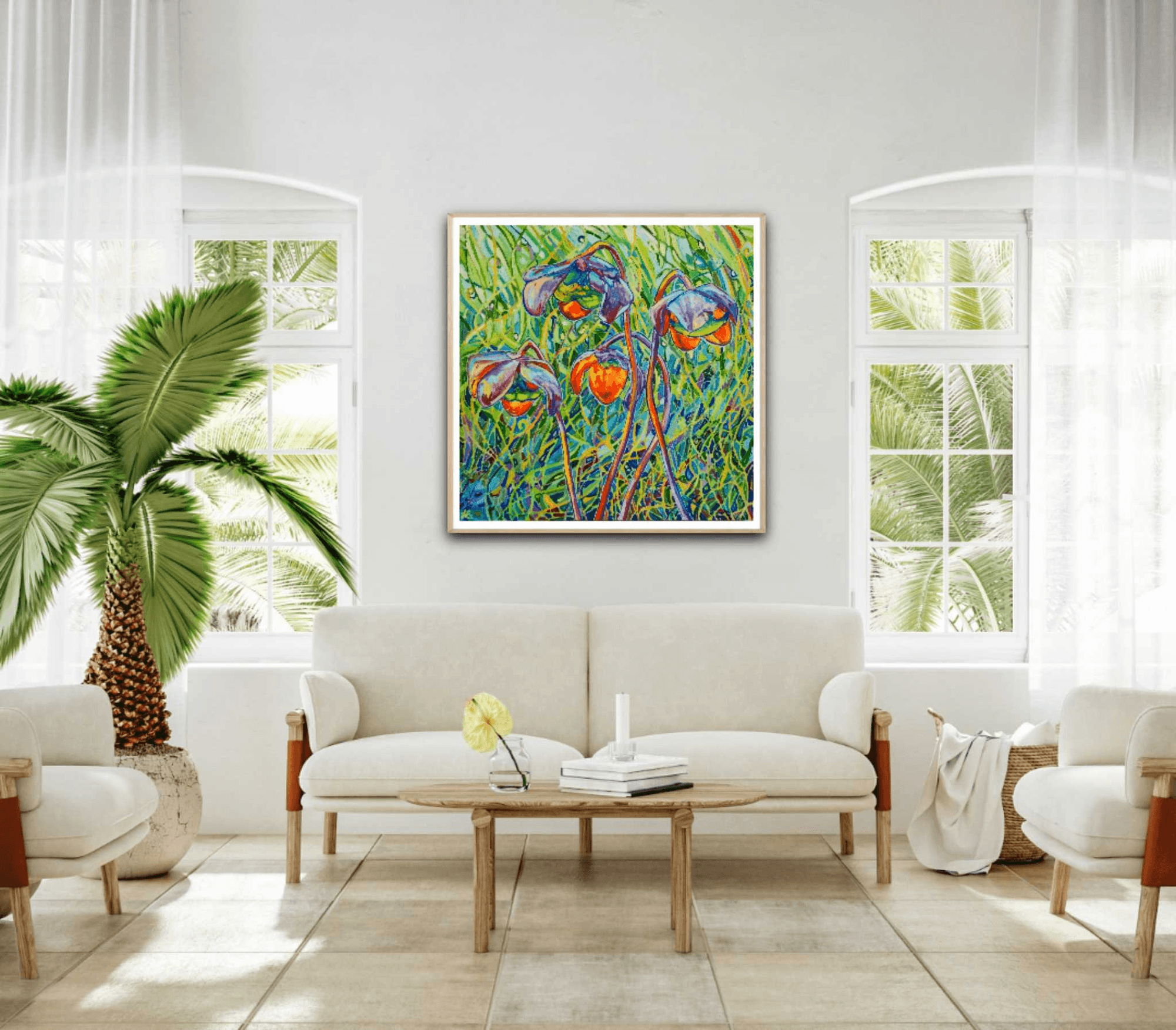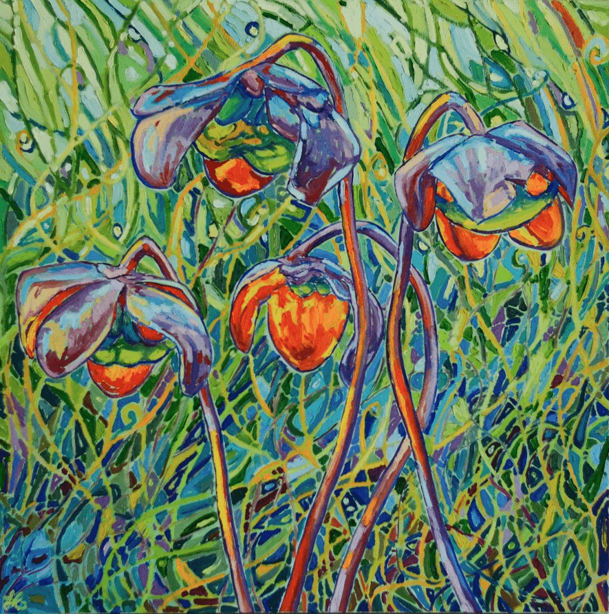 A beautiful collection of pitcher plants glowing against a vibrant, green background. The bright, striking flowers in their crimson color are enhanced by the lush foliage behind them. The light pierces through the shrubs and illuminates their petals. The elegant lines add movement and energy to the painting, bringing more life to a scene that is already alive and breathing.