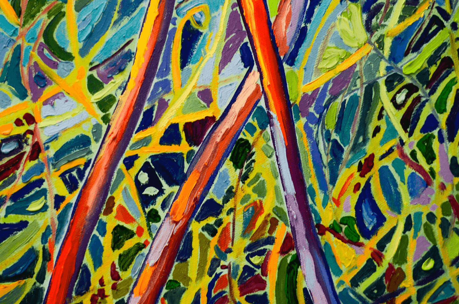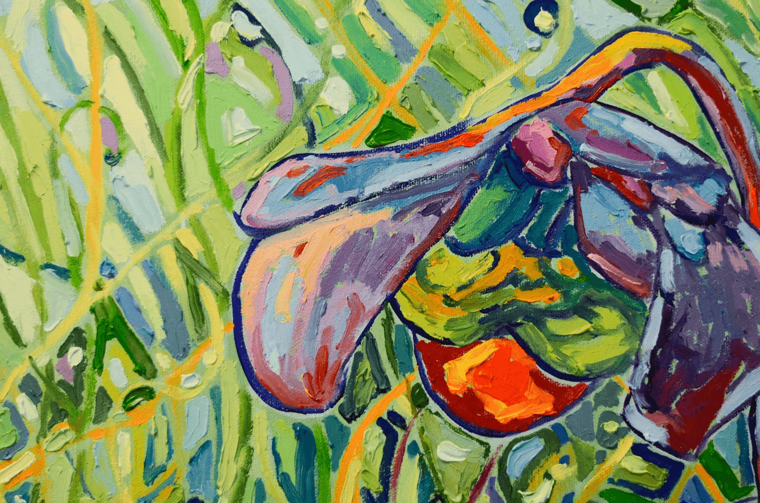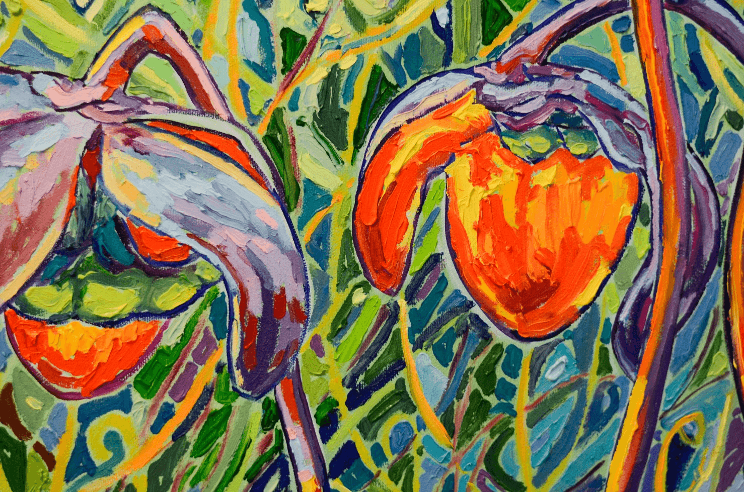 A beautiful collection of pitcher plants glowing against a vibrant, green background. The bright, striking flowers in their crimson color are enhanced by the lush foliage behind them. The light pierces through the shrubs and illuminates their petals. The elegant lines add movement and energy to the painting, bringing more life to a scene that is already alive and breathing.