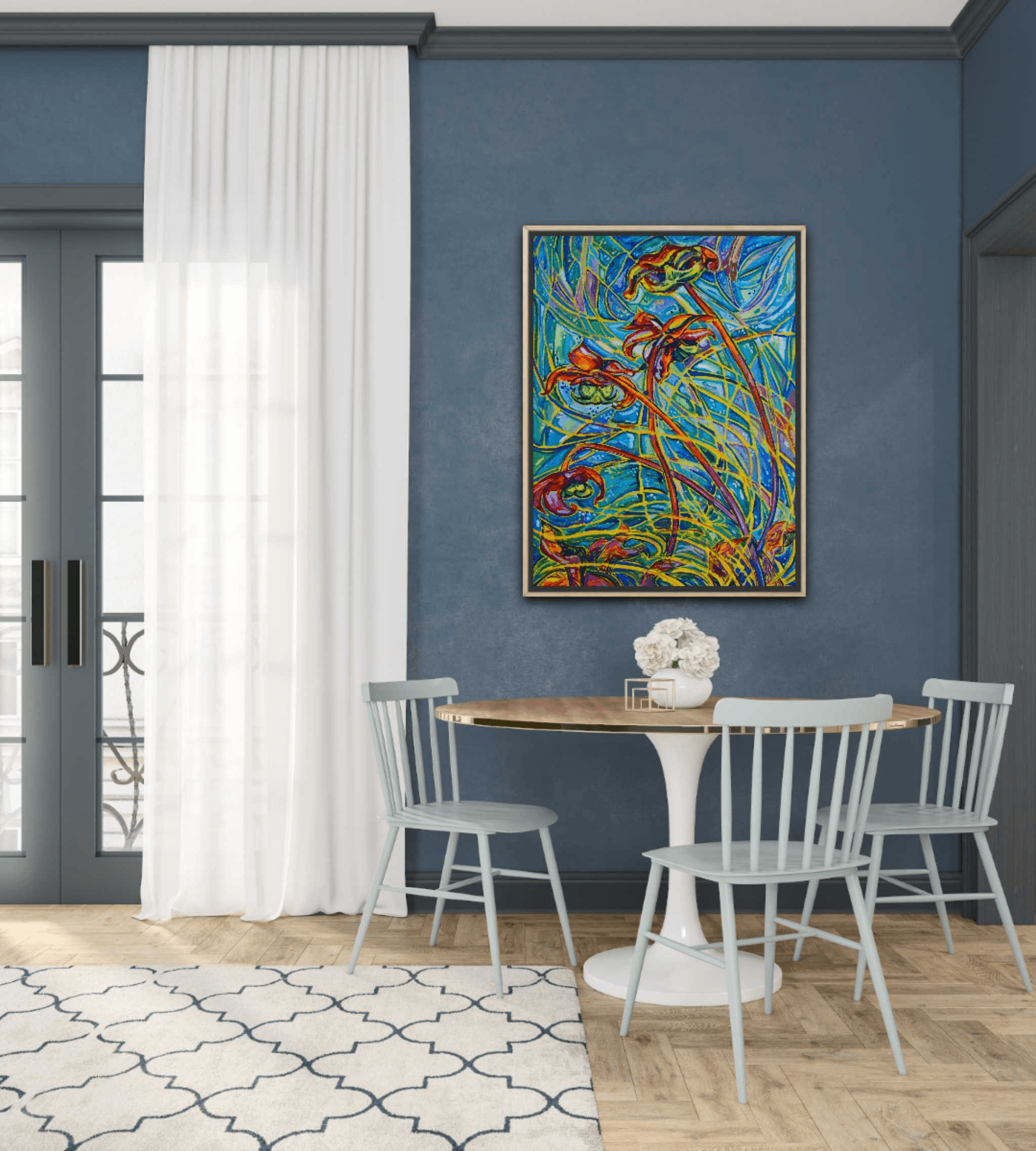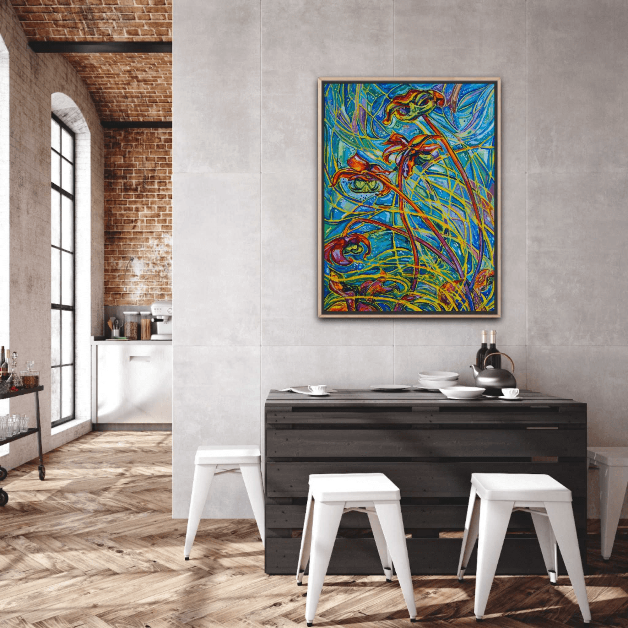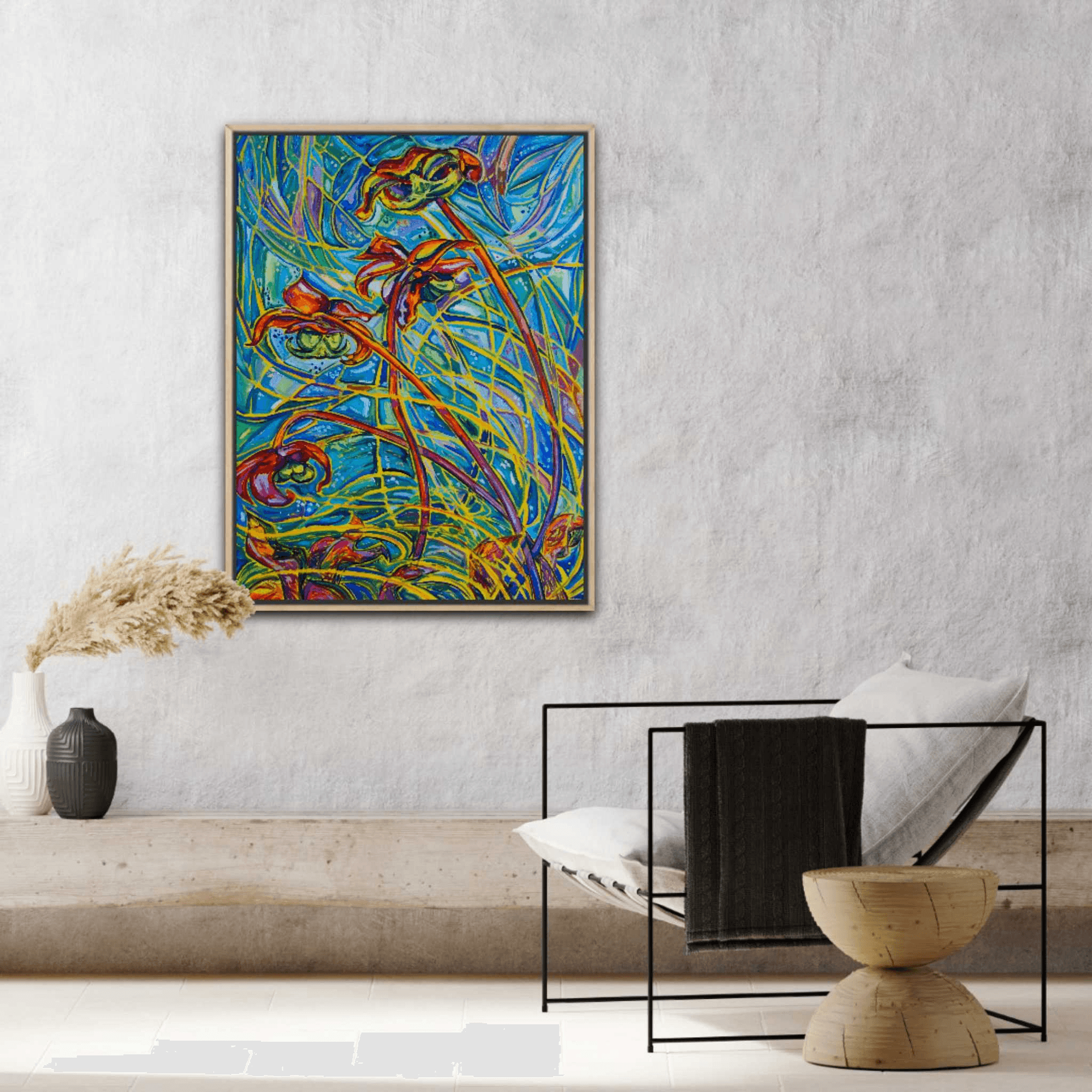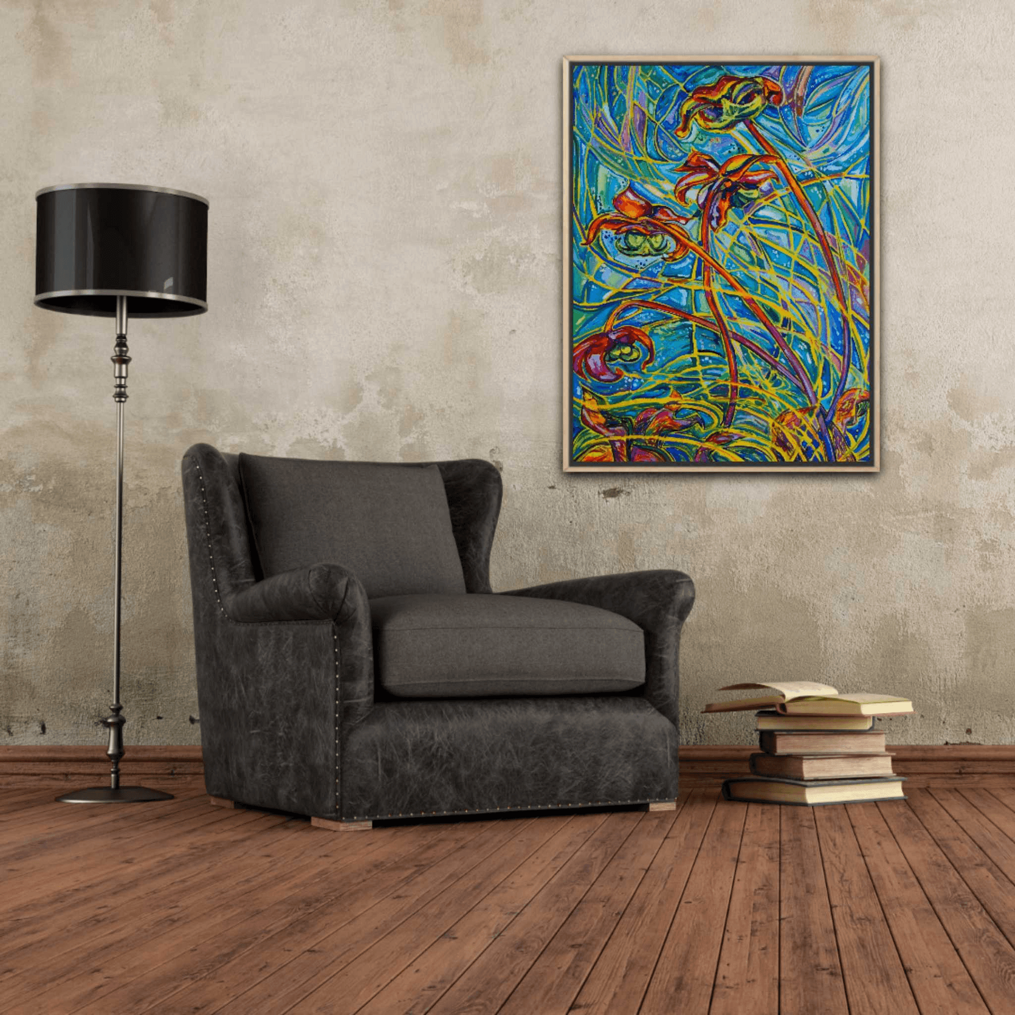 A beautiful collection of pitcher plants glowing against a vibrant and vivid background. The bright red flowers are engulfed in a beautiful surrounding of movement, light and shadows. The background in this painting is as alive as the main subject, adding life and energy to the whole ensemble.