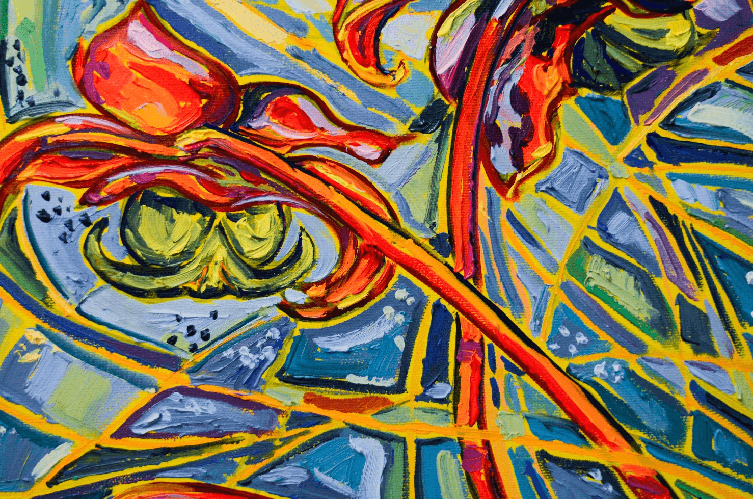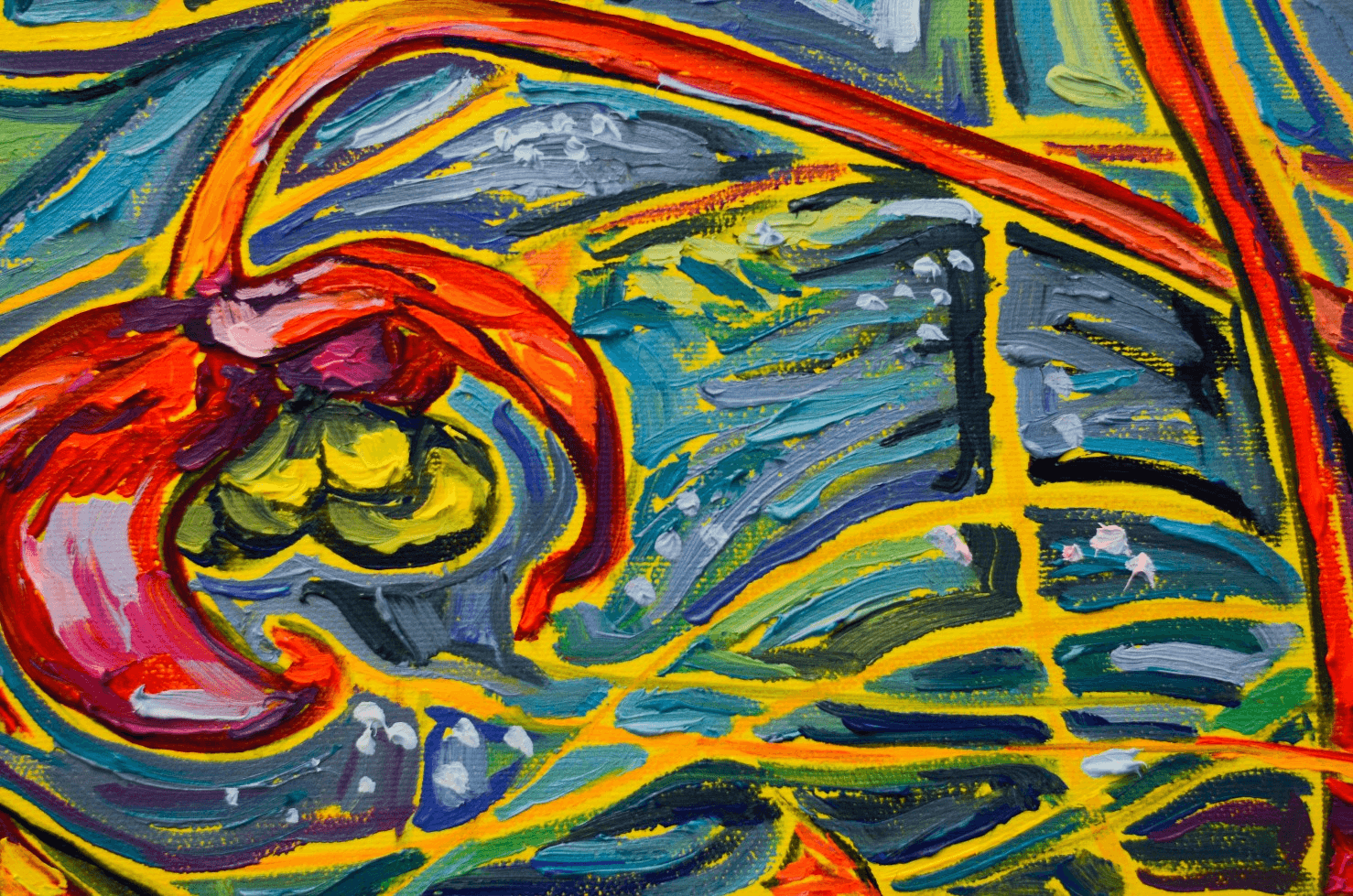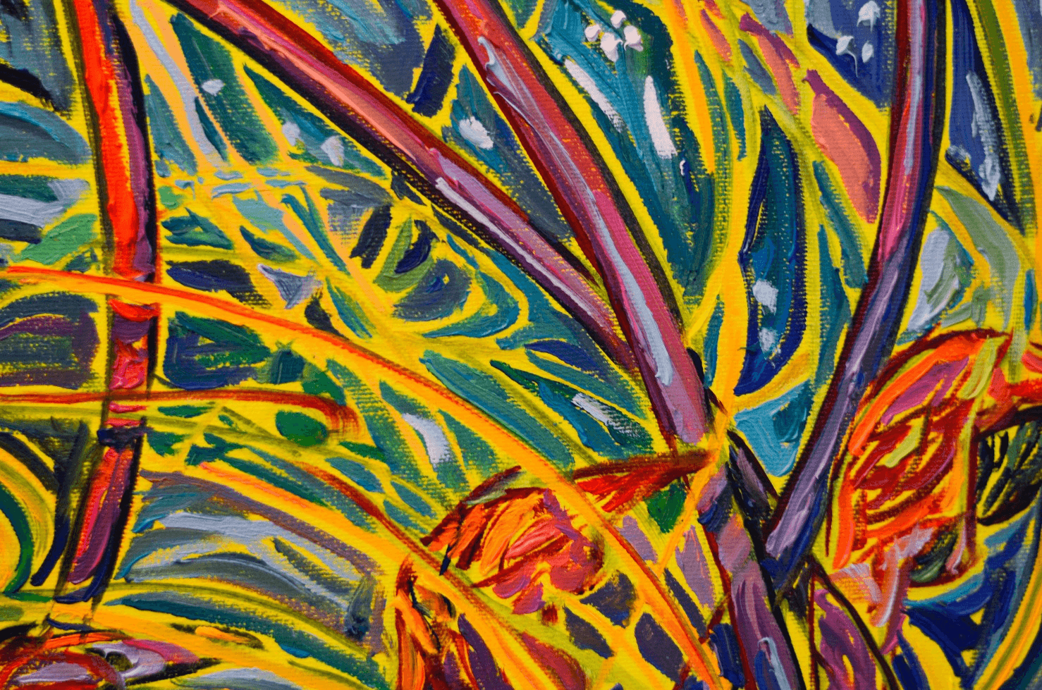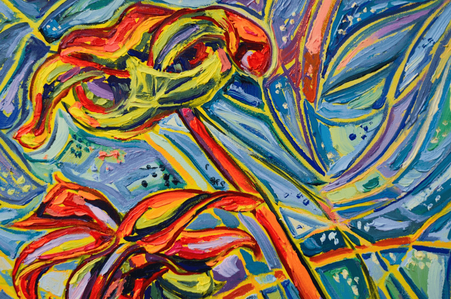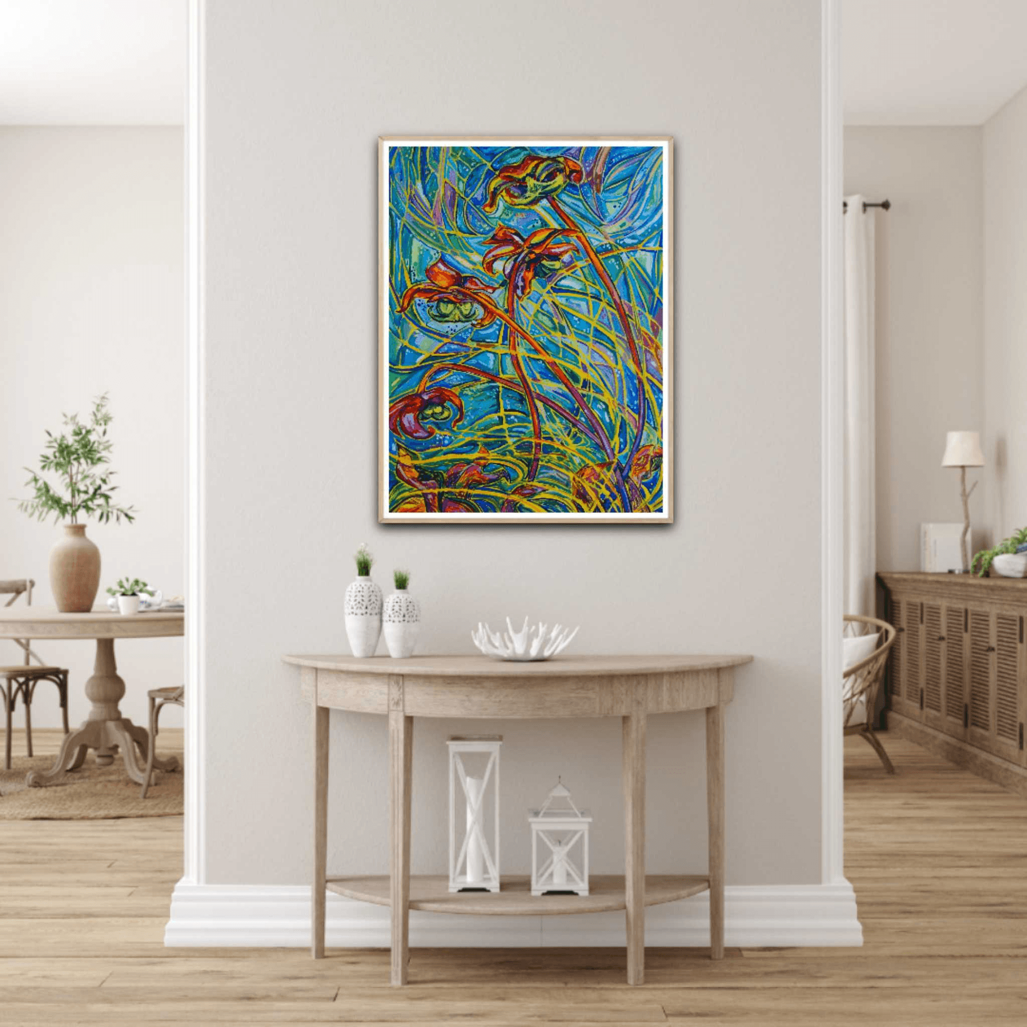 A beautiful collection of pitcher plants glowing against a vibrant and vivid background. The bright red flowers are engulfed in a beautiful surrounding of movement, light and shadows. The background in this painting is as alive as the main subject, adding life and energy to the whole ensemble.