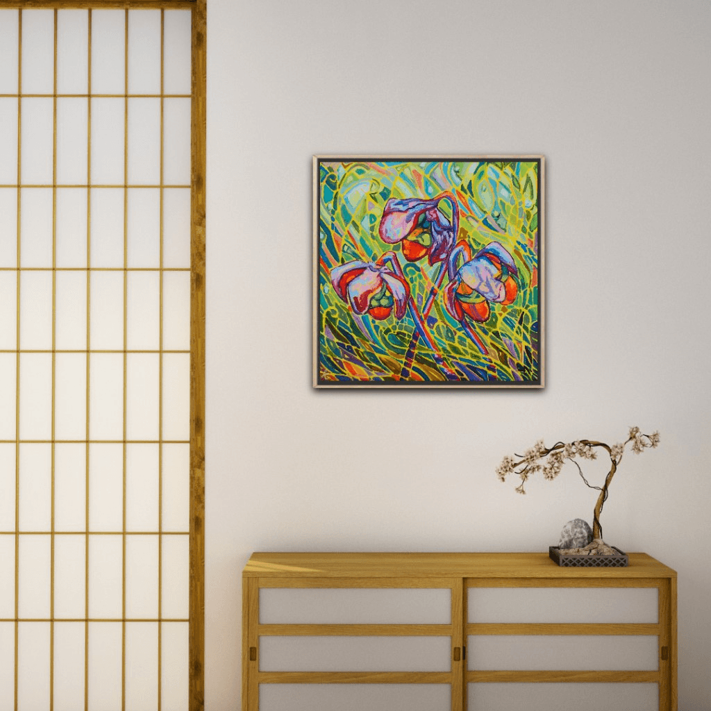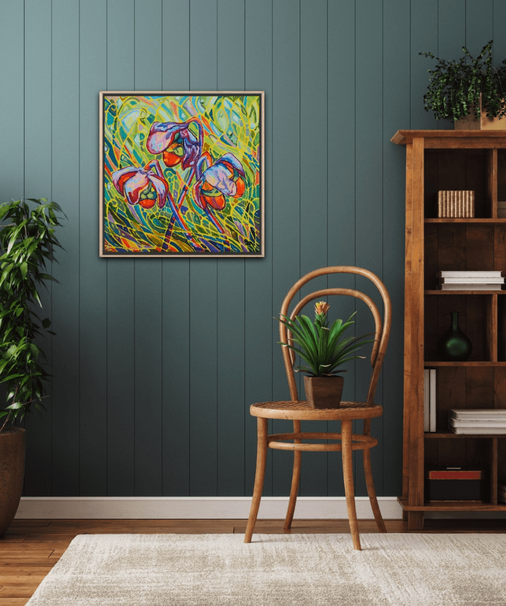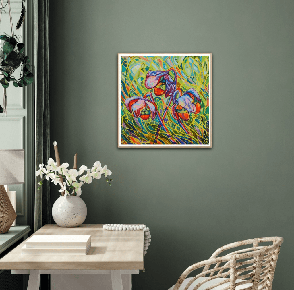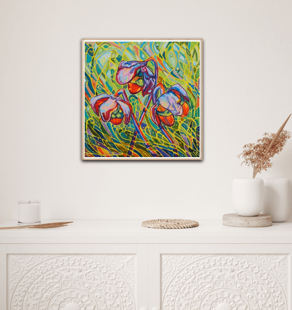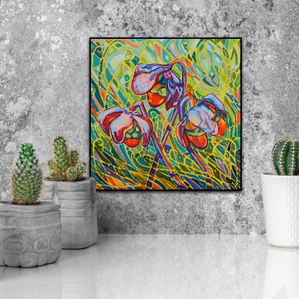 A beautiful collection of pitcher plants glowing against a vibrant and vivid background. The bright red flowers are engulfed in a beautiful surrounding of movement, light and shadows. The bold and thick brushstrokes add life and energy, bringing the eye closer and closer to the painting.