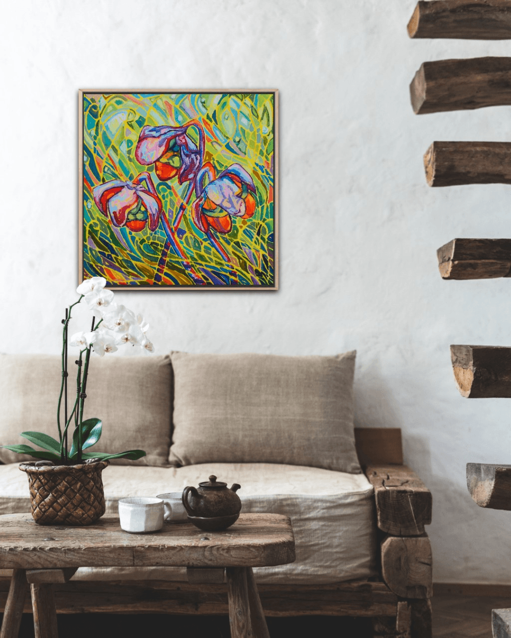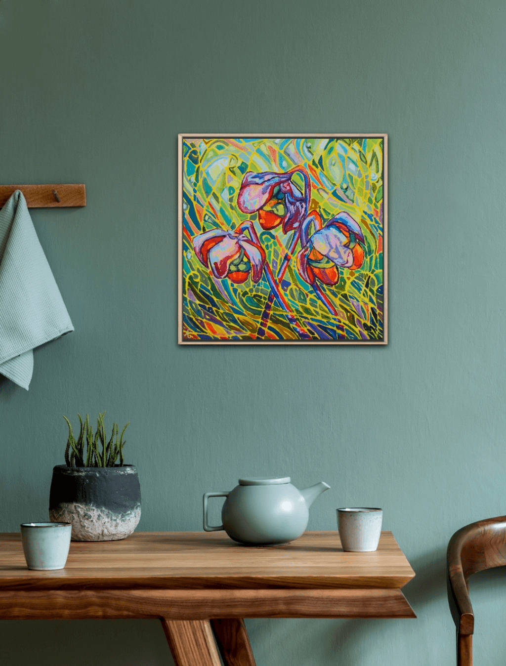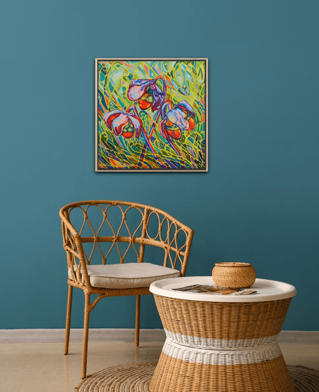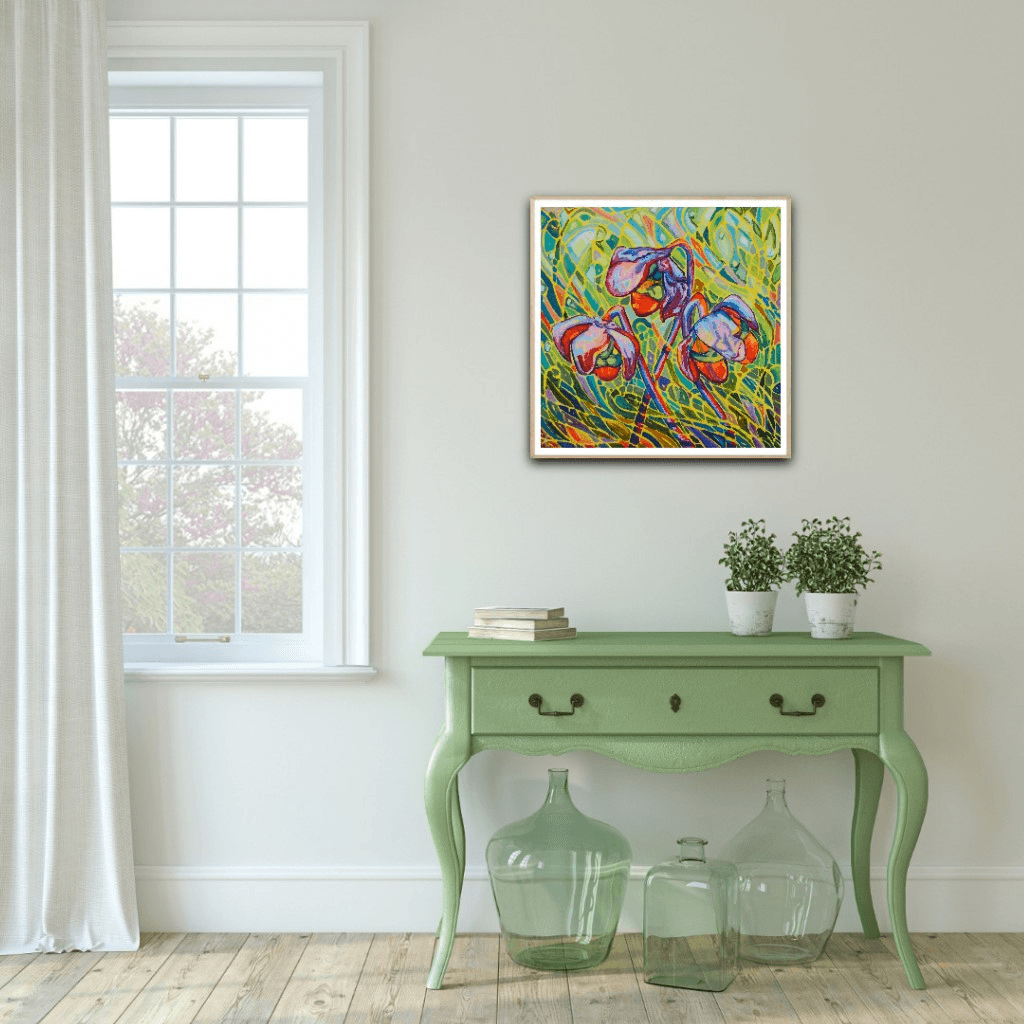 A beautiful collection of pitcher plants glowing against a vibrant and vivid background. The bright red flowers are engulfed in a beautiful surrounding of movement, light and shadows. The bold and thick brushstrokes add life and energy, bringing the eye closer and closer to the painting.