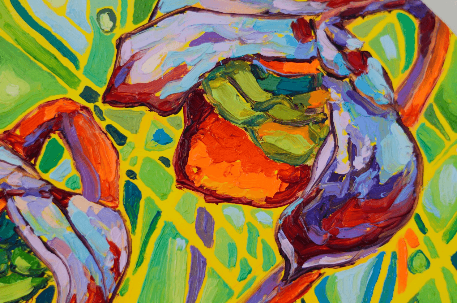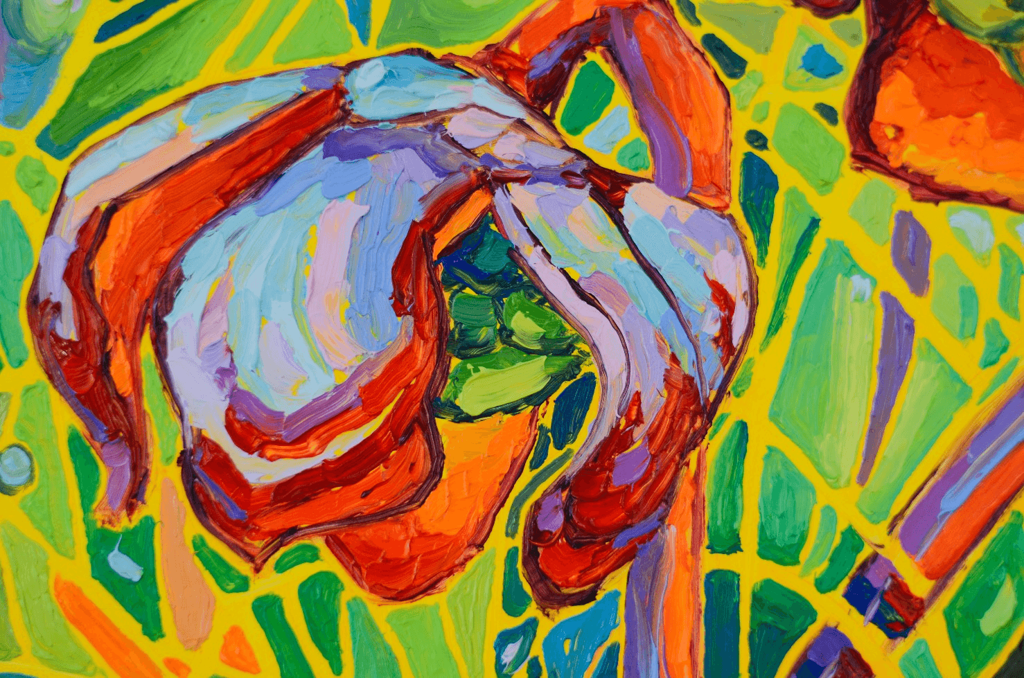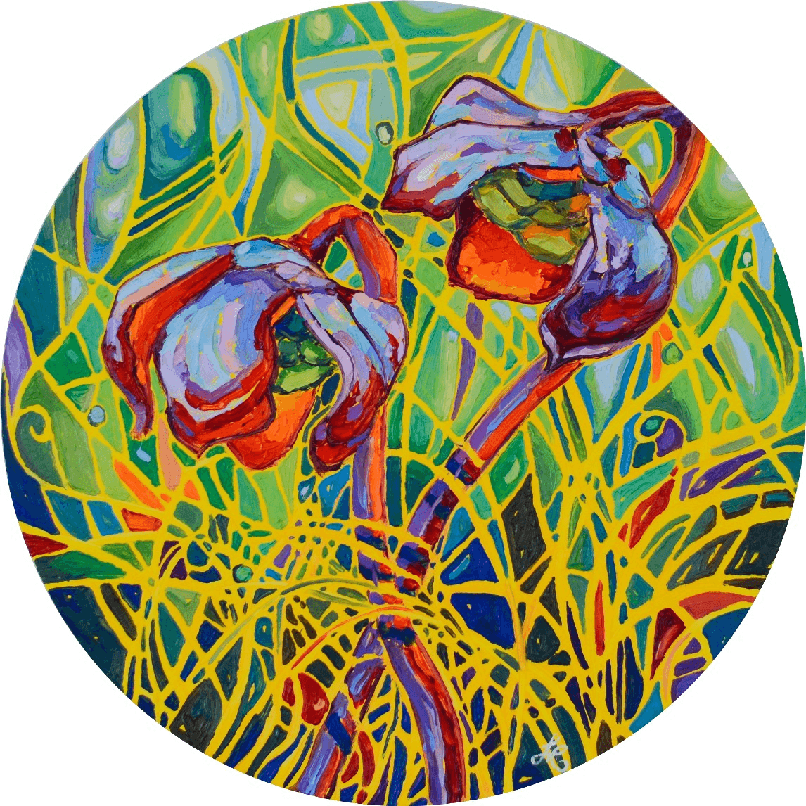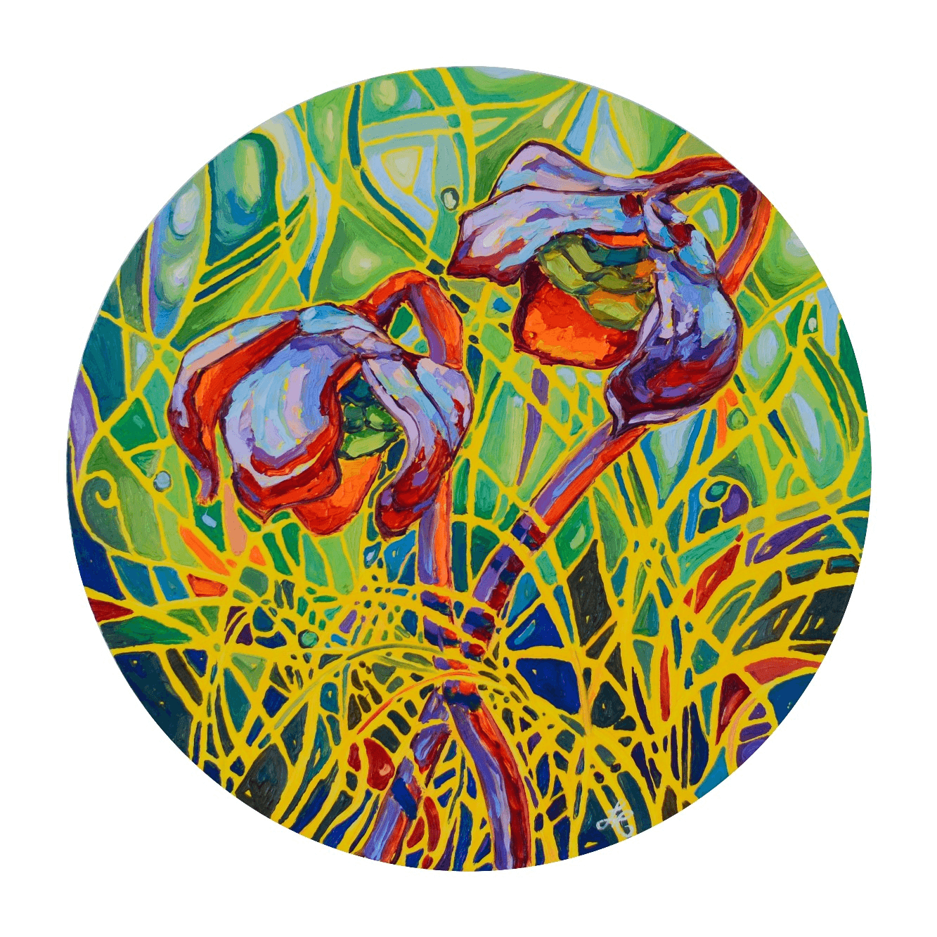 Another beautiful collection of pitcher plants glowing against a vibrant and vivid background. The bright red flowers are engulfed in a beautiful atmosphere of movement, light and shadows. The bold and thick brushstrokes add life and energy, bringing the eye closer and closer to the painting.