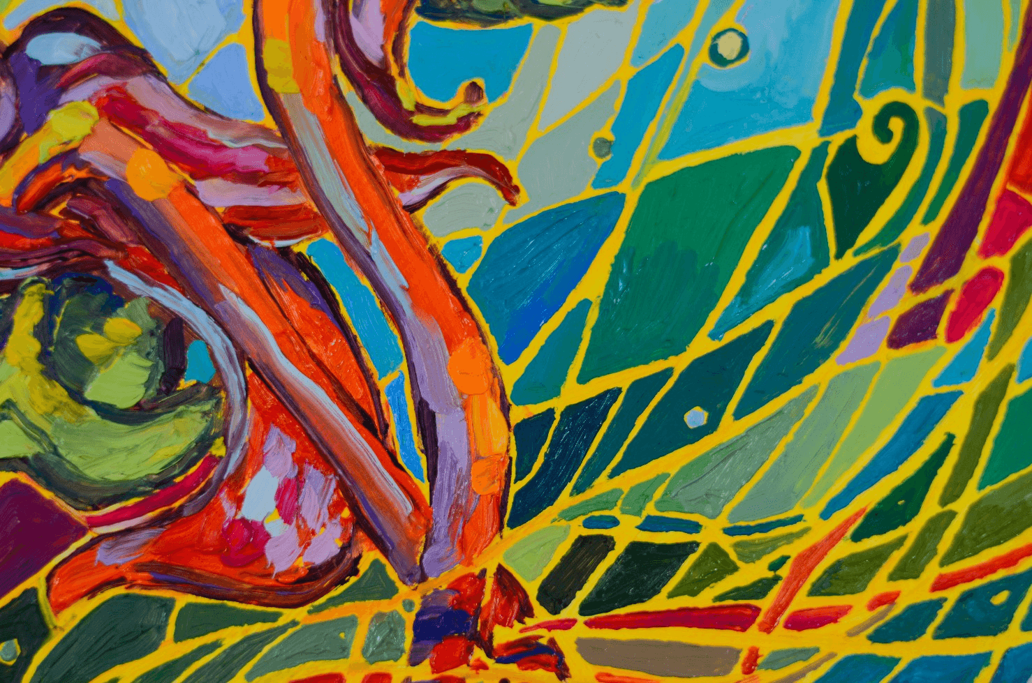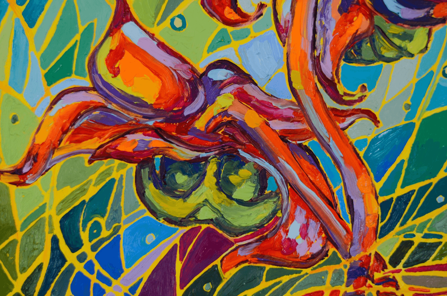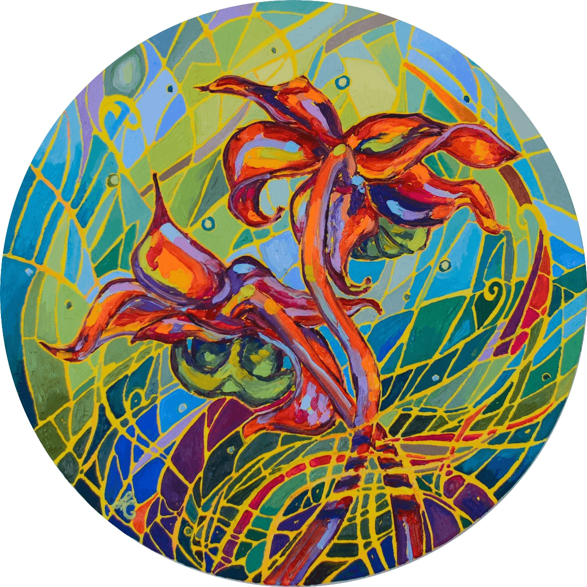 Another beautiful collection of pitcher plants glowing against a vibrant and vivid background. The bright red flowers are engulfed in a beautiful atmosphere of movement, light and shadows. The bold and thick brushstrokes add life and energy, bringing the eye closer and closer to the painting.
