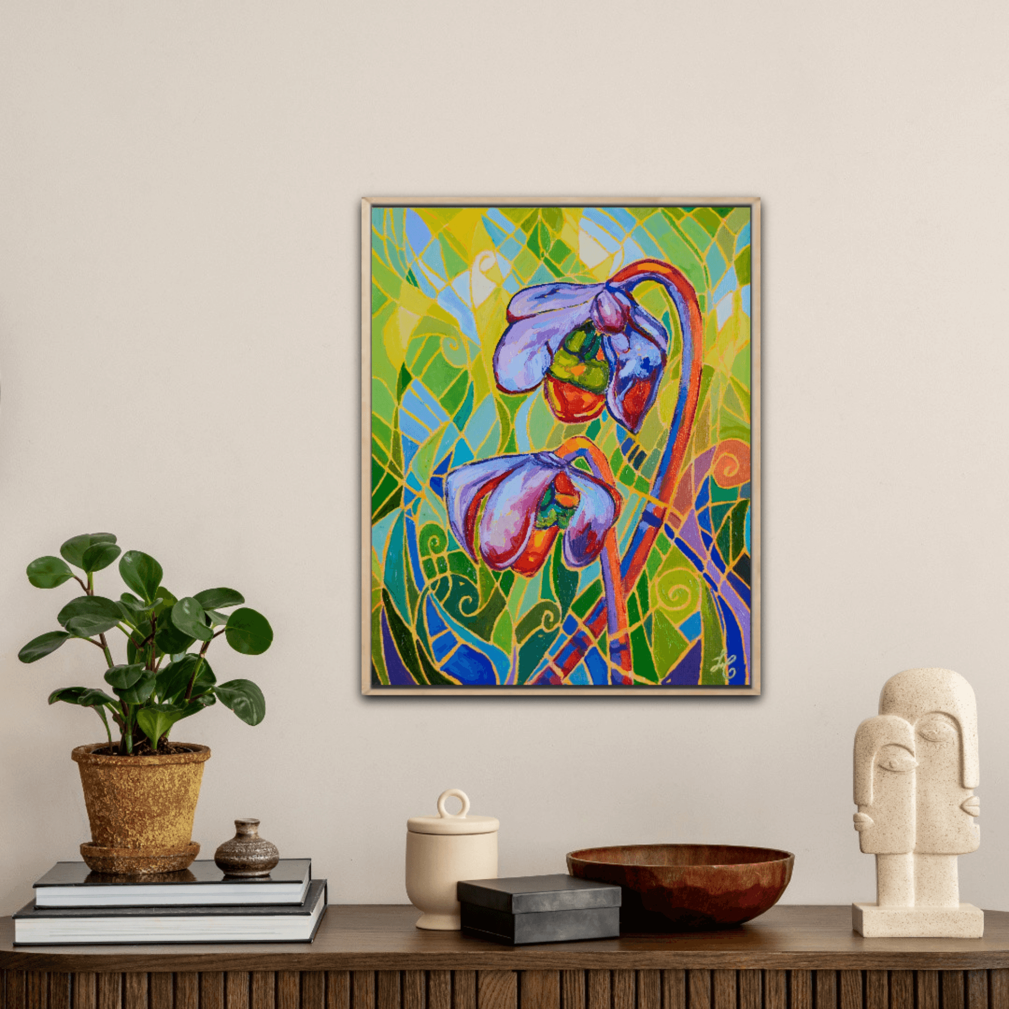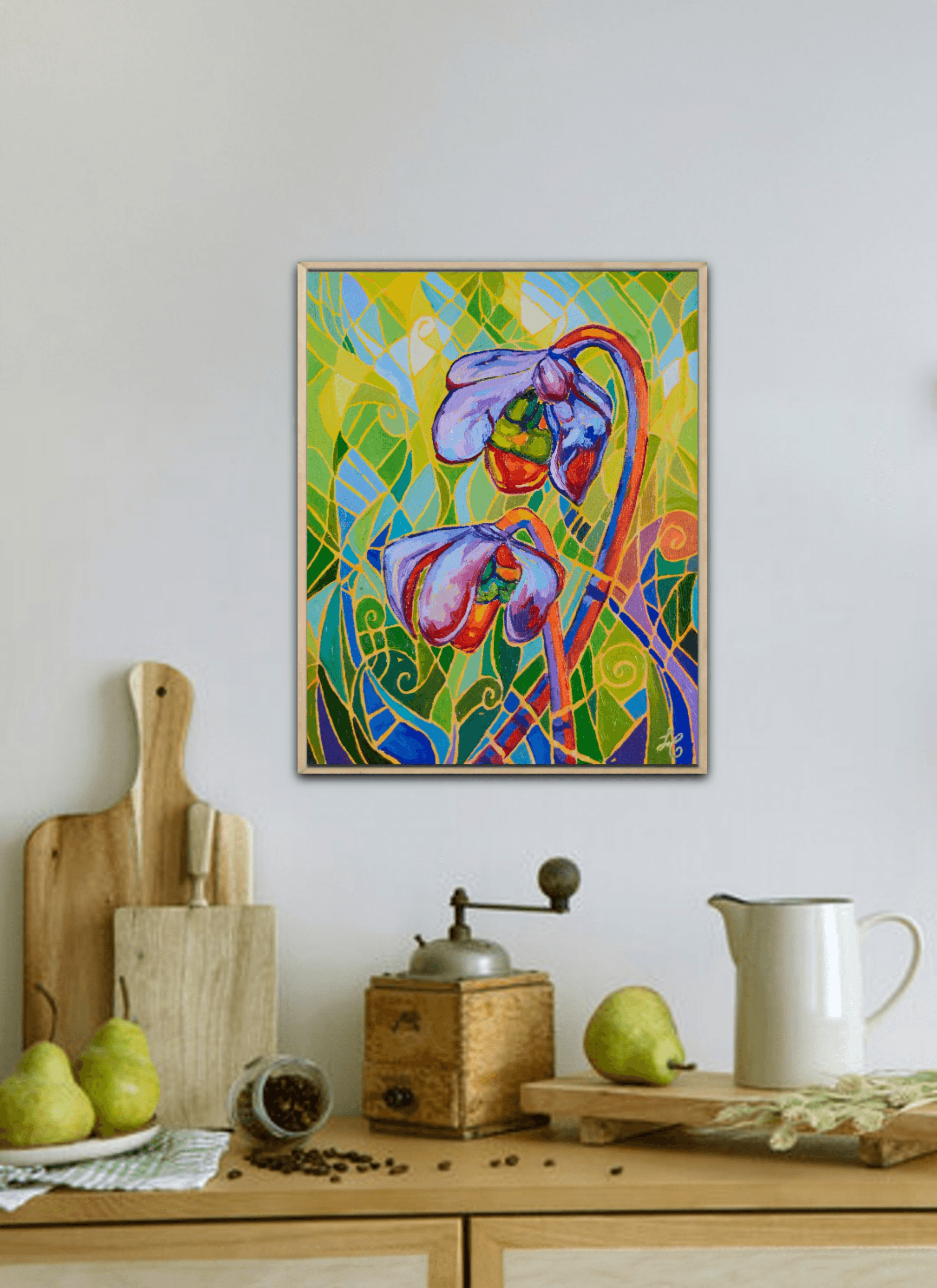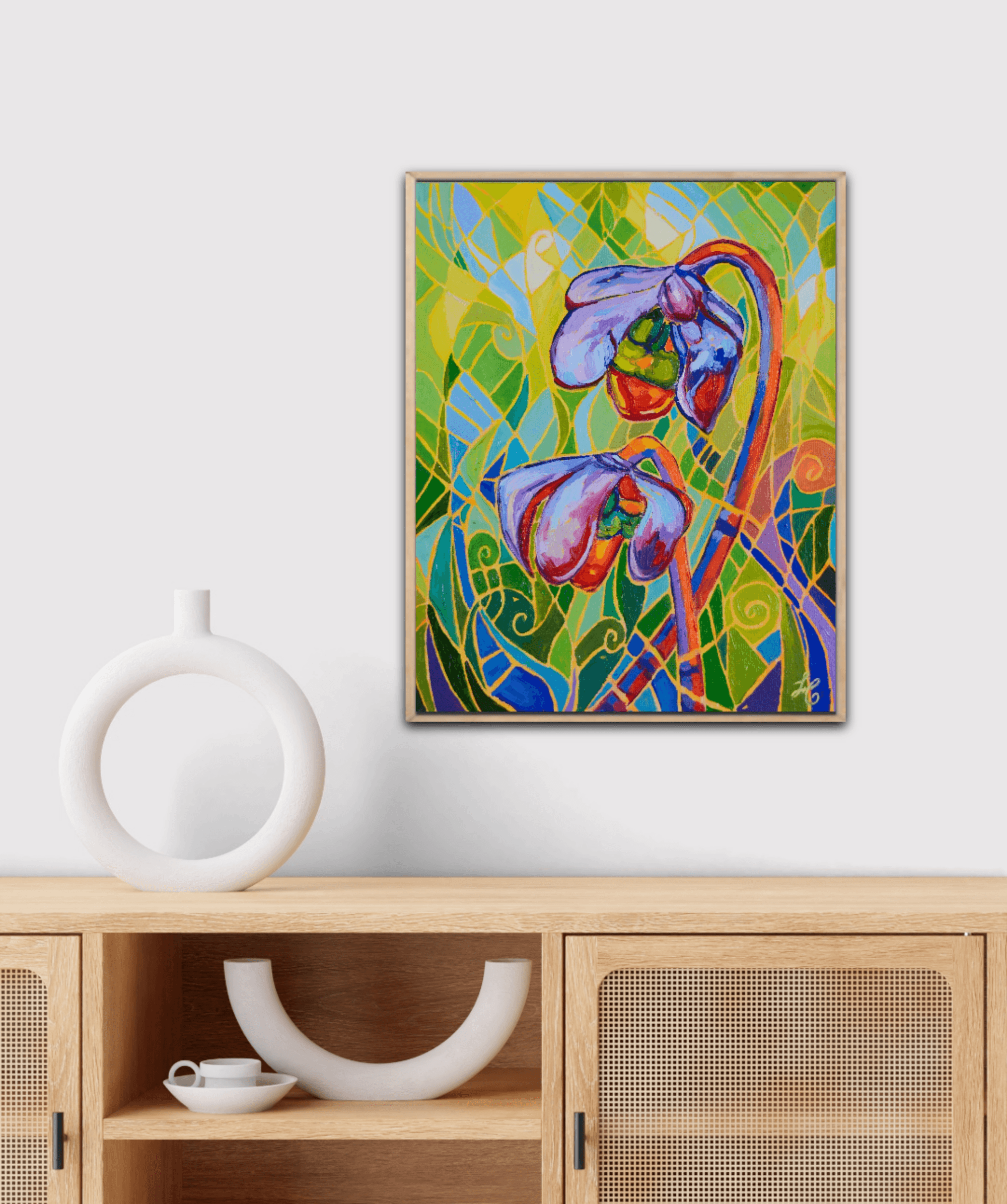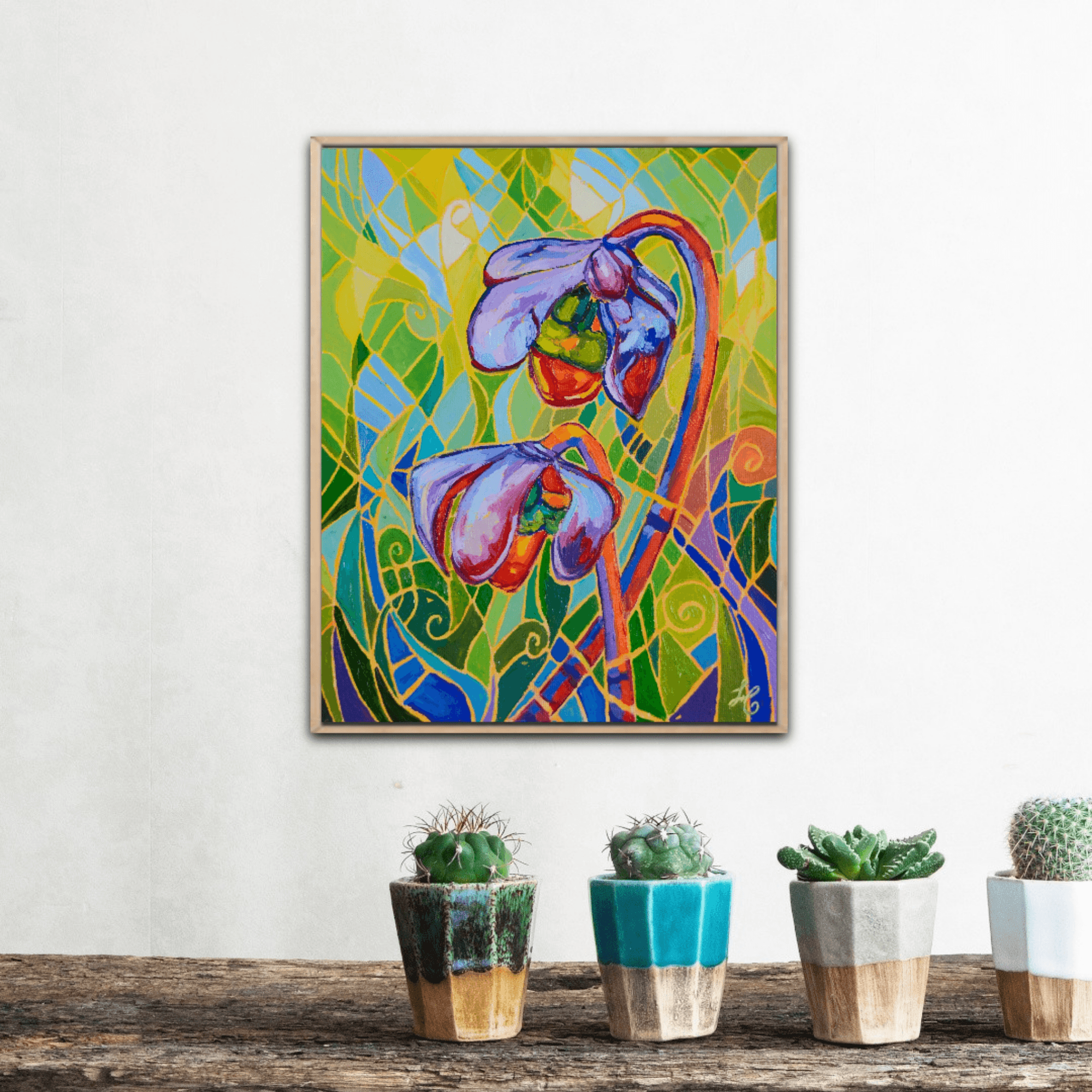 "PITCHER PLANT XX" portrays beautiful pitcher plants glowing against a vibrant and vivid background. The bright red flowers are engulfed in a beautiful surrounding of movement, light and shadows. The bold and thick brushstrokes add life and energy, bringing the eye closer and closer to the painting.