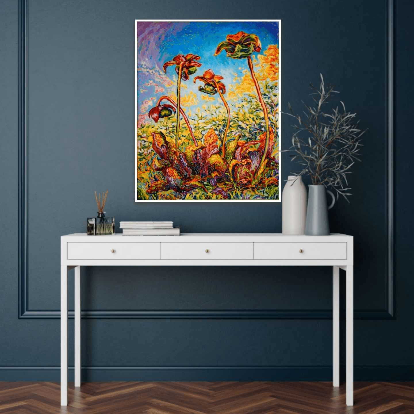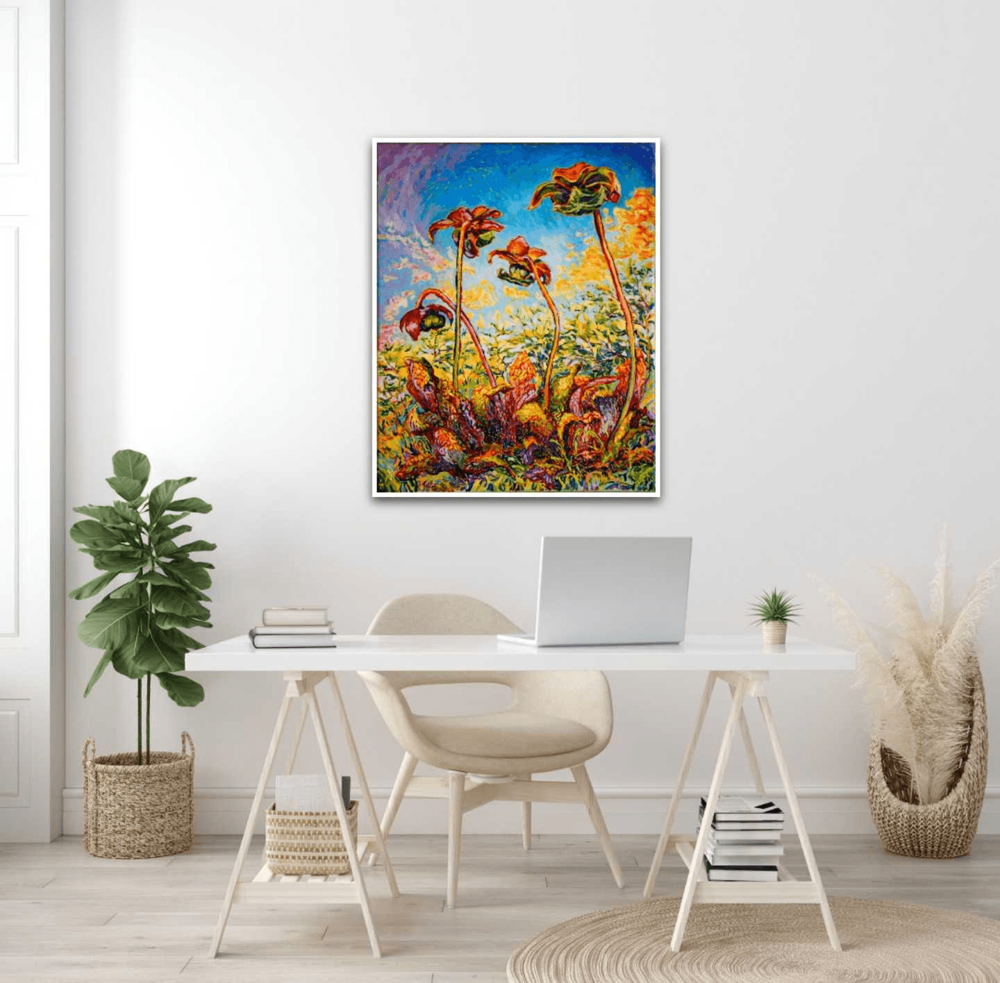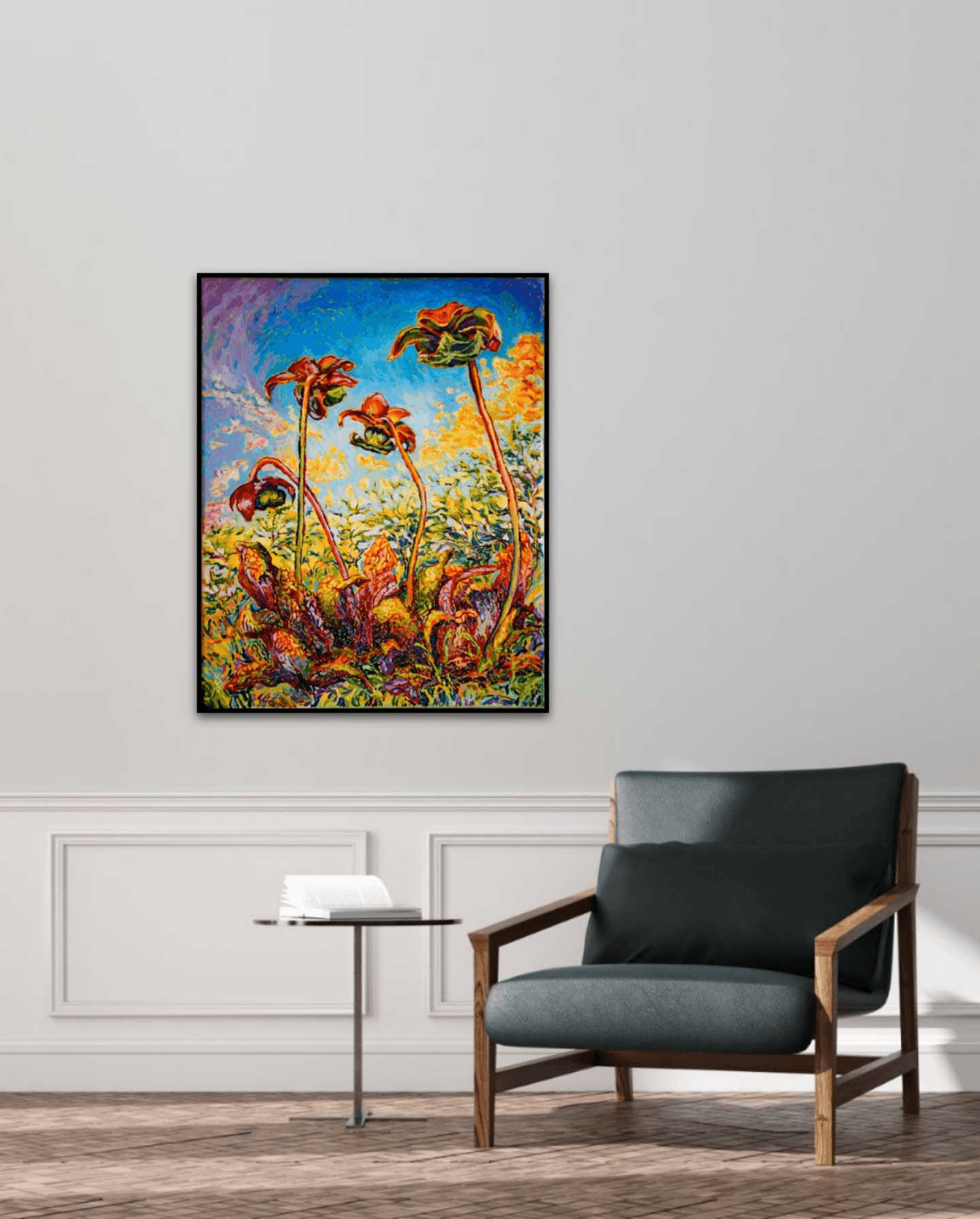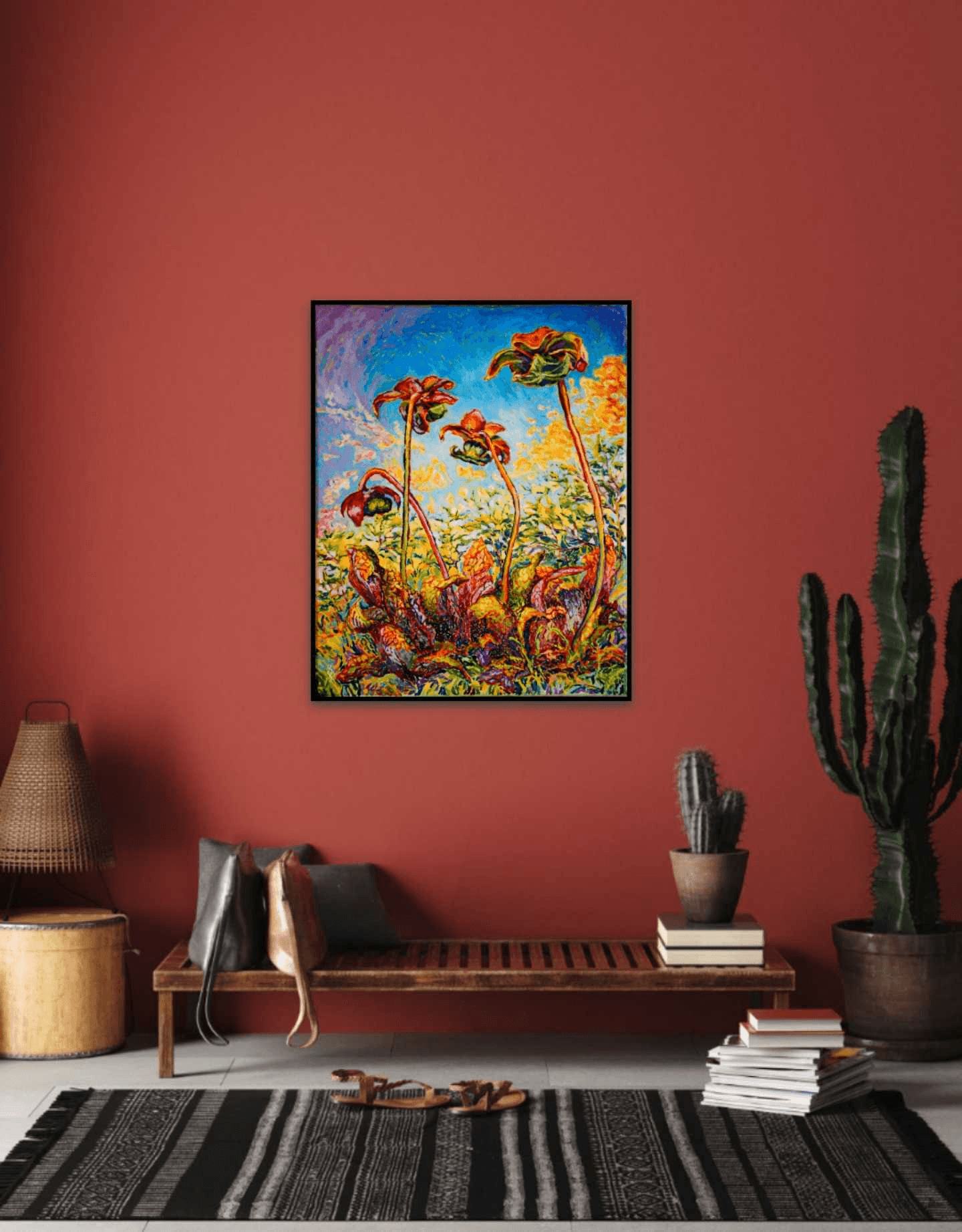 My second, and hopefully not last, painting of Pitcher Plants. The upward view brings beauty, majesty and elegance to these already glorious flowers. Their vivid red and greens are displayed against a lovely sky, while their stem descends all the way to the base to meet their curvy, twisting and colorful leaves, adding to their charm and character.