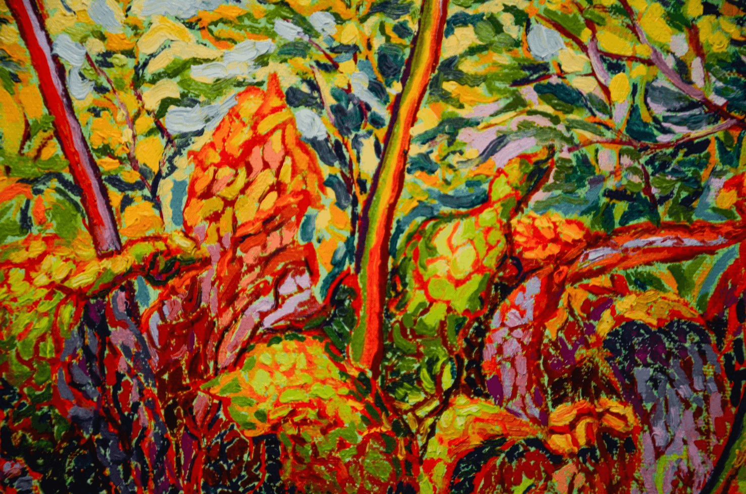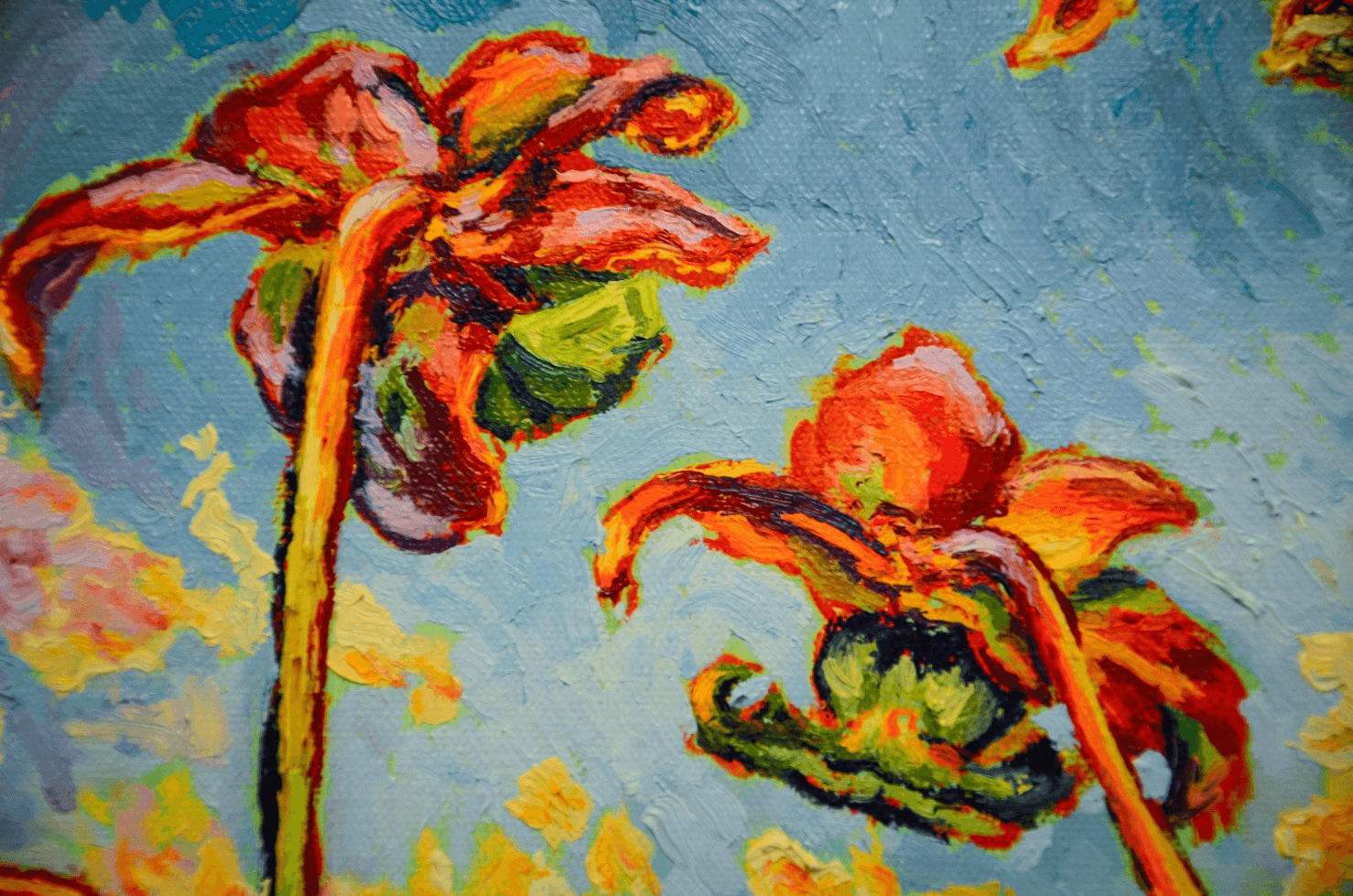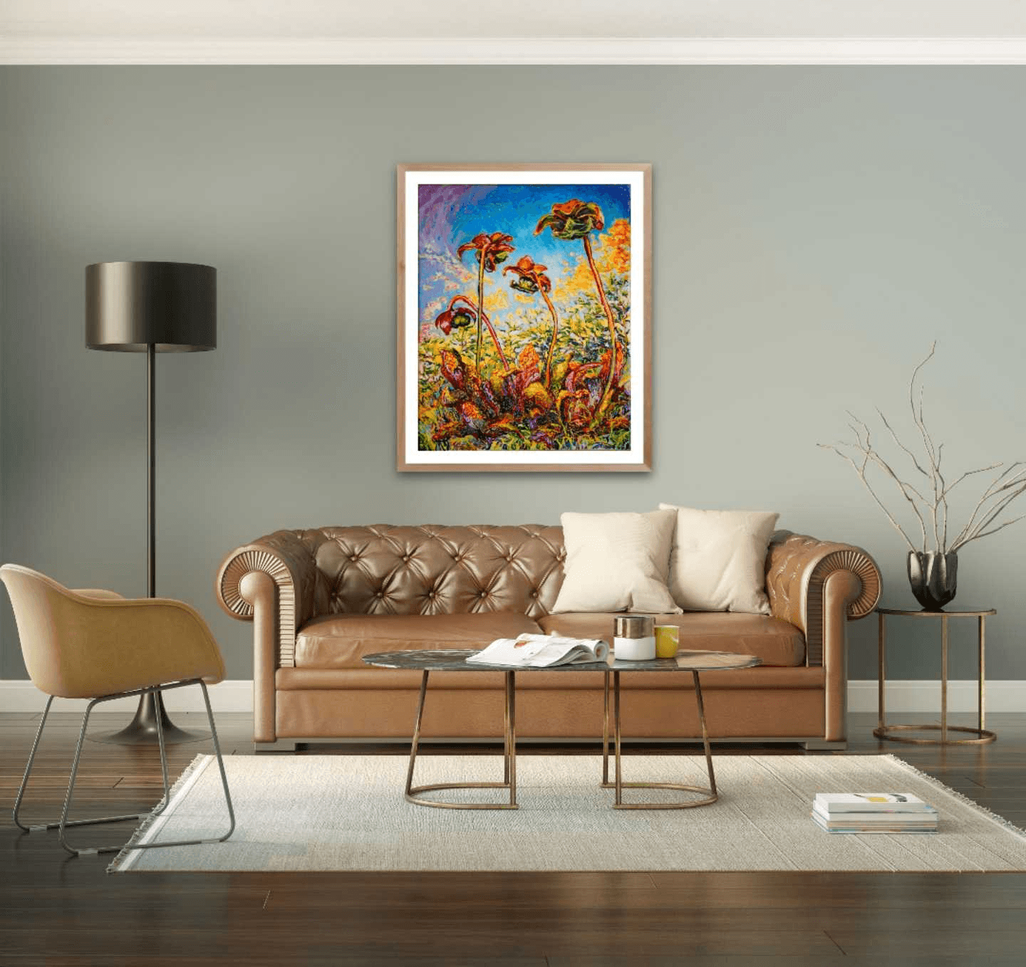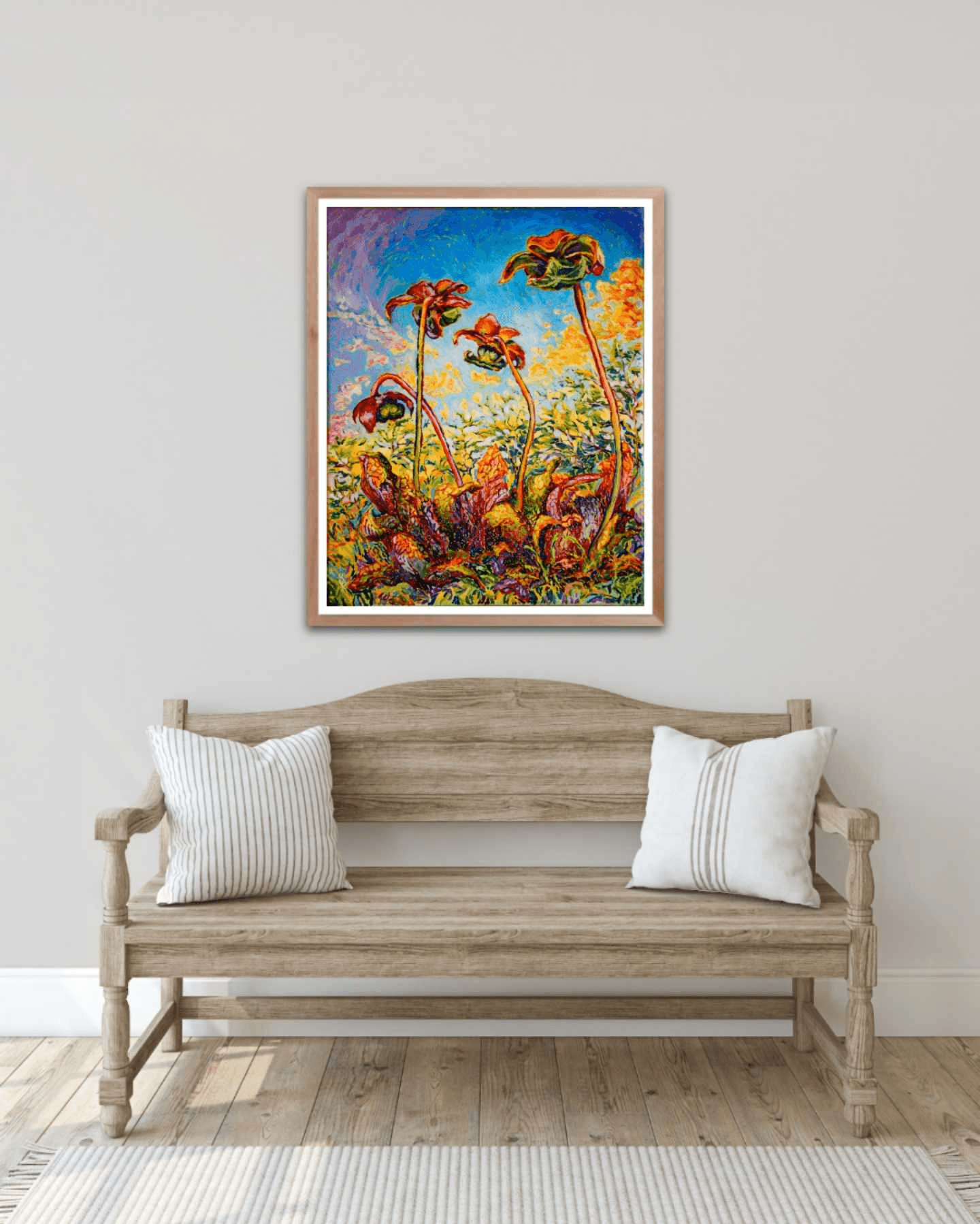 My second, and hopefully not last, painting of Pitcher Plants. The upward view brings beauty, majesty and elegance to these already glorious flowers. Their vivid red and greens are displayed against a lovely sky, while their stem descends all the way to the base to meet their curvy, twisting and colorful leaves, adding to their charm and character.