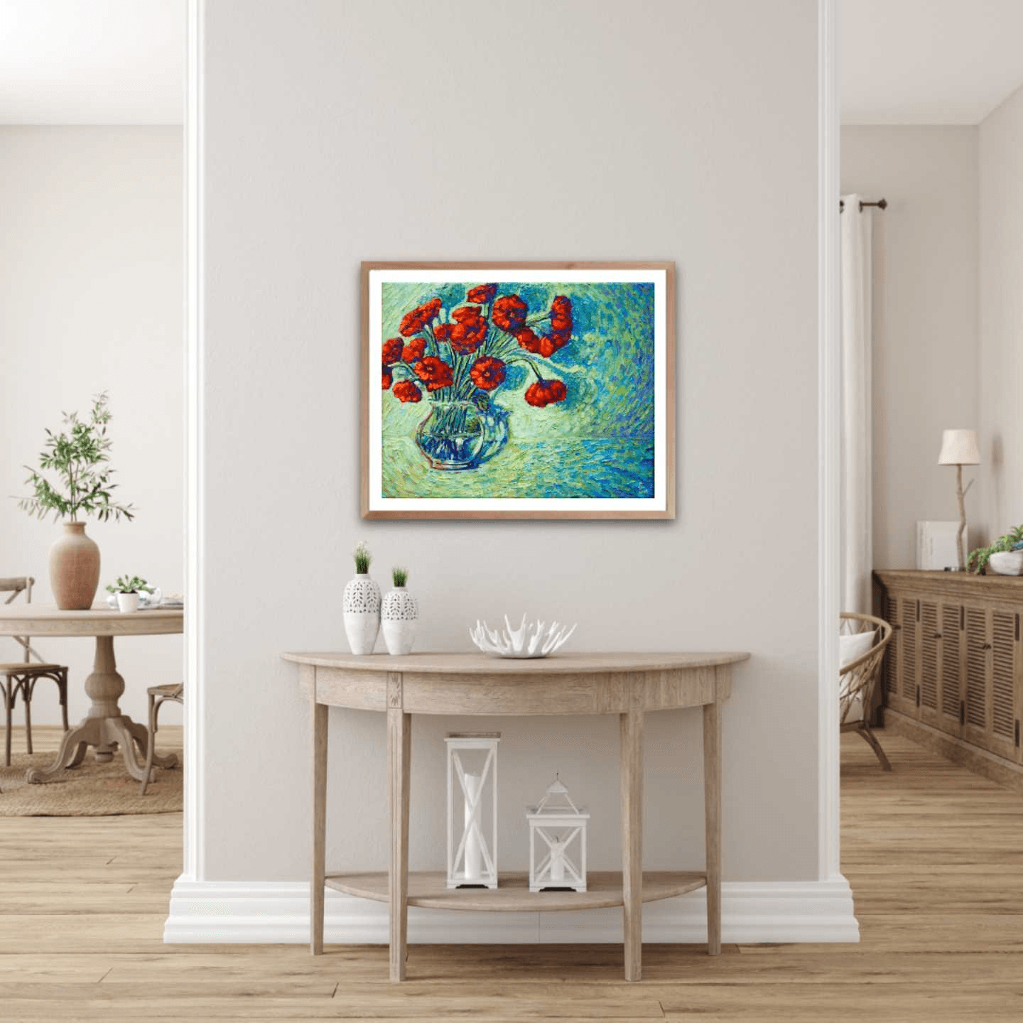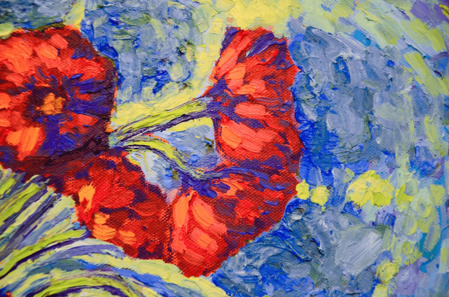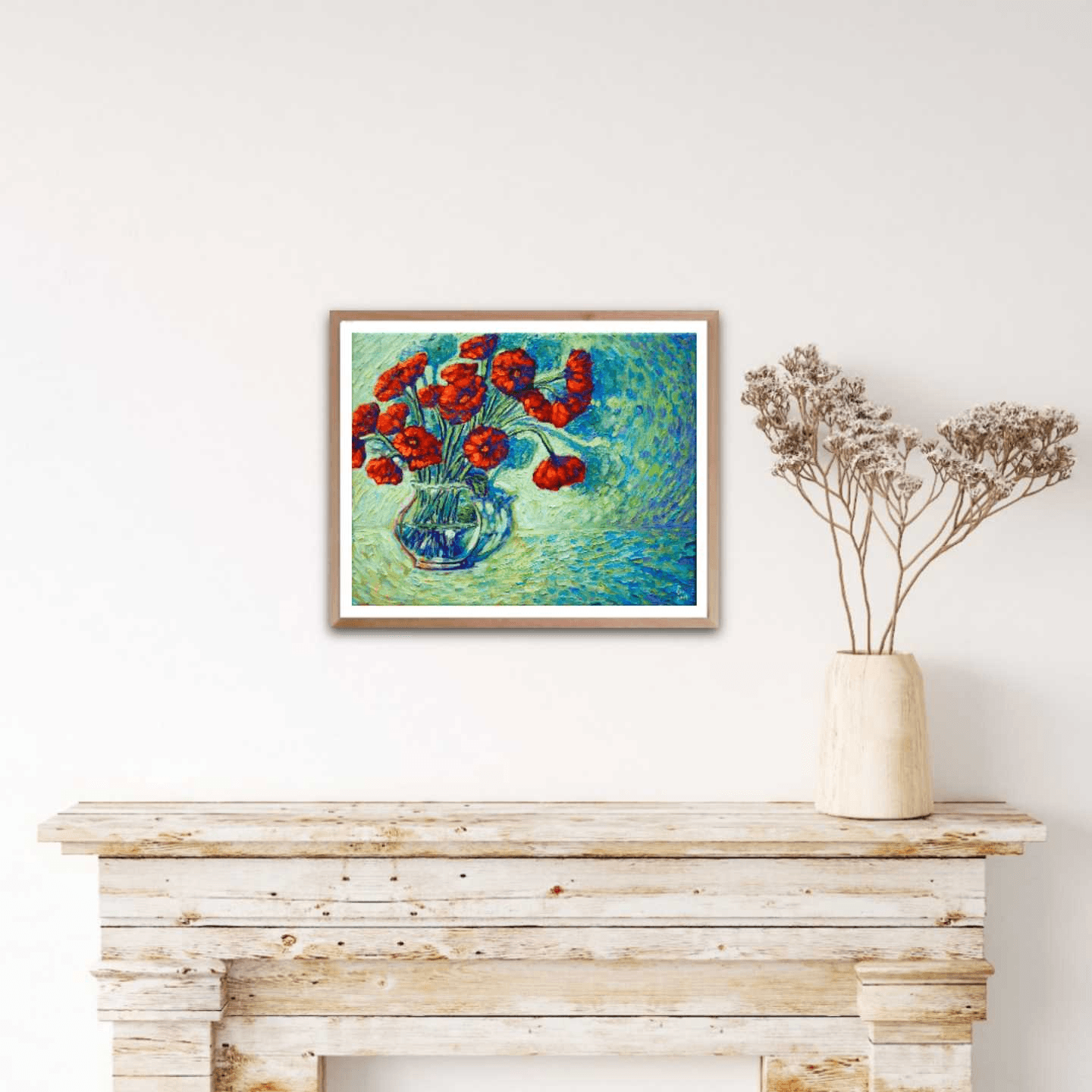 Flowers are the best way to bring life and nature into a room, like the first days of spring after a long and hard winter. This painting of bright, red poppies against a vivid blue and green background creates the same effect and acts like a soothing and pleasing balm to the eyes and soul. The thick brushstrokes mounted with generous amounts of paint adorn it with a dynamic, three-dimensional quality.