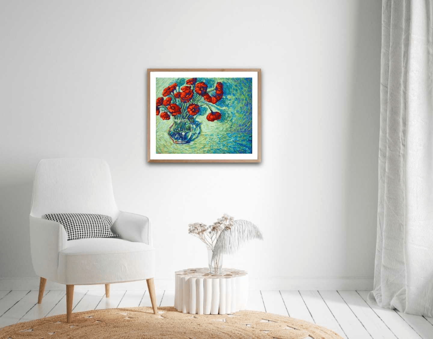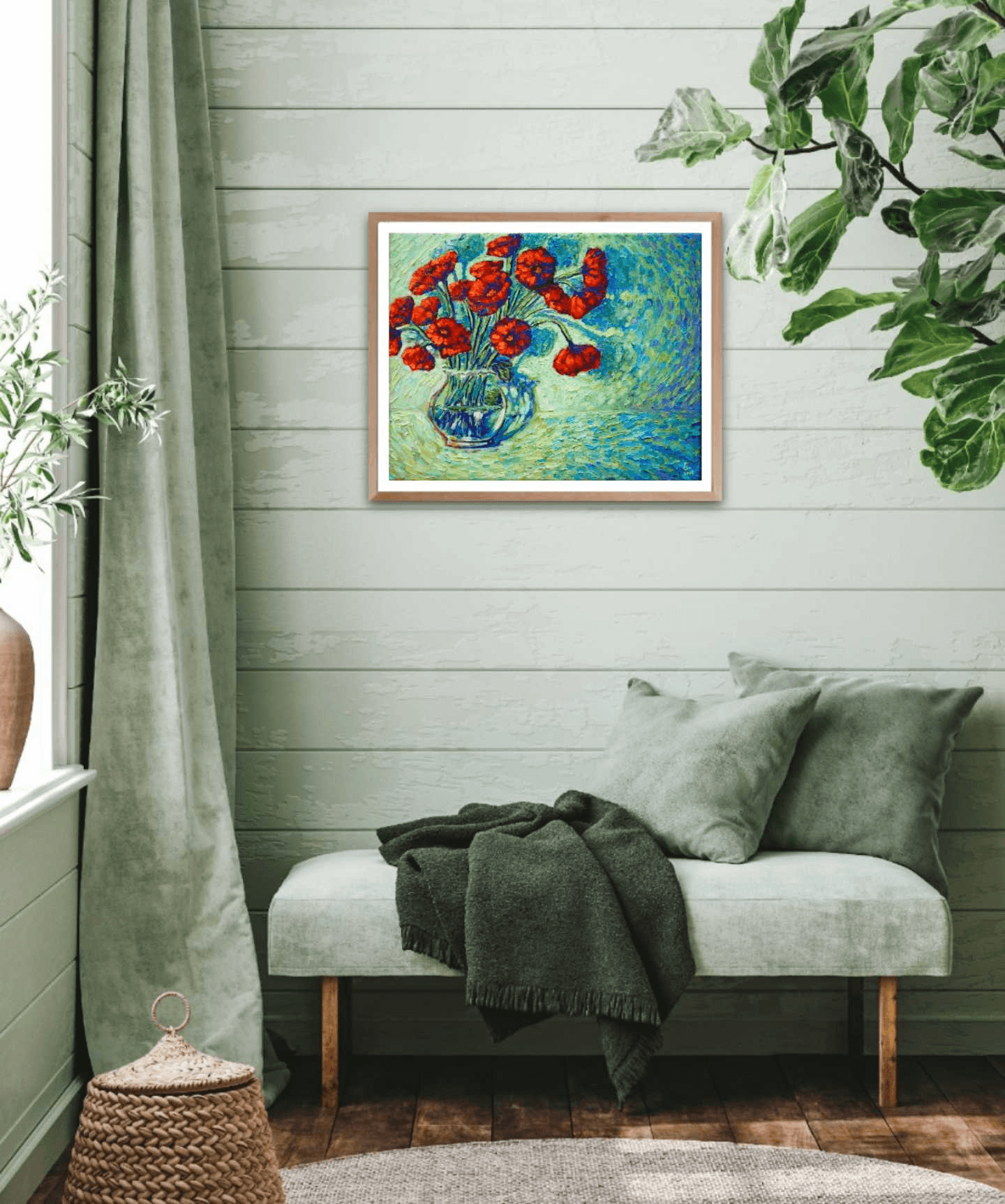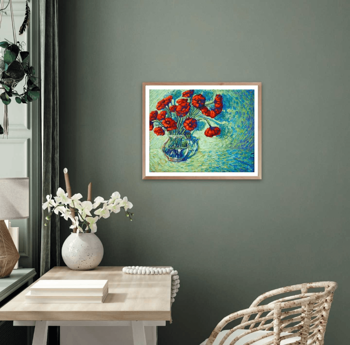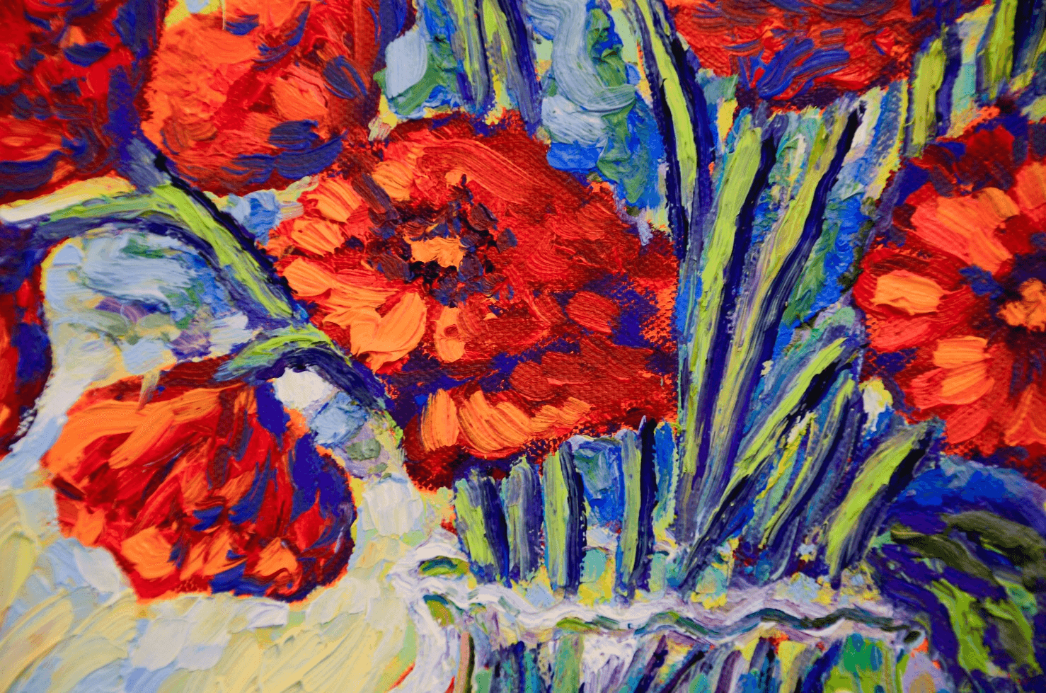 Flowers are the best way to bring life and nature into a room, like the first days of spring after a long and hard winter. This painting of bright, red poppies against a vivid blue and green background creates the same effect and acts like a soothing and pleasing balm to the eyes and soul. The thick brushstrokes mounted with generous amounts of paint adorn it with a dynamic, three-dimensional quality.