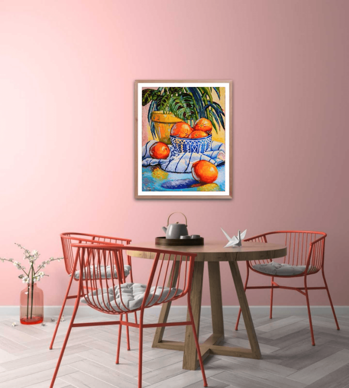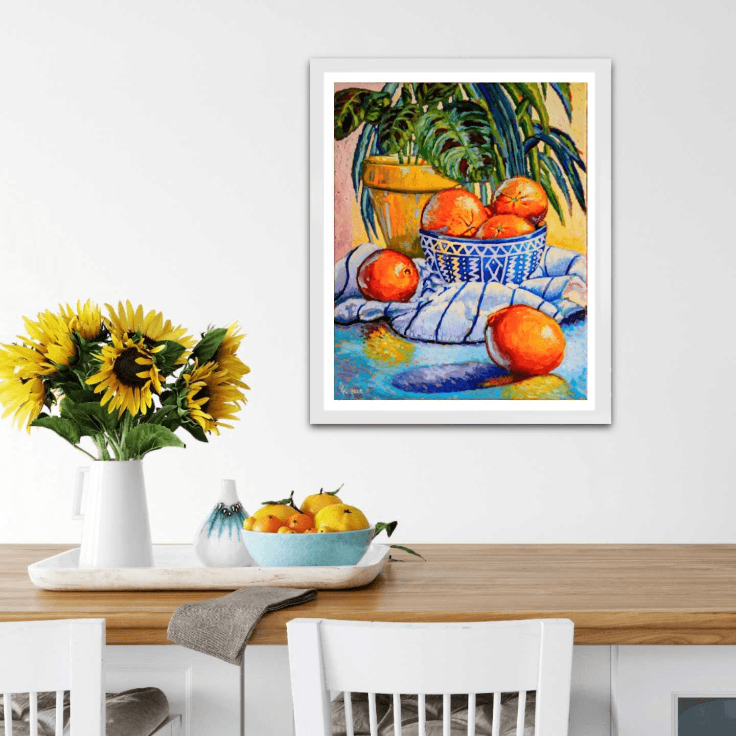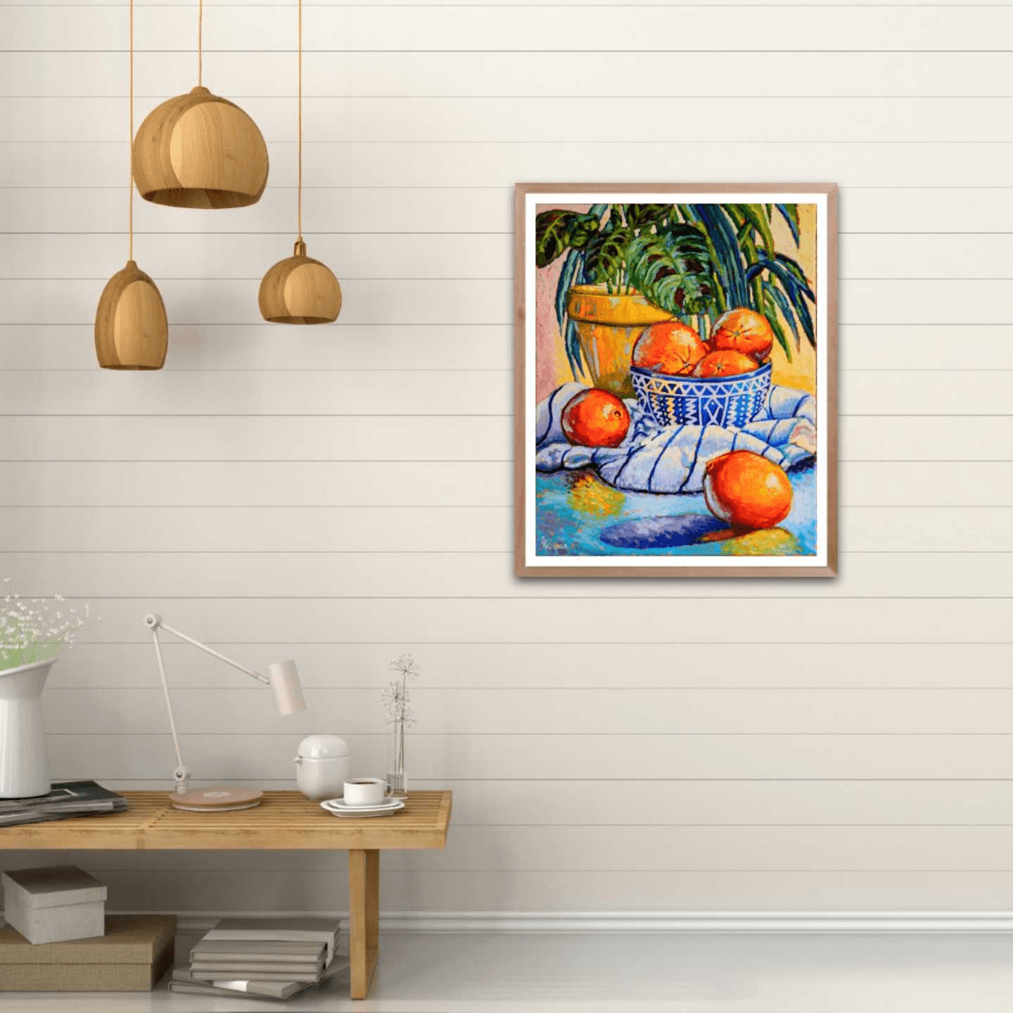 This painting came to be in the middle of the covid-19 pandemic, as Easter looked to be called off and the world was battling a crisis. I decided to step away from landscape, which I was focused on up until that point and venture back into still life. I wanted this painting to have a little subtle and positive message to everyone who was having a difficult time and not sure what the next days and months are going to bring. So I decided to include with the yucca tree, my prayer plant and infuse it some precious vitamin C by adding oranges, in hopes that all of our prayers of health and safety be answered. As the world seems to be slowly waking up again, this painting still holds a fresh, positive and bright perspective.