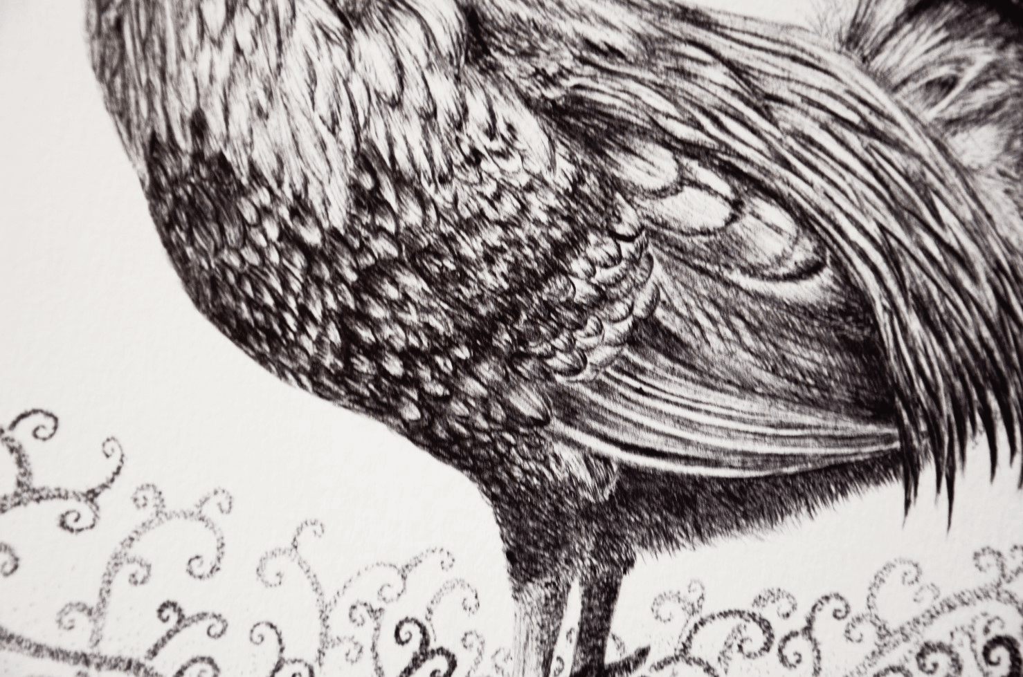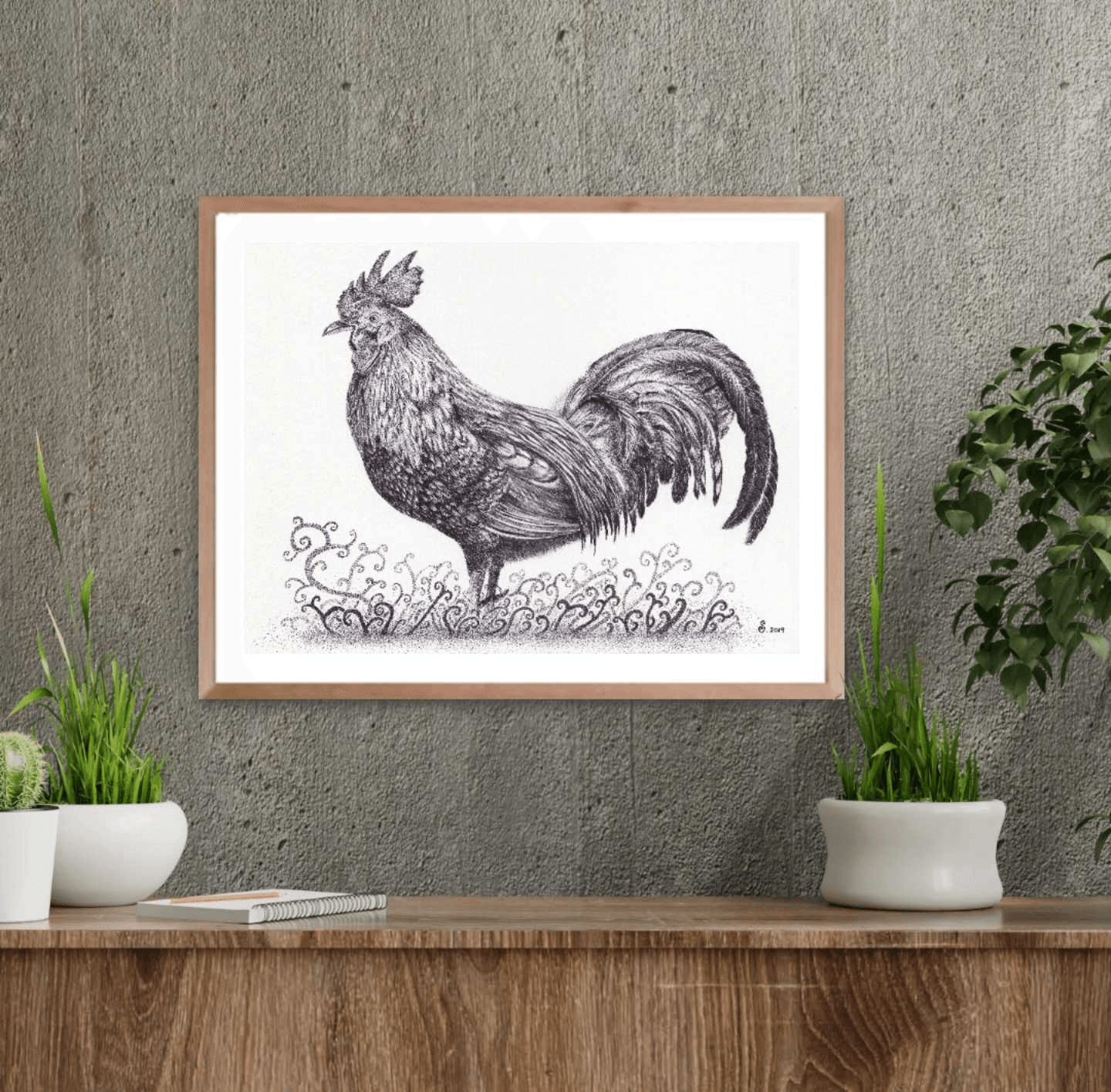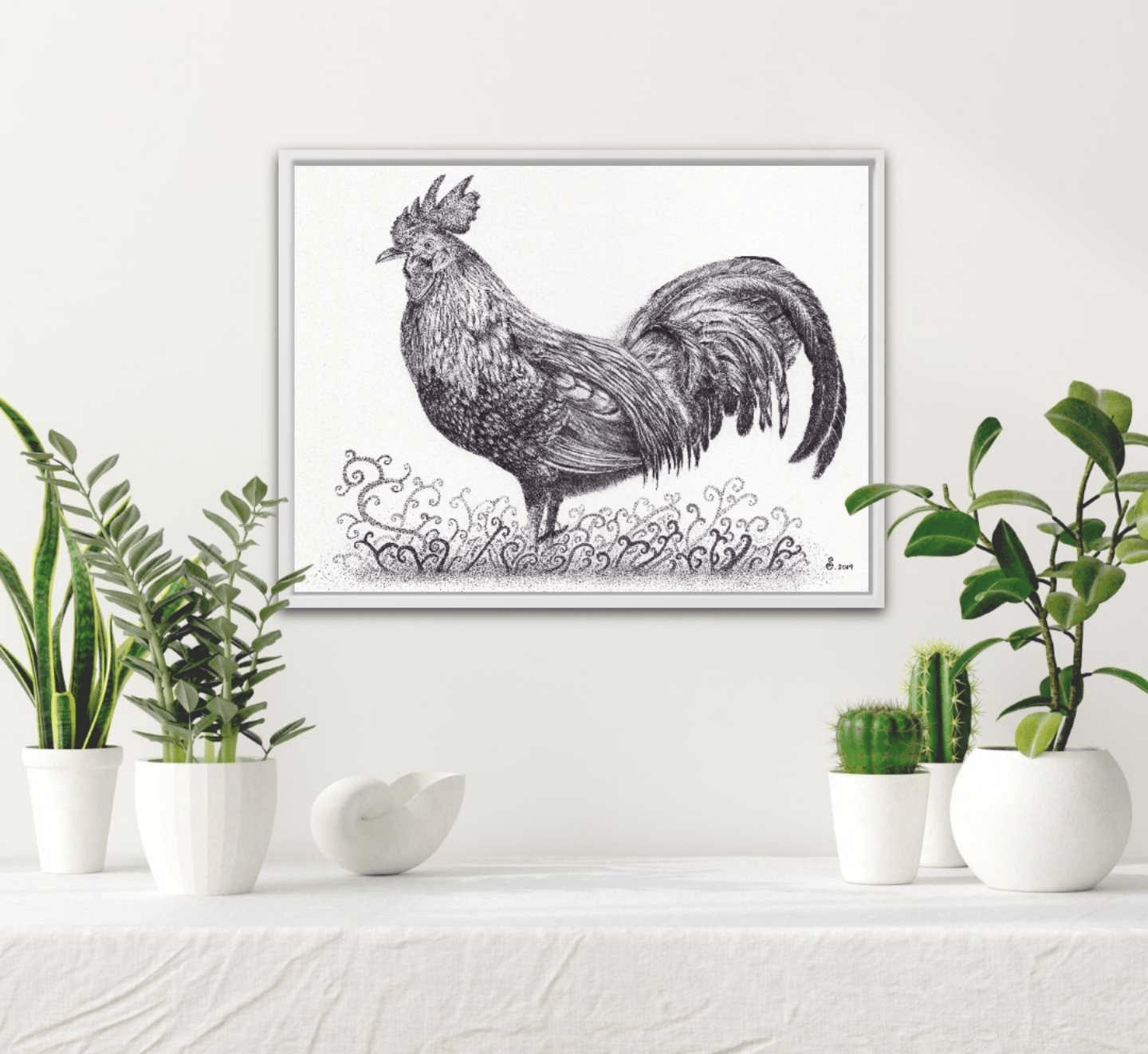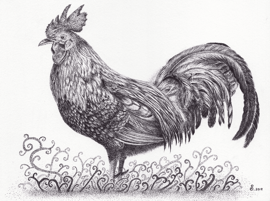 A detailed black and white ballpoint pen drawing of a handsome rooster standing in a cluster of grass. Its feathers shining and reflecting the light. The pen strokes combined with the pointillism technique make for a lovely finish that is worthy of such a great and proud animal.