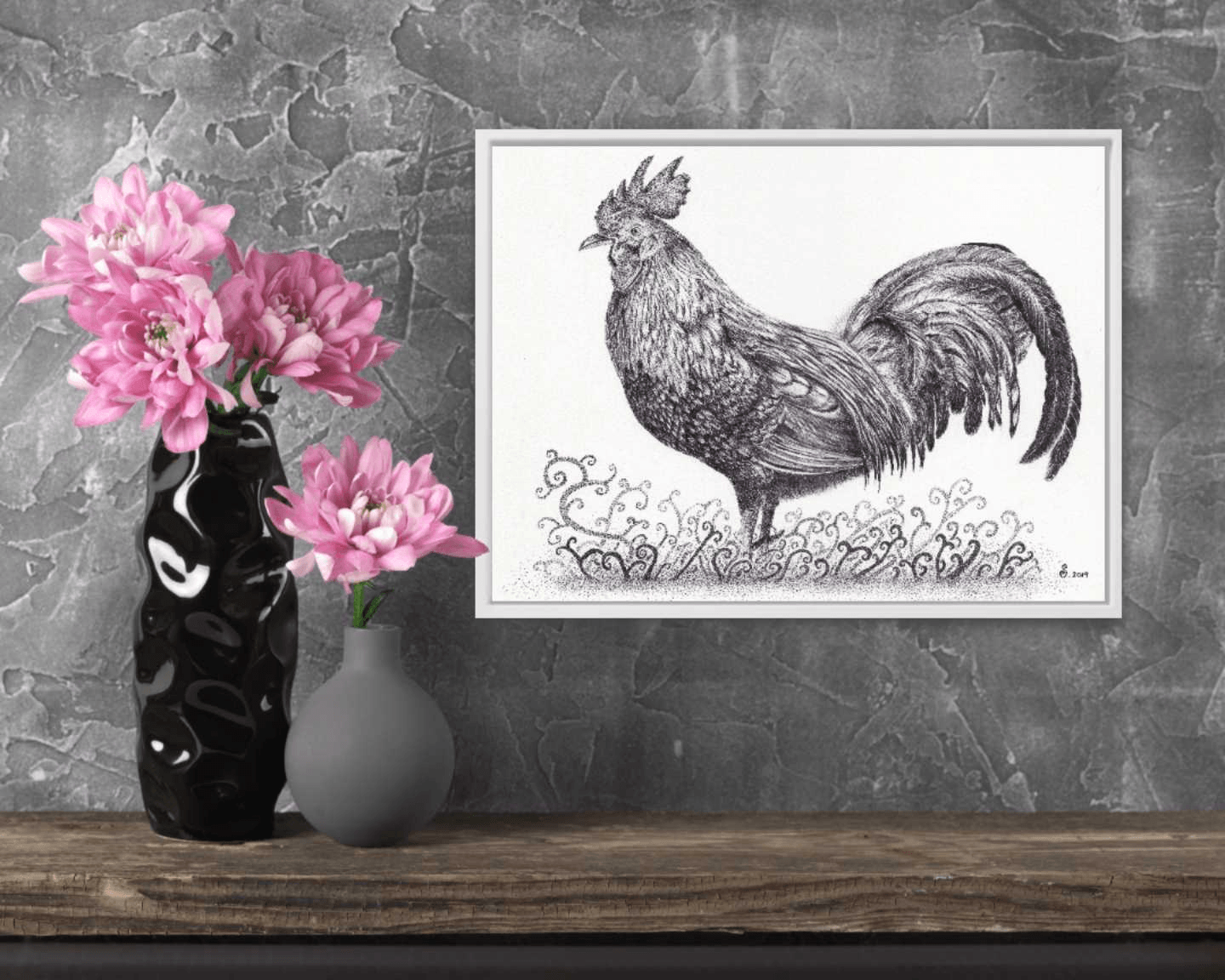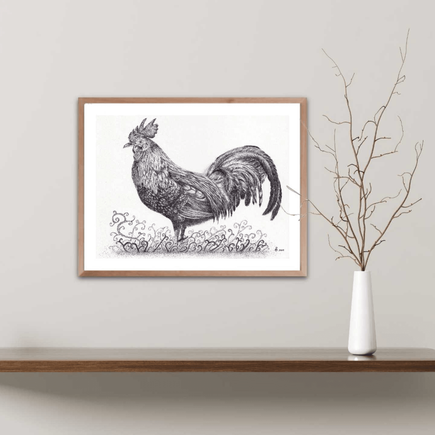 A detailed black and white ballpoint pen drawing of a handsome rooster standing in a cluster of grass. Its feathers shining and reflecting the light. ...
