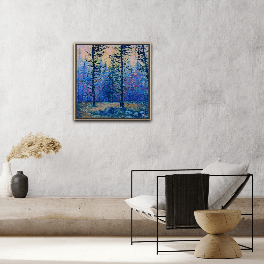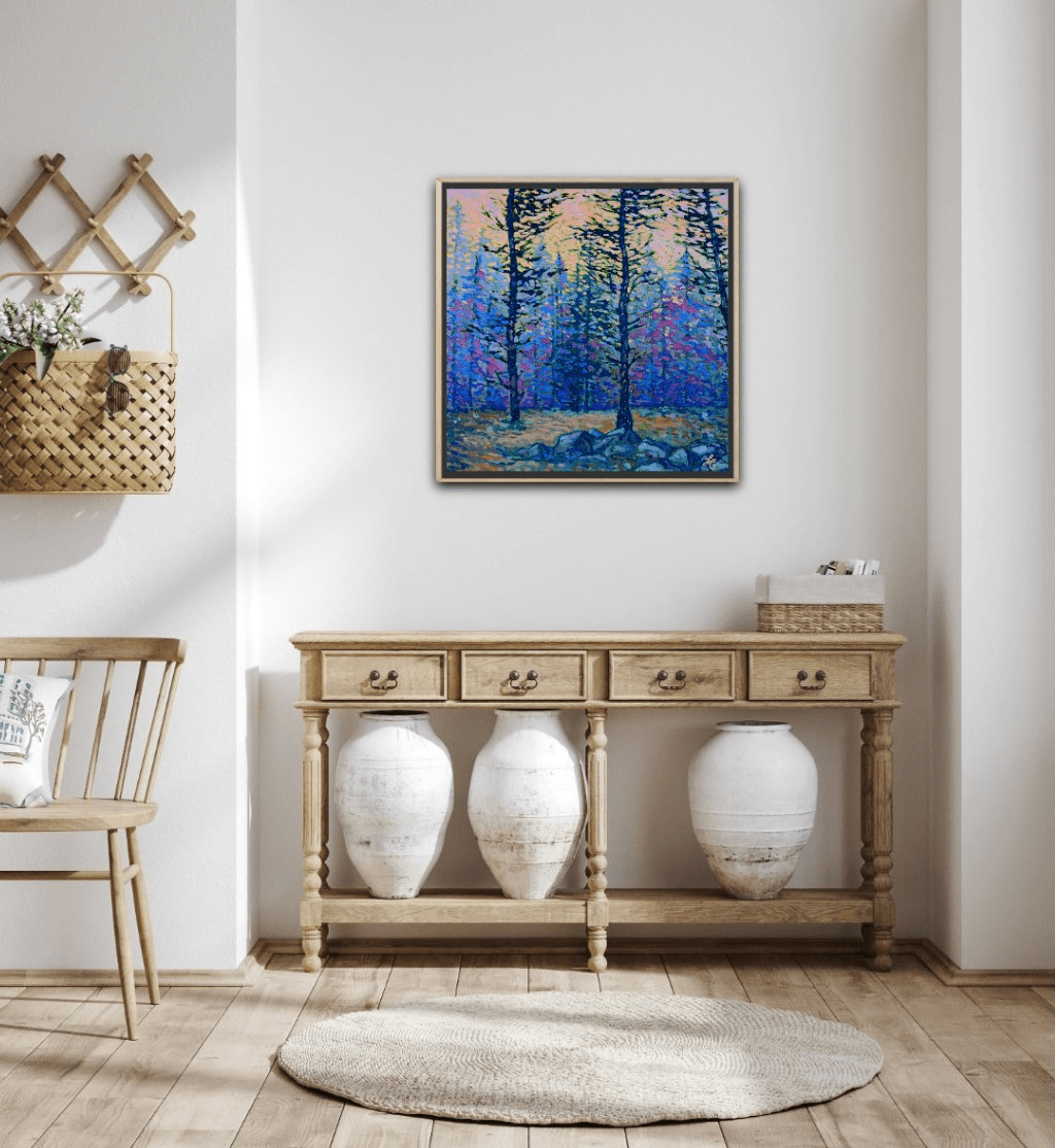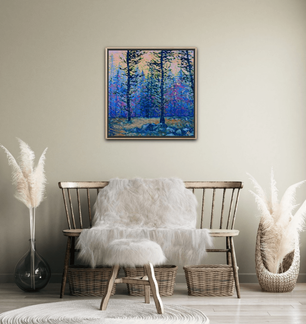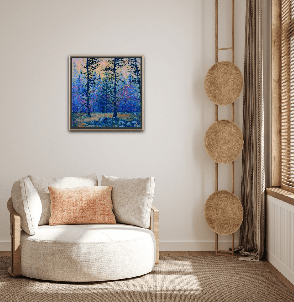 "RAMUS" is rich with cool and neutral tones that evoke a certain tranquil and undisturbed mood. It completely takes the viewer and puts them in an untroubled place where sounds are hushed, giving peace and quietude more and more space, allowing the view to fill the eyes and the rest of the senses and make it an engulfing, visual experience. The title "Ramus" means branch, vein or bone which are also evoked by the shapes of the trees in the foreground. I chose this name as a way to draw similarities between our own veins and bones and the tree branches but also as an invitation for us to hold tight to a tree branch in order to lift us to serenity and a home within ourselves.