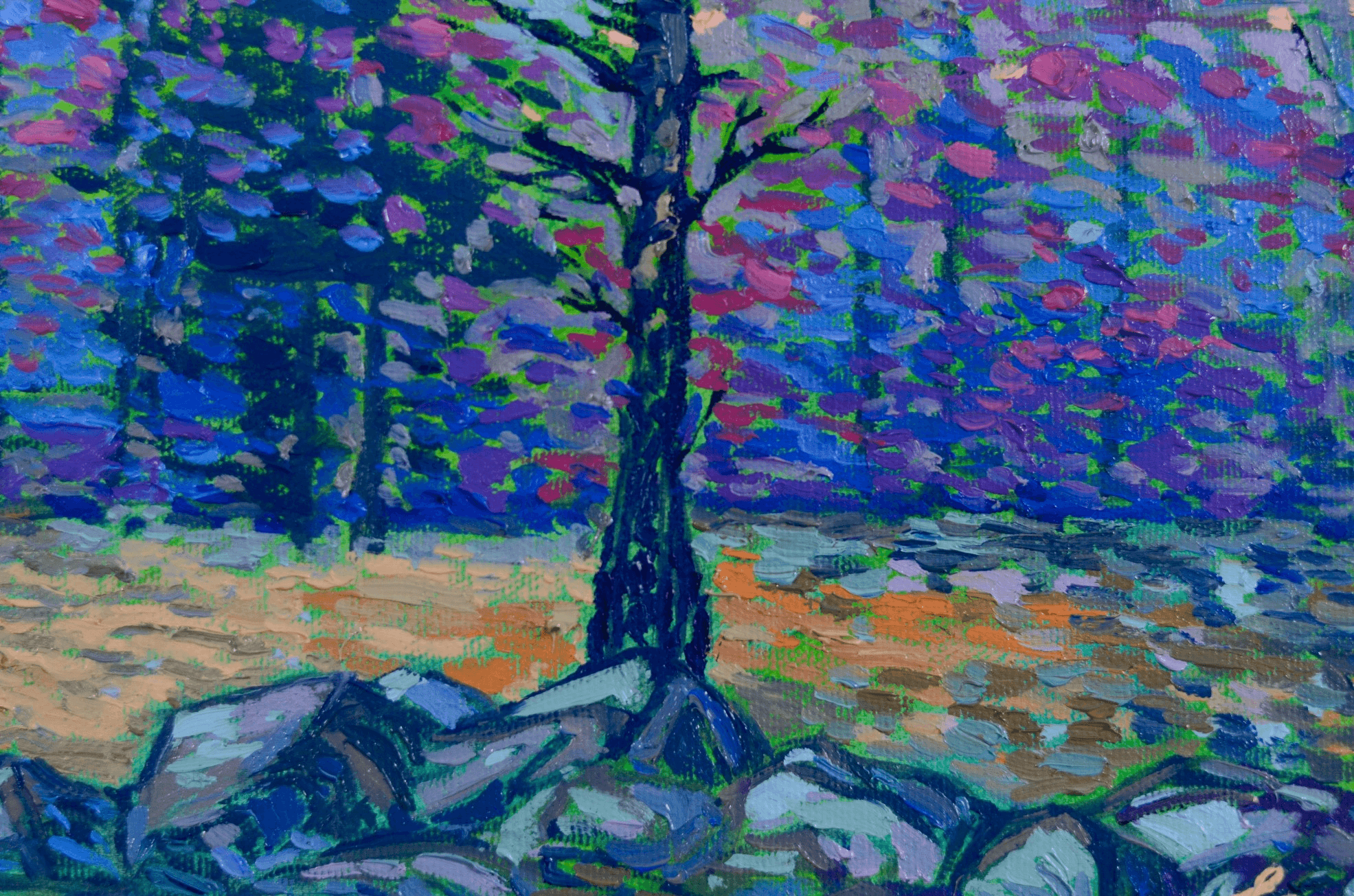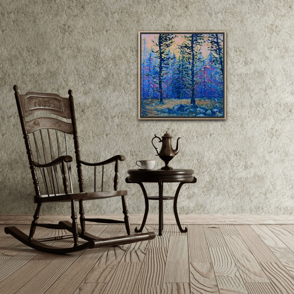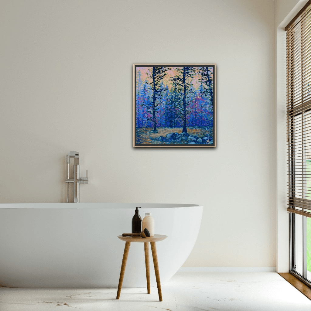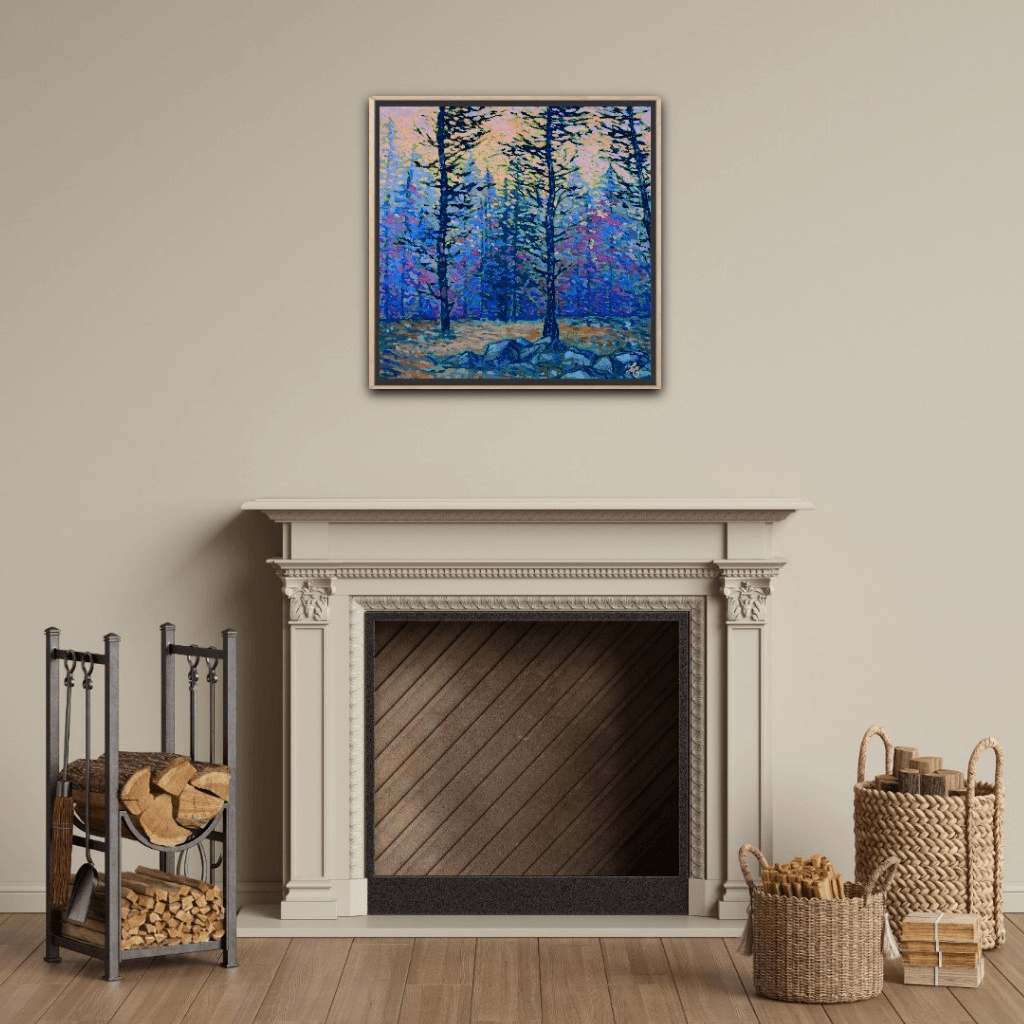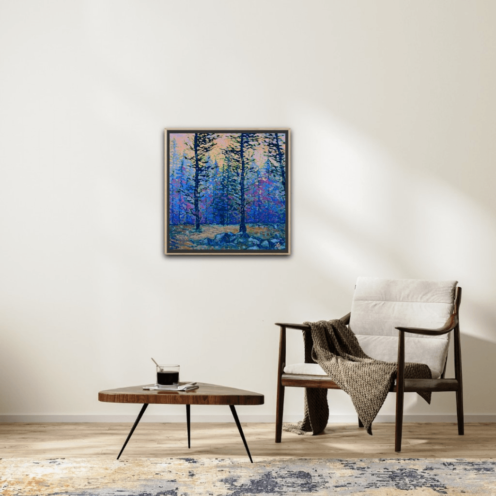 "RAMUS" is rich with cool and neutral tones that evoke a certain tranquil and undisturbed mood. It completely takes the viewer and puts them in an untroubled place where sounds are hushed, giving peace and quietude more and more space, allowing the view to fill the eyes and the rest of the senses and make it an engulfing, visual experience. The title "Ramus" means branch, vein or bone which are also evoked by the shapes of the trees in the foreground. I chose this name as a way to draw similarities between our own veins and bones and the tree branches but also as an invitation for us to hold tight to a tree branch in order to lift us to serenity and a home within ourselves.