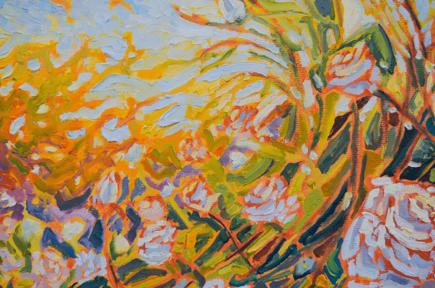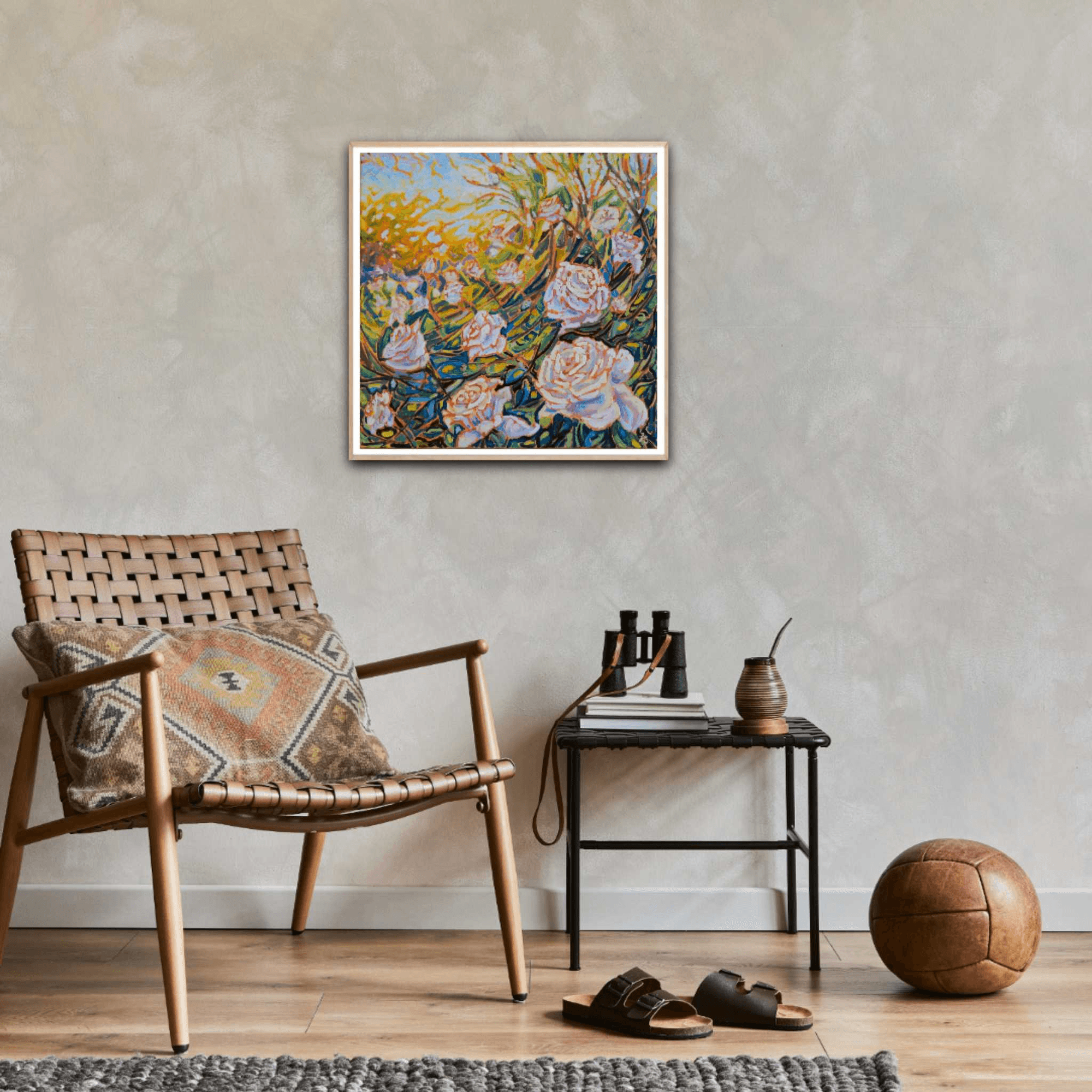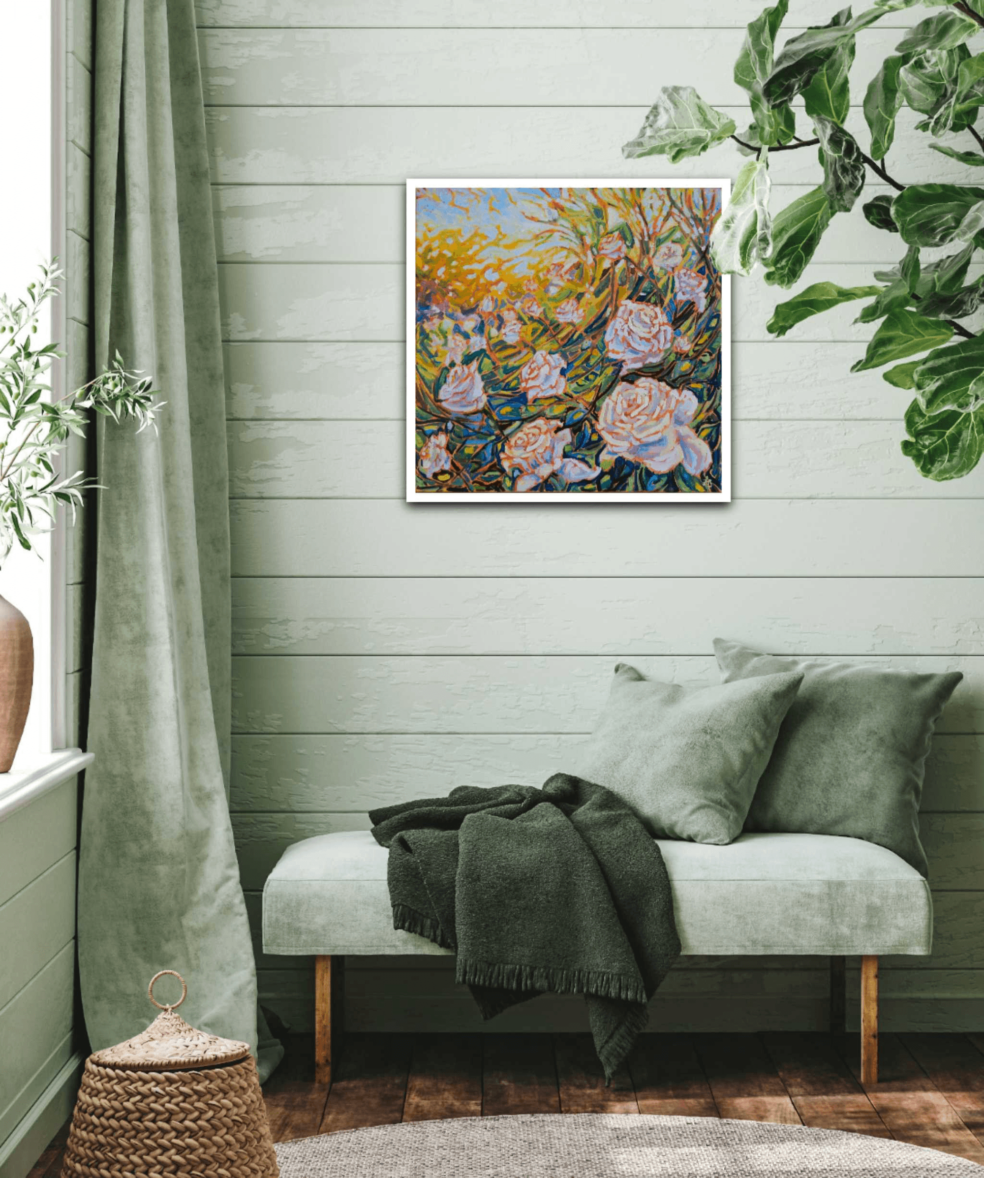 Another floral painting inspired by my mother's flowers. The white roses are all clustered together and growing in unison. Their beautiful aroma and lovely light petals engulf you in a fragrant wave that sweeps you to a never-ending spring of light, sun, warmth and blossoms.