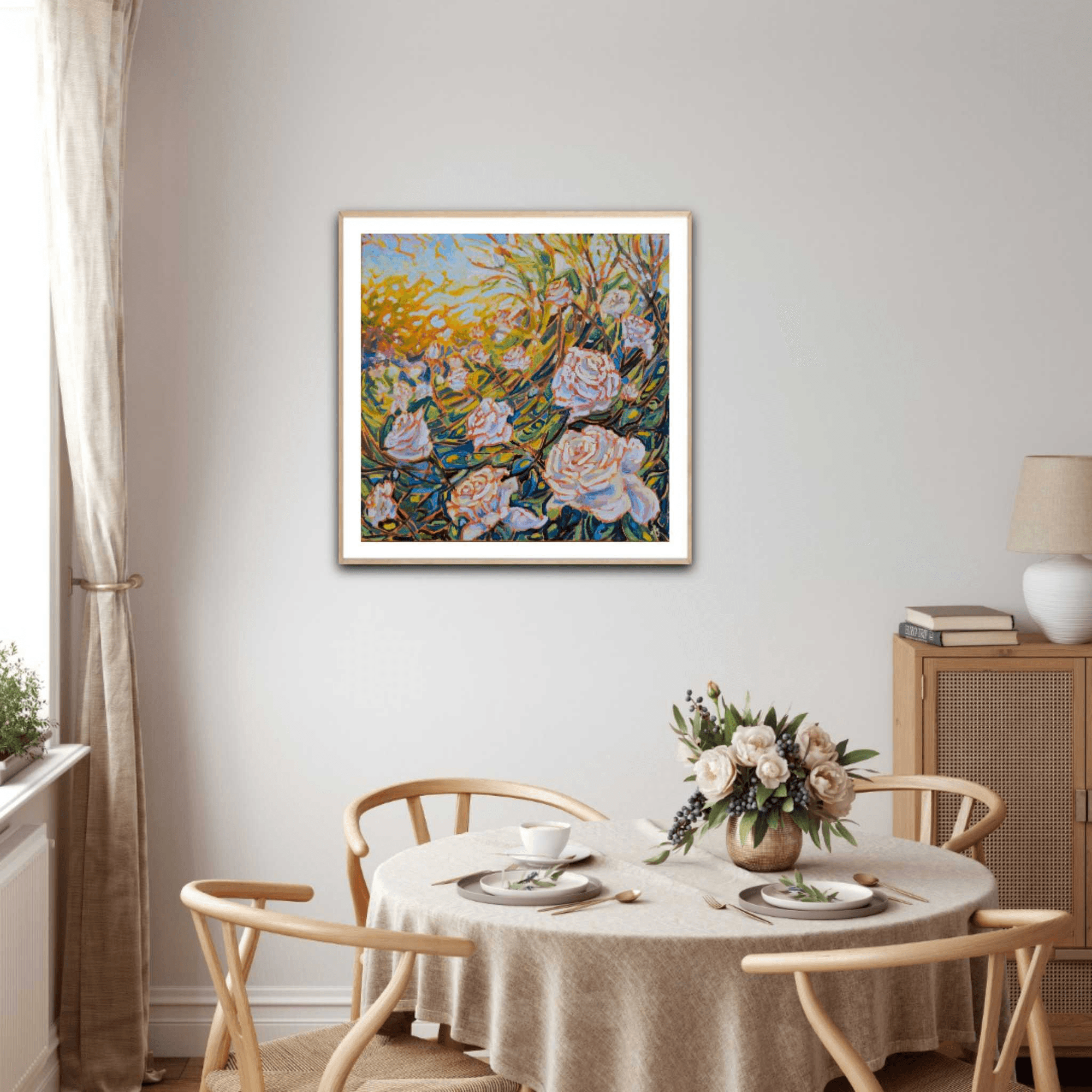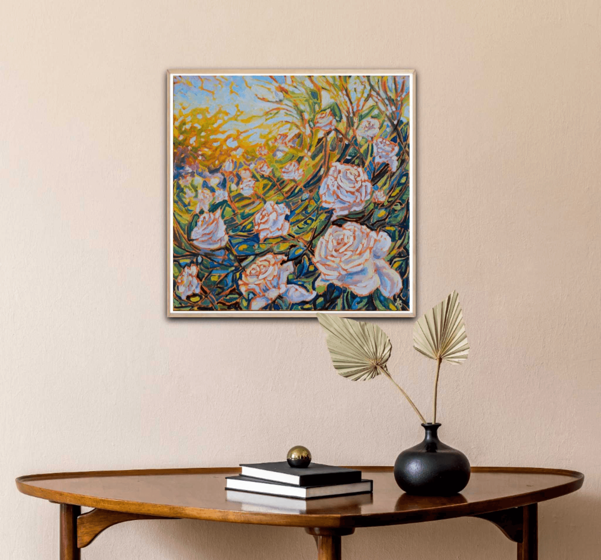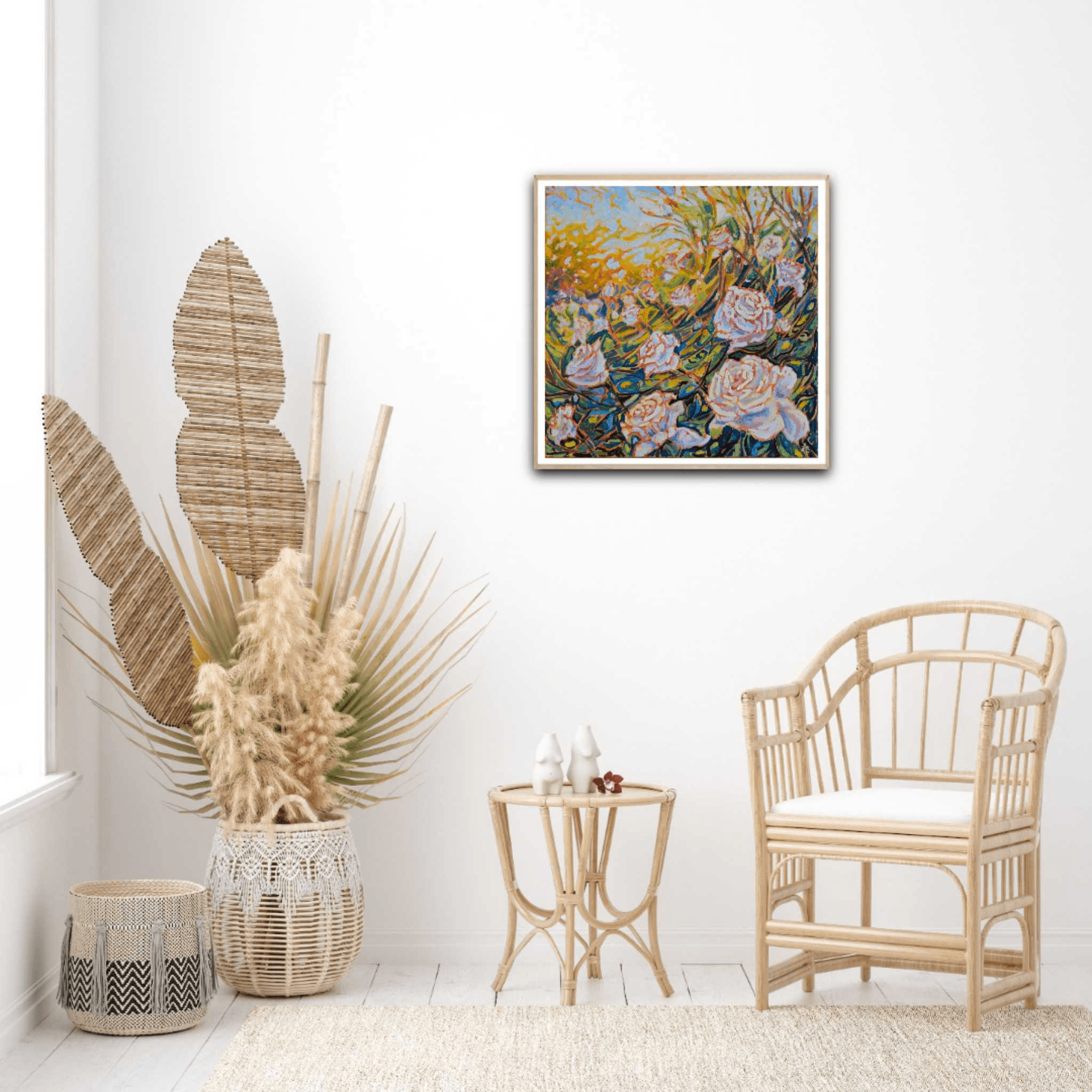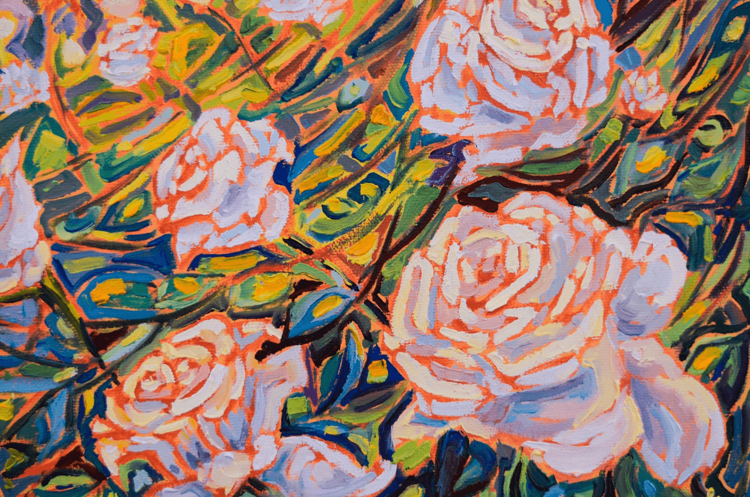 Another floral painting inspired by my mother's flowers. The white roses are all clustered together and growing in unison. Their beautiful aroma and lovely light petals engulf you in a fragrant wave that sweeps you to a never-ending spring of light, sun, warmth and blossoms.