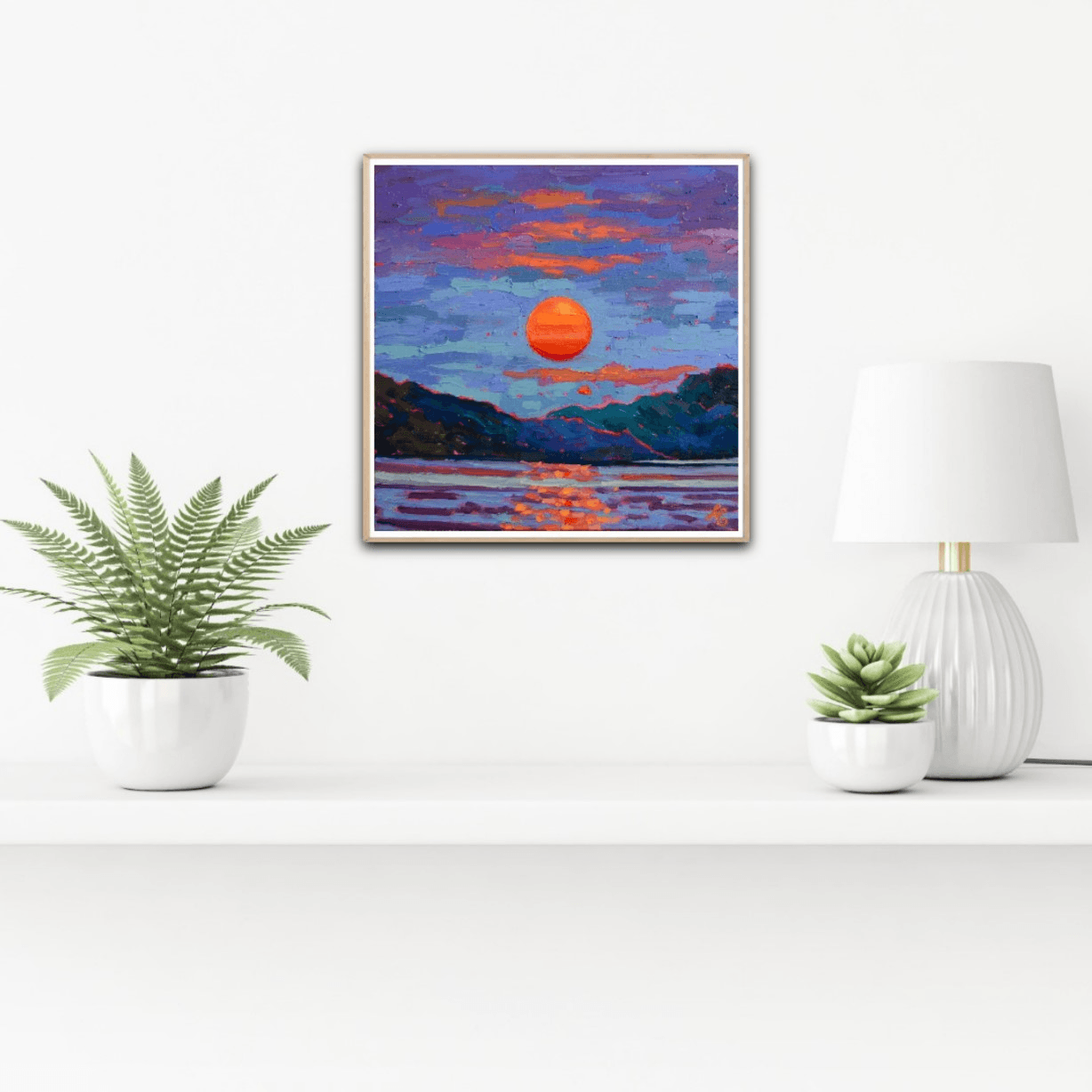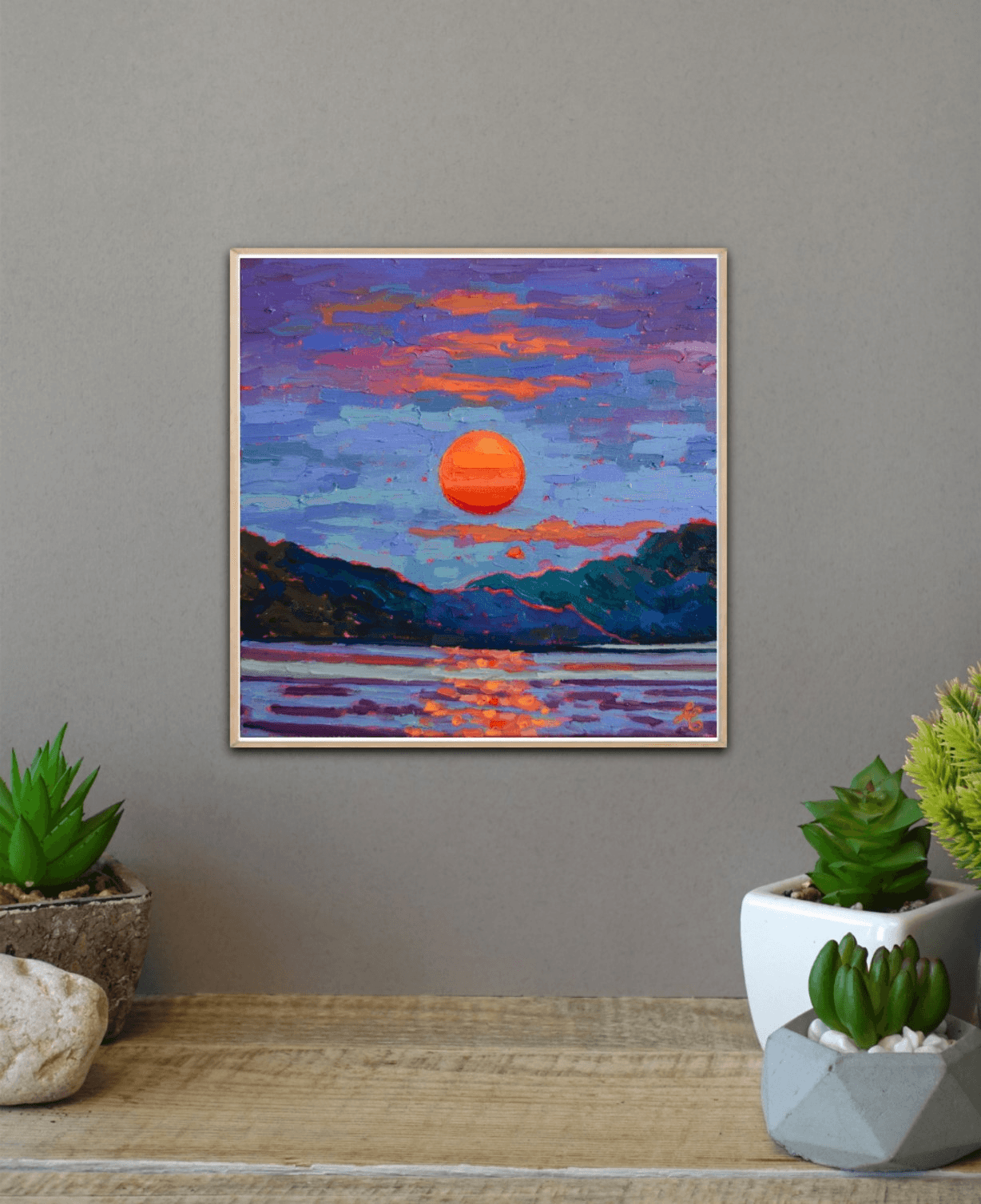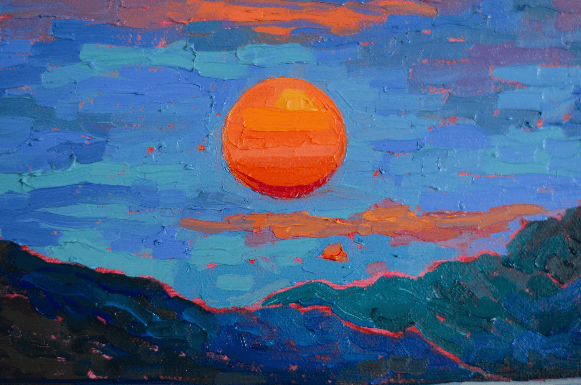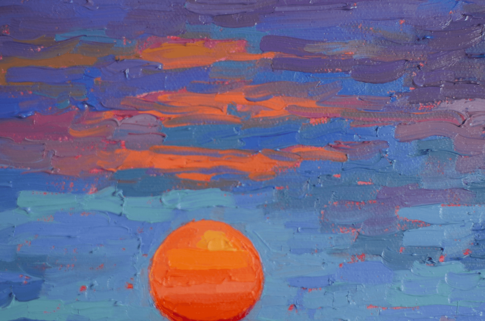 This is painting number one from my mini-series titled "Solar Verses". It is a collection of paintings that I decided should be devoted to the beauty and glory of the sun... I wanted to portray this burning star in the center of our solar system that keeps our world lit and alive in different situations and settings to showcase its many faces and colors...