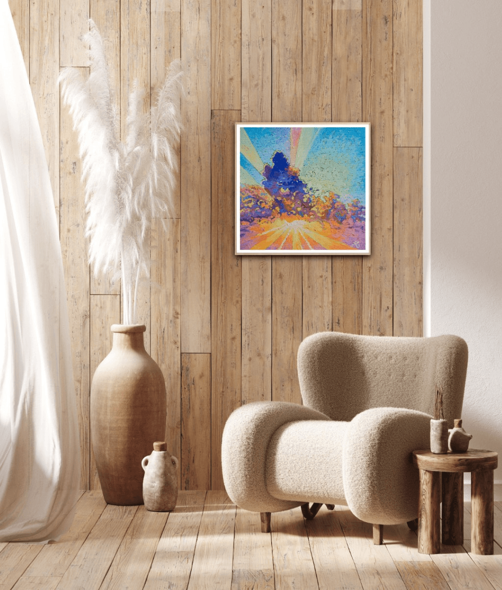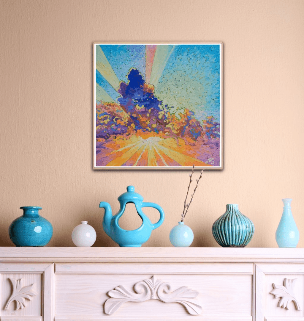 This is painting number three from my mini-series titled "Solar Verses". It is a collection of paintings that I decided should be devoted to the beauty and glory of the sun... I wanted to portray this burning star in the center of our solar system that keeps our world lit and alive in different situations and settings to showcase its many faces and colors...