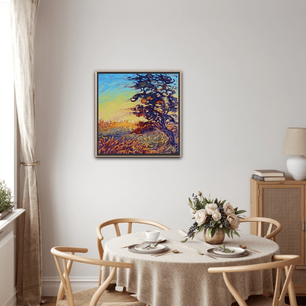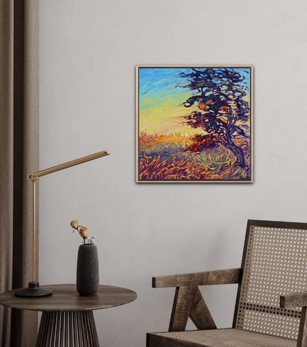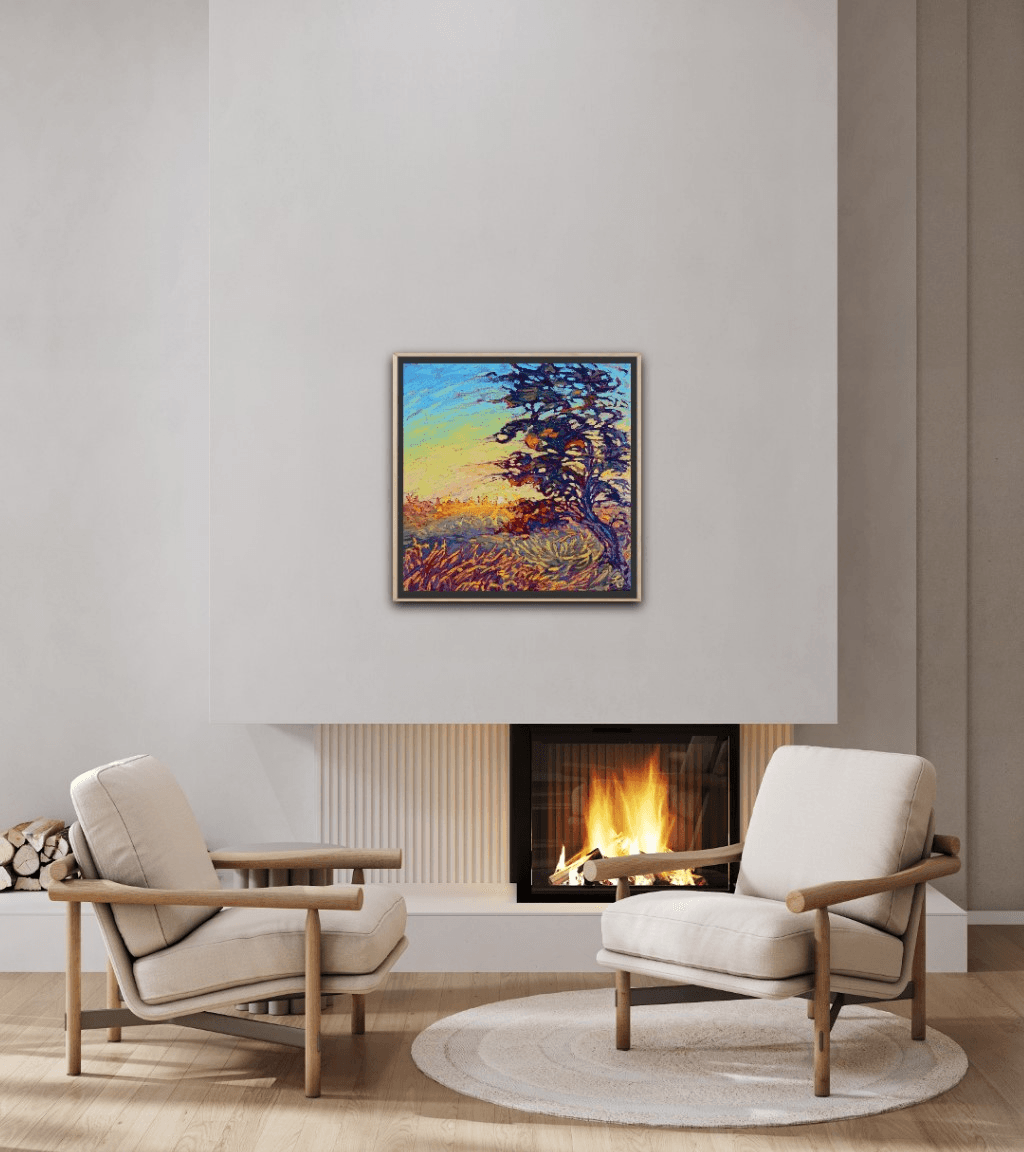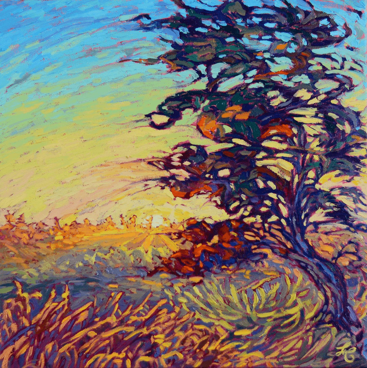 "Solis" is a painting that is another manifestation of my love of depicting sunsets and painting the sun through its various, spectacular moments. The painting portrays a glorious sunset through fields of grass, framed by a dancing tree in the foreground.