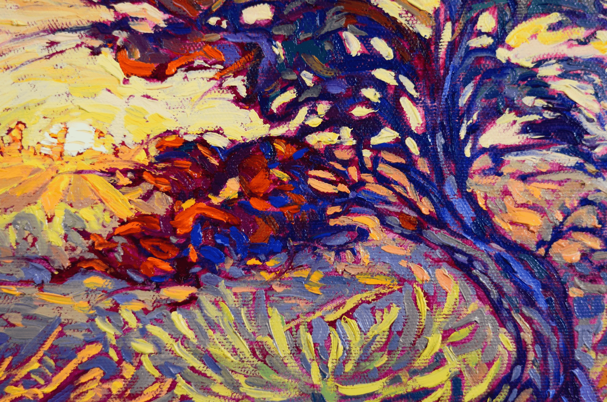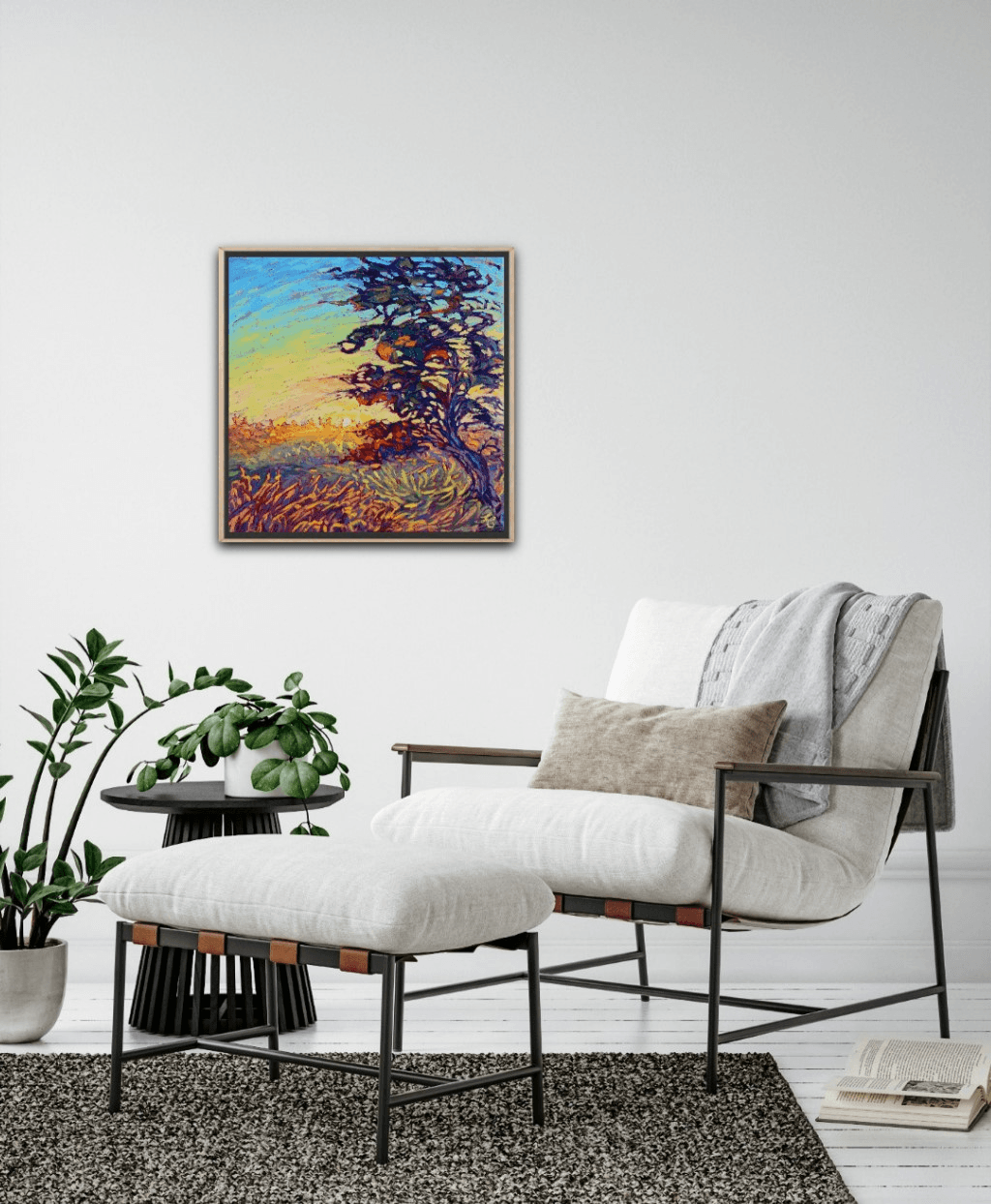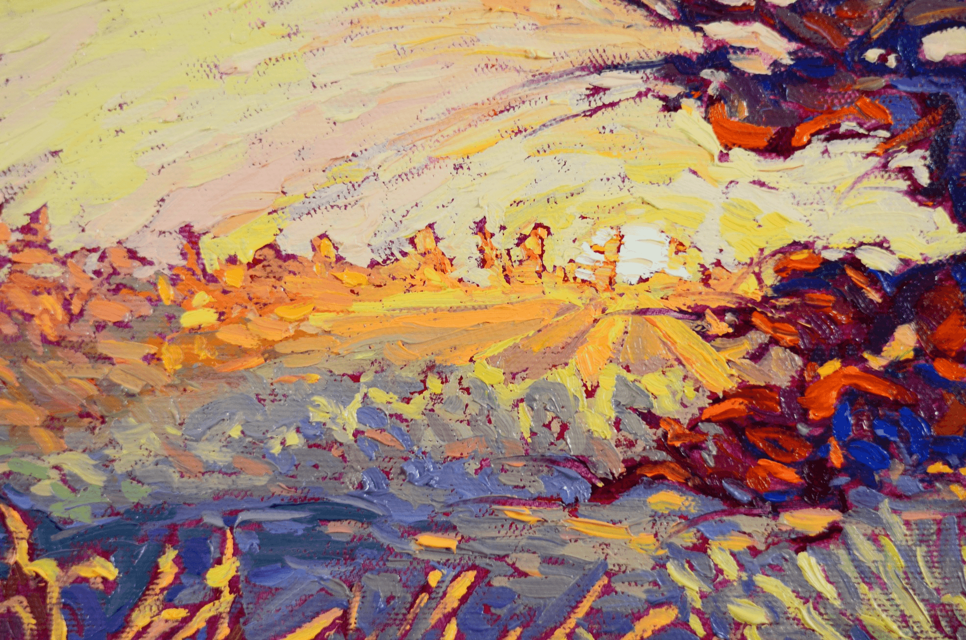 "Solis" is a painting that is another manifestation of my love of depicting sunsets and painting the sun through its various, spectacular moments. The painting portrays a glorious sunset through fields of grass, framed by a dancing tree in the foreground.