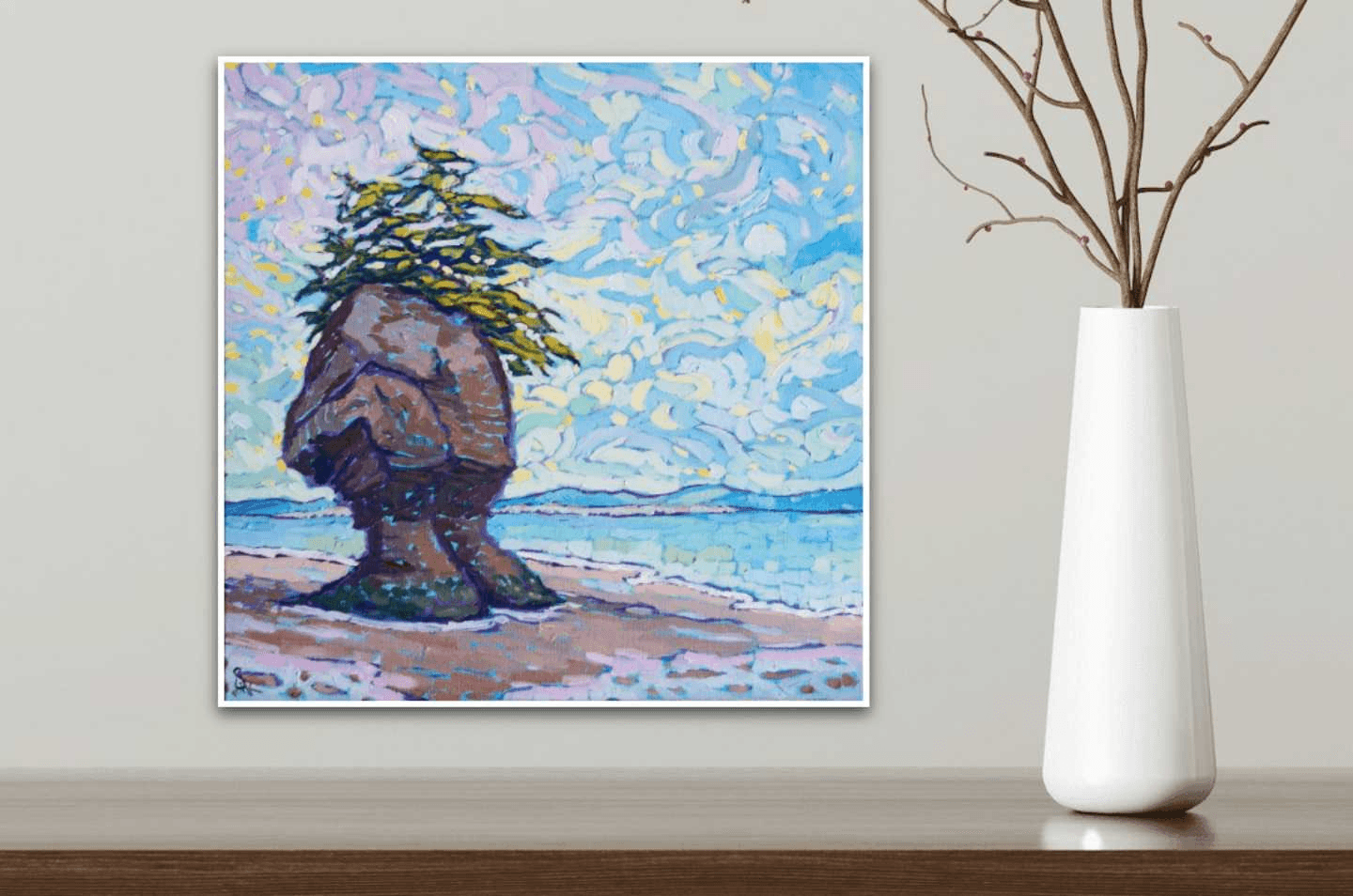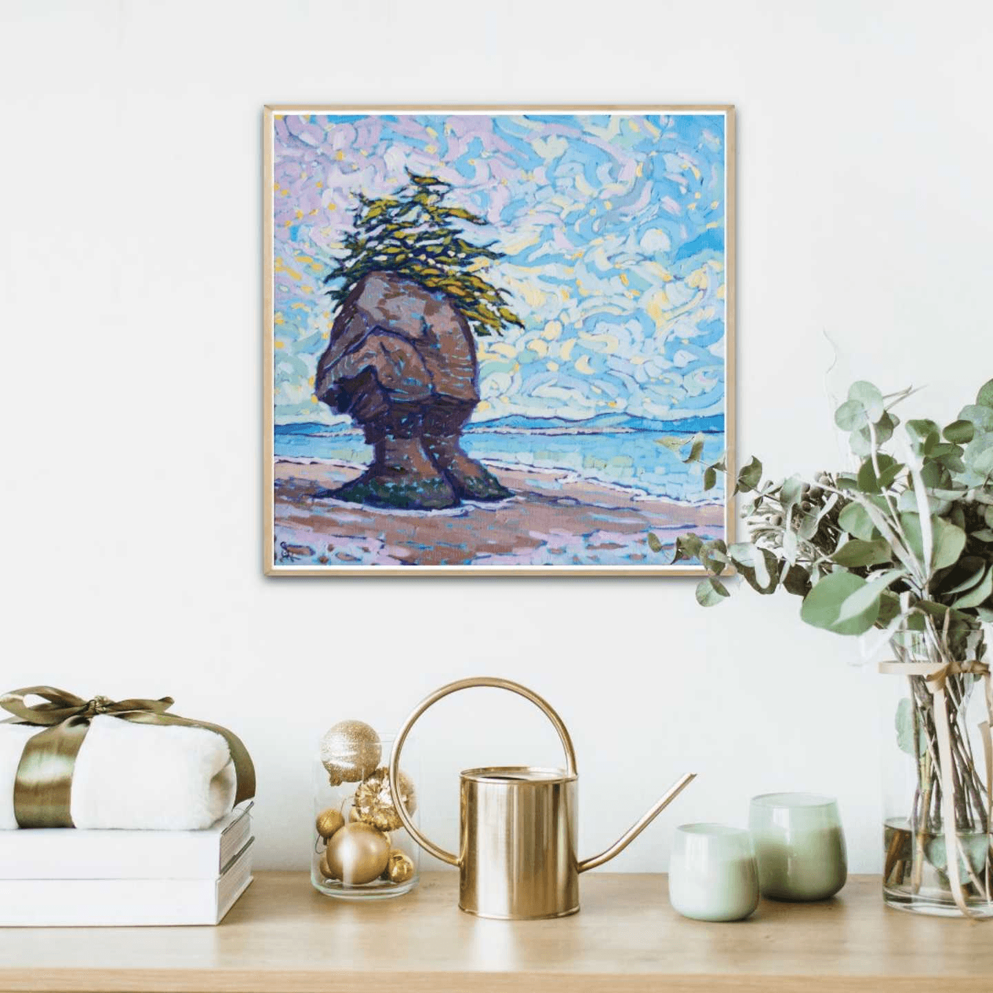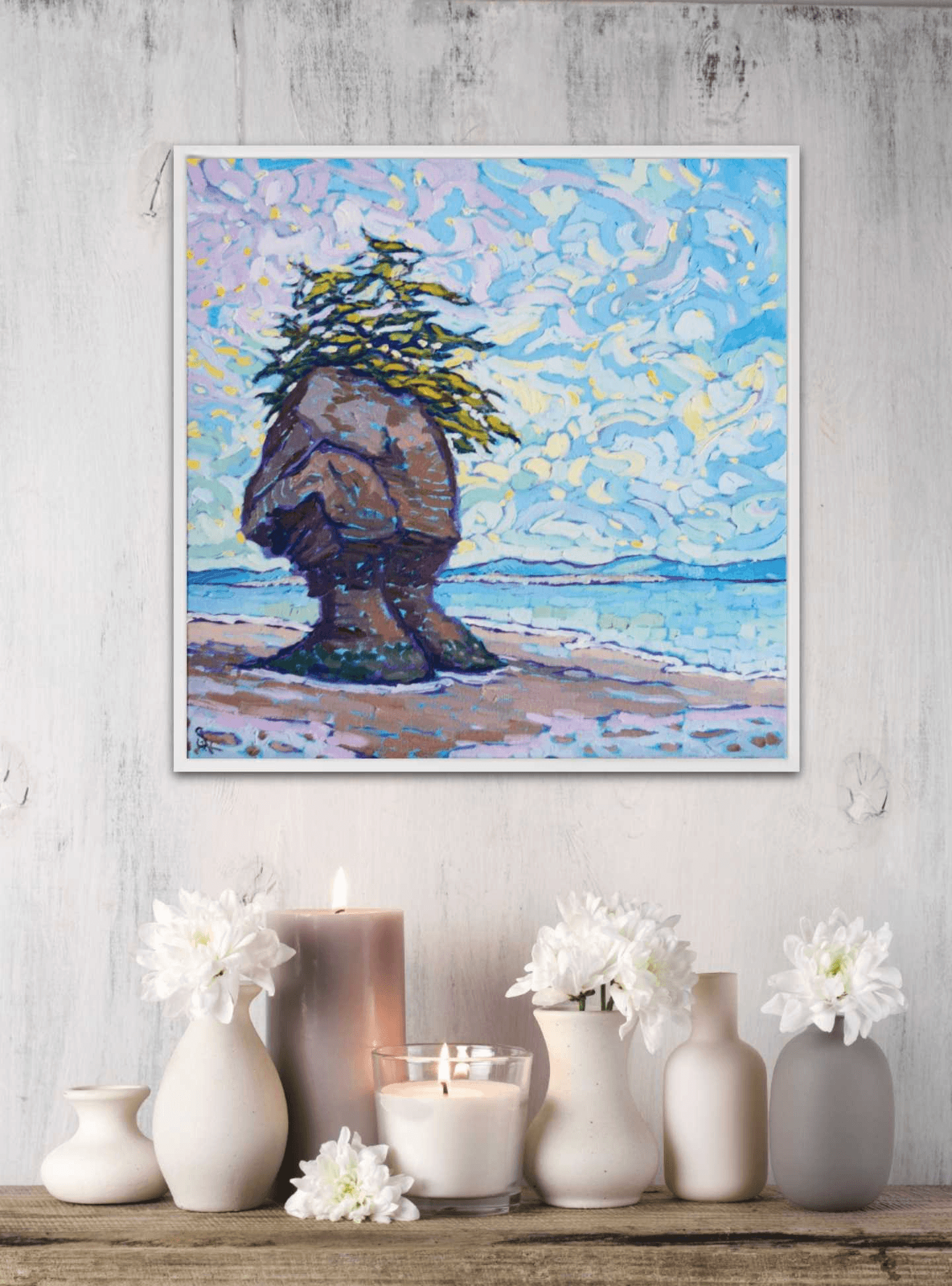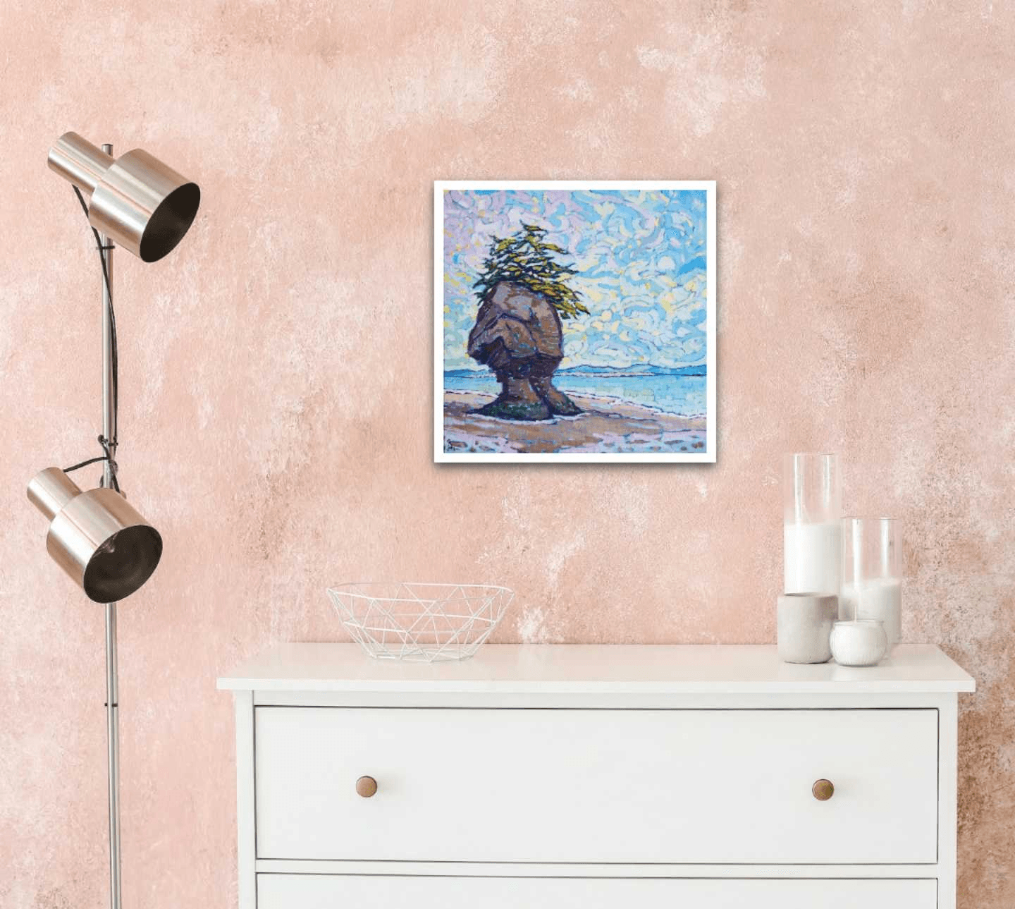 "Spirited Solitude" is all about tranquility, lightness, breeziness, quietude and space. This painting is based on a reference picture I took during my stay in New Brunswick and Nova Scotia and my visit to the wonderful site that is Hopewell Rocks in the Bay of Fundy. This beautiful, other-worldly site inspired me so many times and I always find myself going back to all the pictures I took to produce a new painting with it as my main subject, each time under different light conditions and through a unique perspective. This time I decided to keep it simple but my goal was also to show the grandeur of this place. I hope I managed to achieve that.