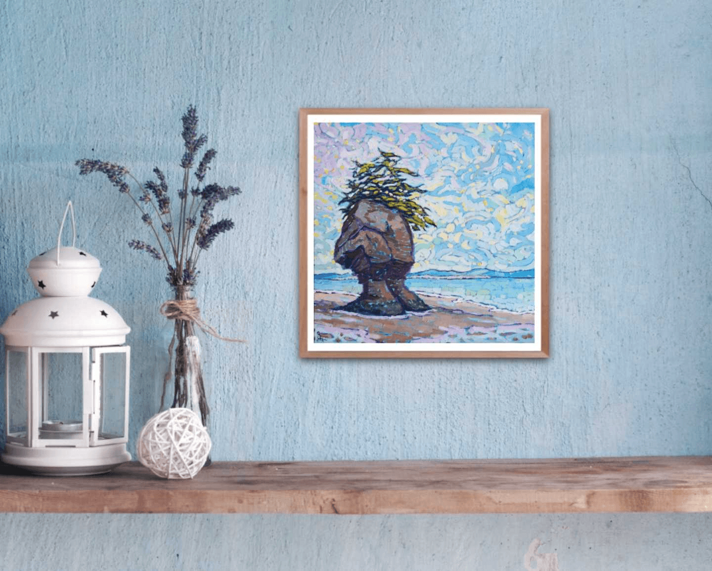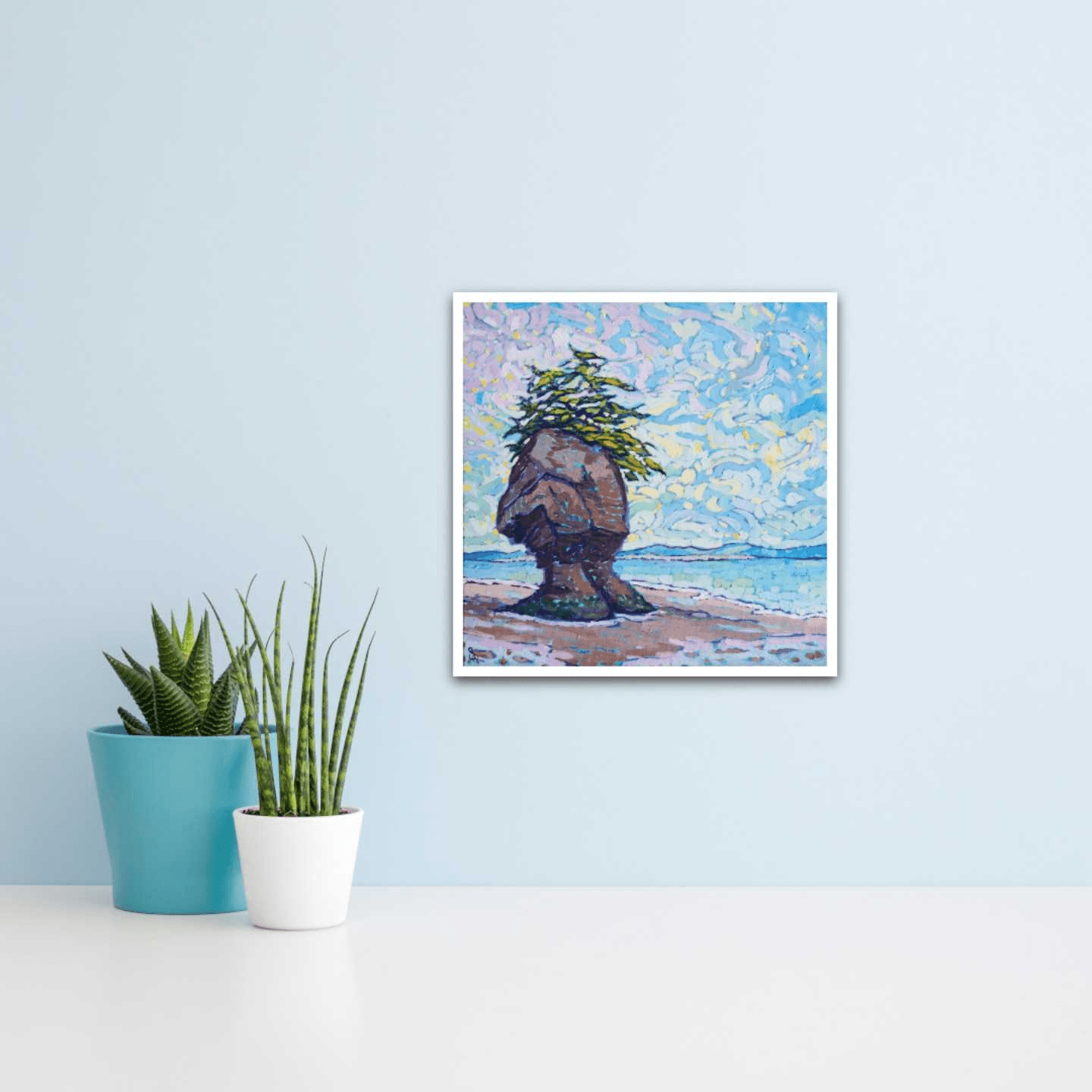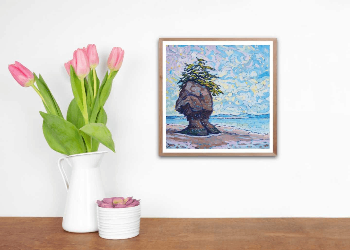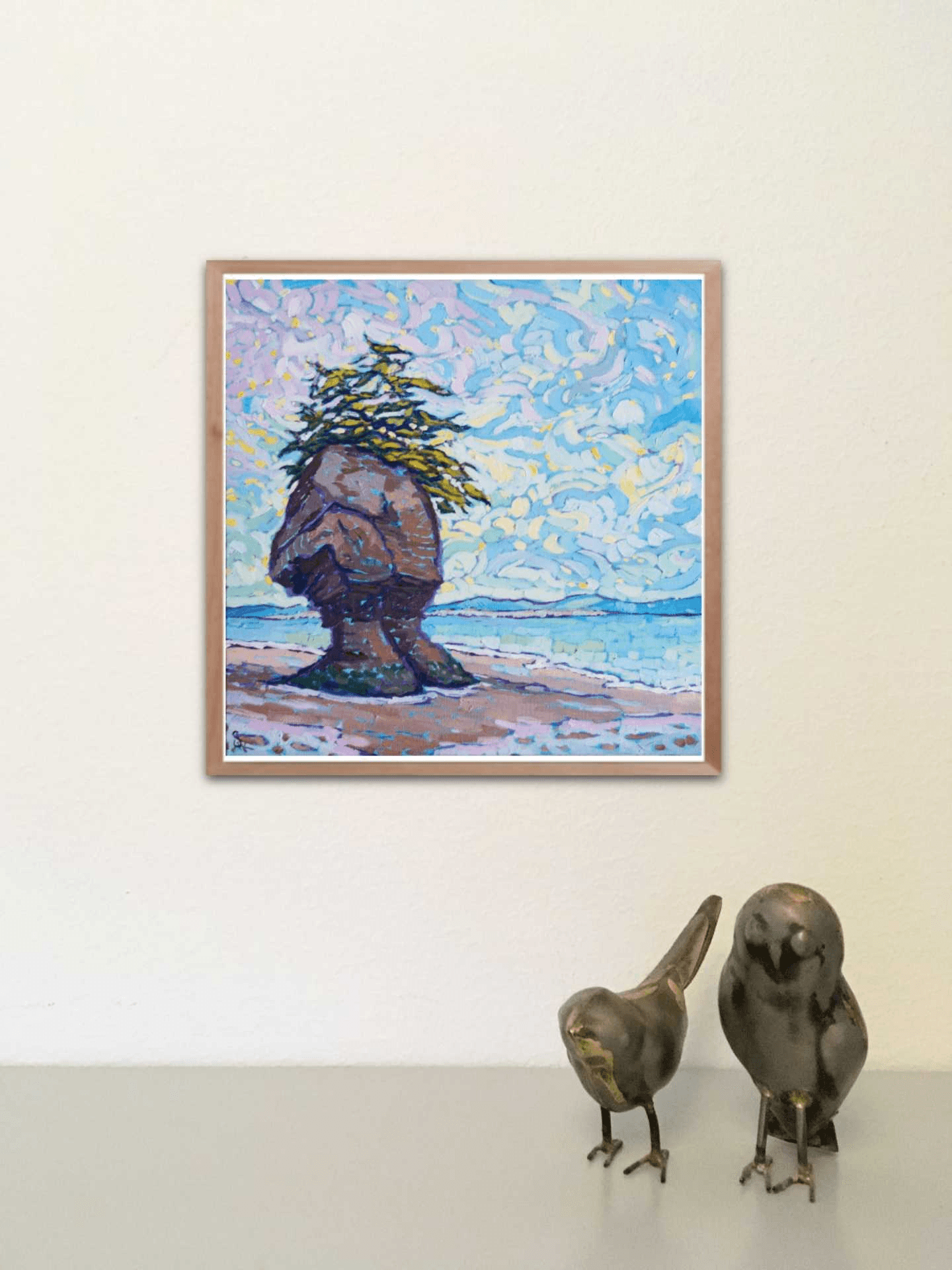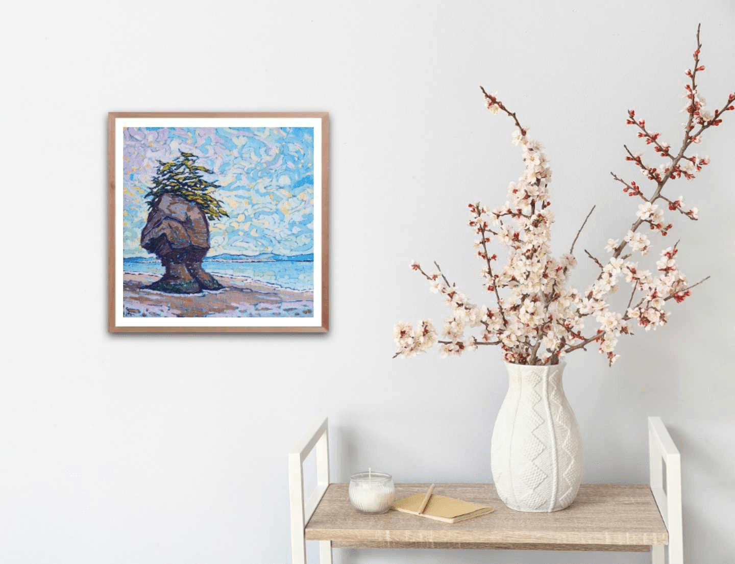 "Spirited Solitude" is all about tranquility, lightness, breeziness, quietude and space. This painting is based on a reference picture I took during my stay in New Brunswick and Nova Scotia and my visit to the wonderful site that is Hopewell Rocks in the Bay of Fundy. This beautiful, other-worldly site inspired me so many times and I always find myself going back to all the pictures I took to produce a new painting with it as my main subject, each time under different light conditions and through a unique perspective. This time I decided to keep it simple but my goal was also to show the grandeur of this place. I hope I managed to achieve that.