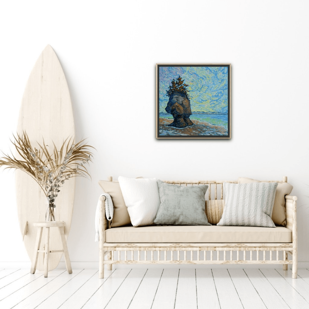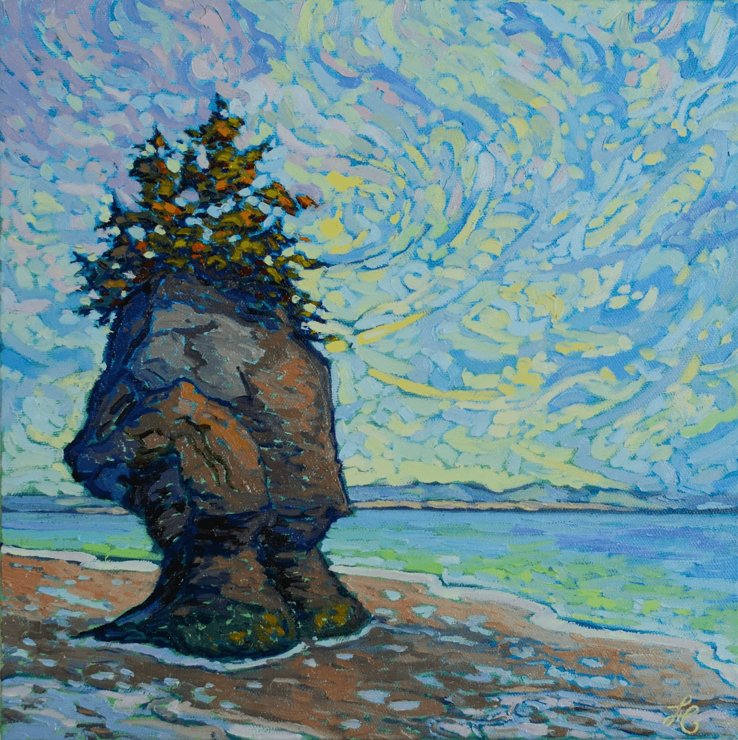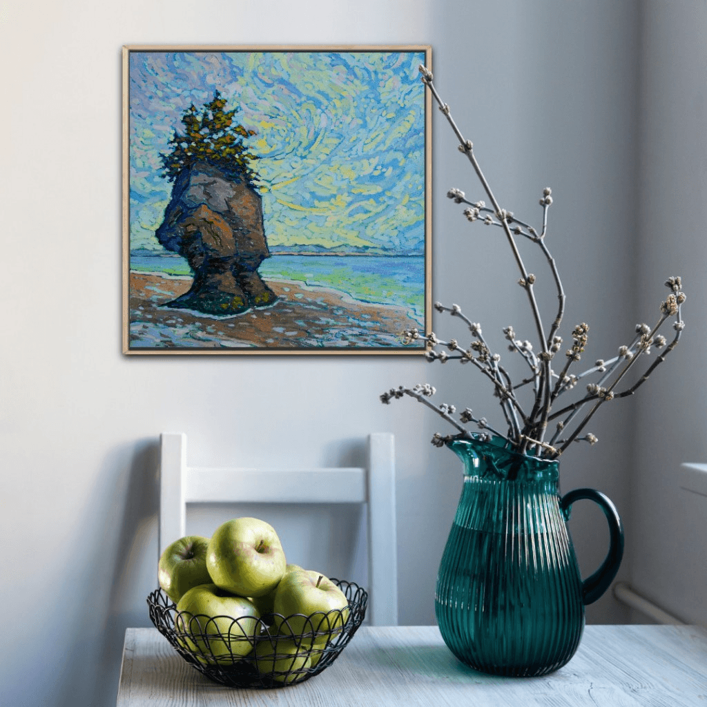I have already painted this exact same scene a couple of years ago. I got so attached to that painting that I decided to keep it and it has been hanging ever since in my living room. I love it so much that I thought it deserves also to be put out there for someone else, hence my decision to paint the same scene again. And this is what came out. This is a serene scene from the coast of the Bay of Fundy in company of one of its famous rocks overlooking the ocean at low tide.