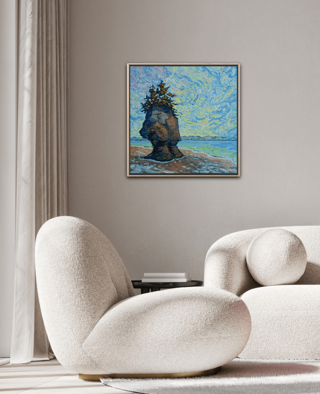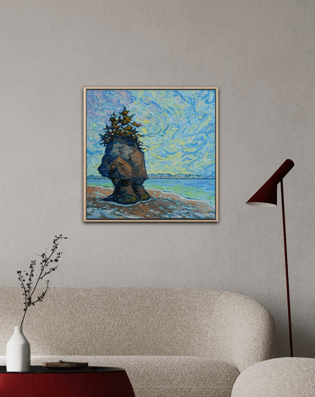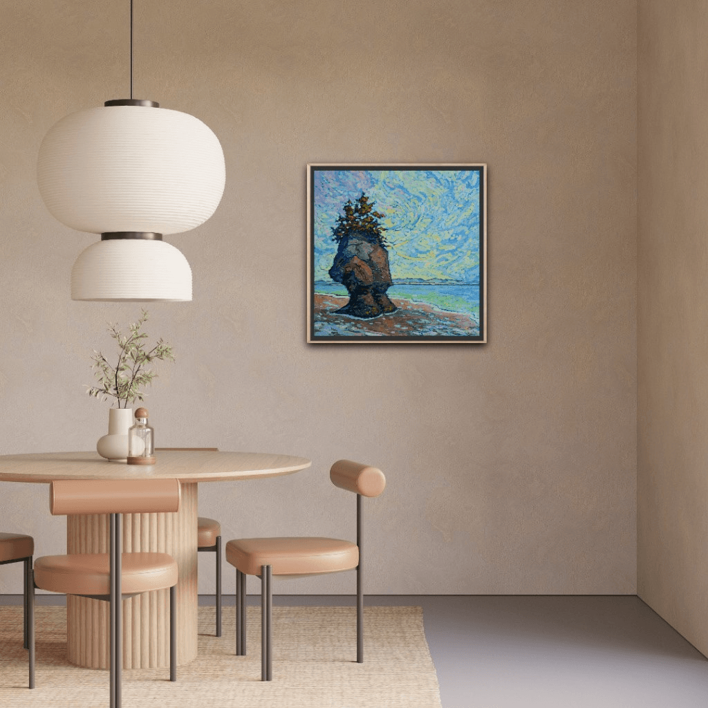 I have already painted this exact same scene a couple of years ago. I got so attached to that painting that I decided to keep it and it has been hanging ever since in my living room. I love it so much that I thought it deserves also to be put out there for someone else, hence my decision to paint the same scene again. And this is what came out. This is a serene scene from the coast of the Bay of Fundy in company of one of its famous rocks overlooking the ocean at low tide.