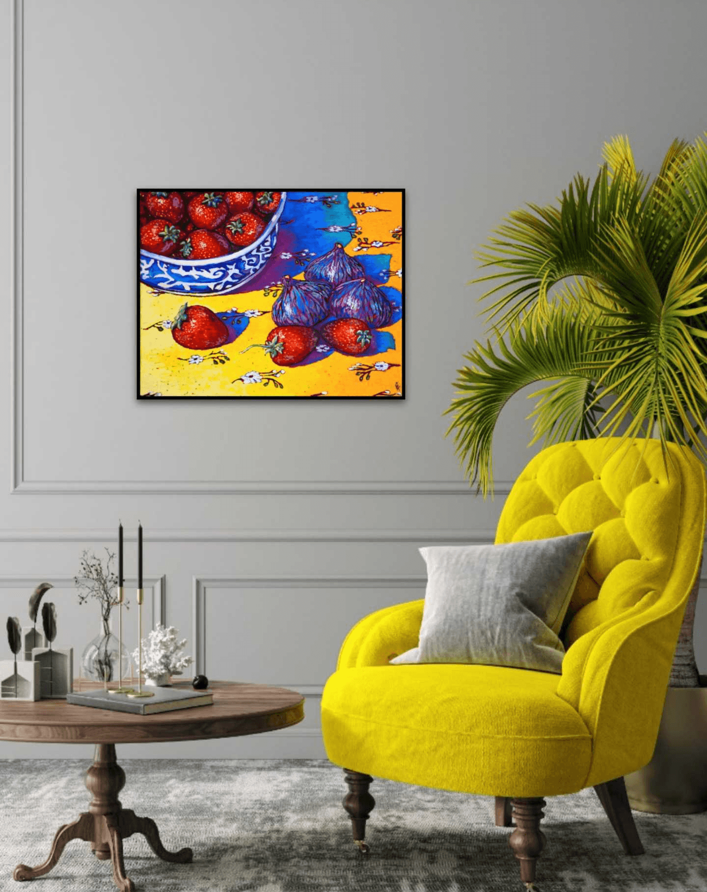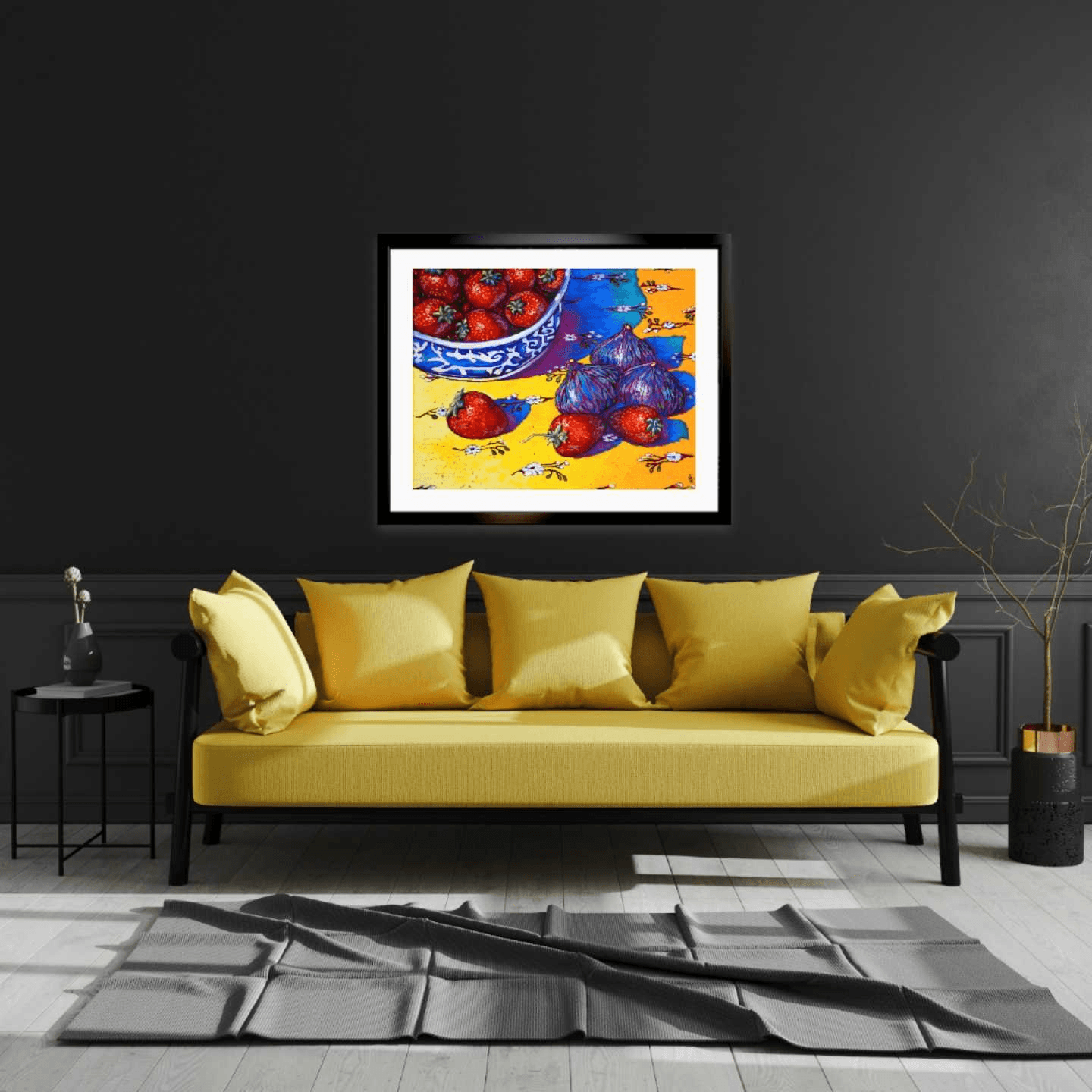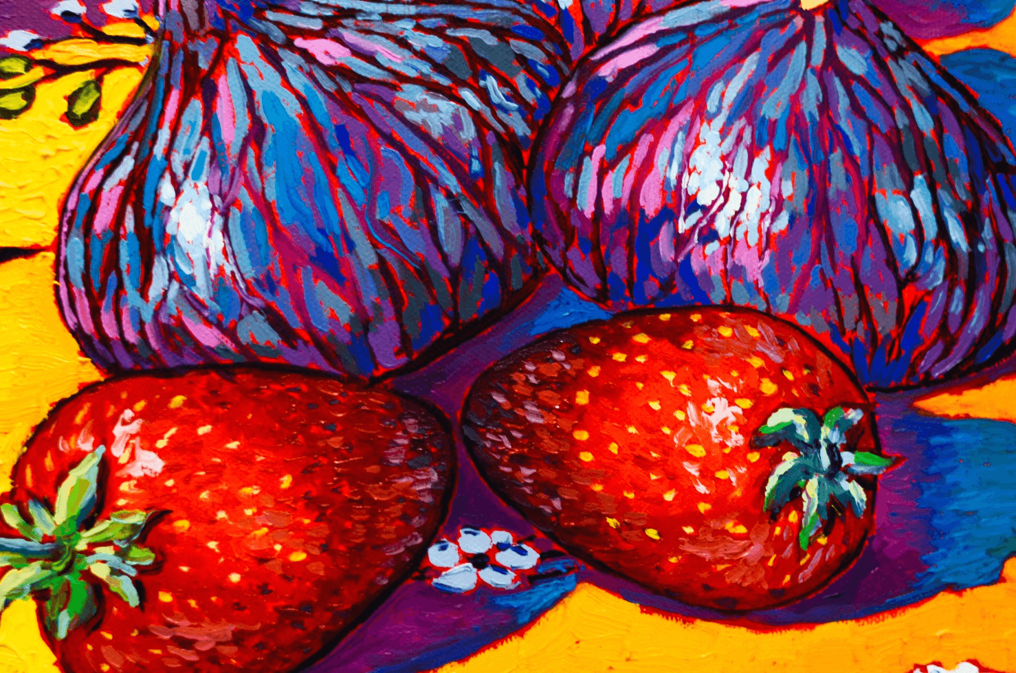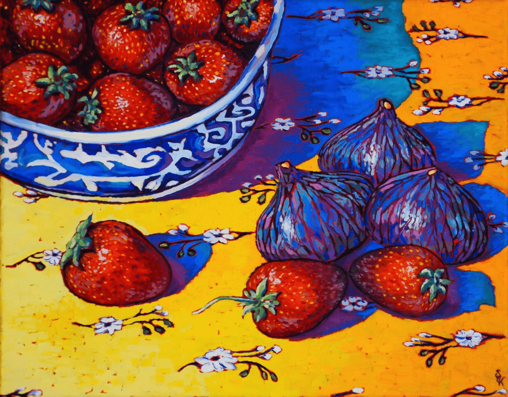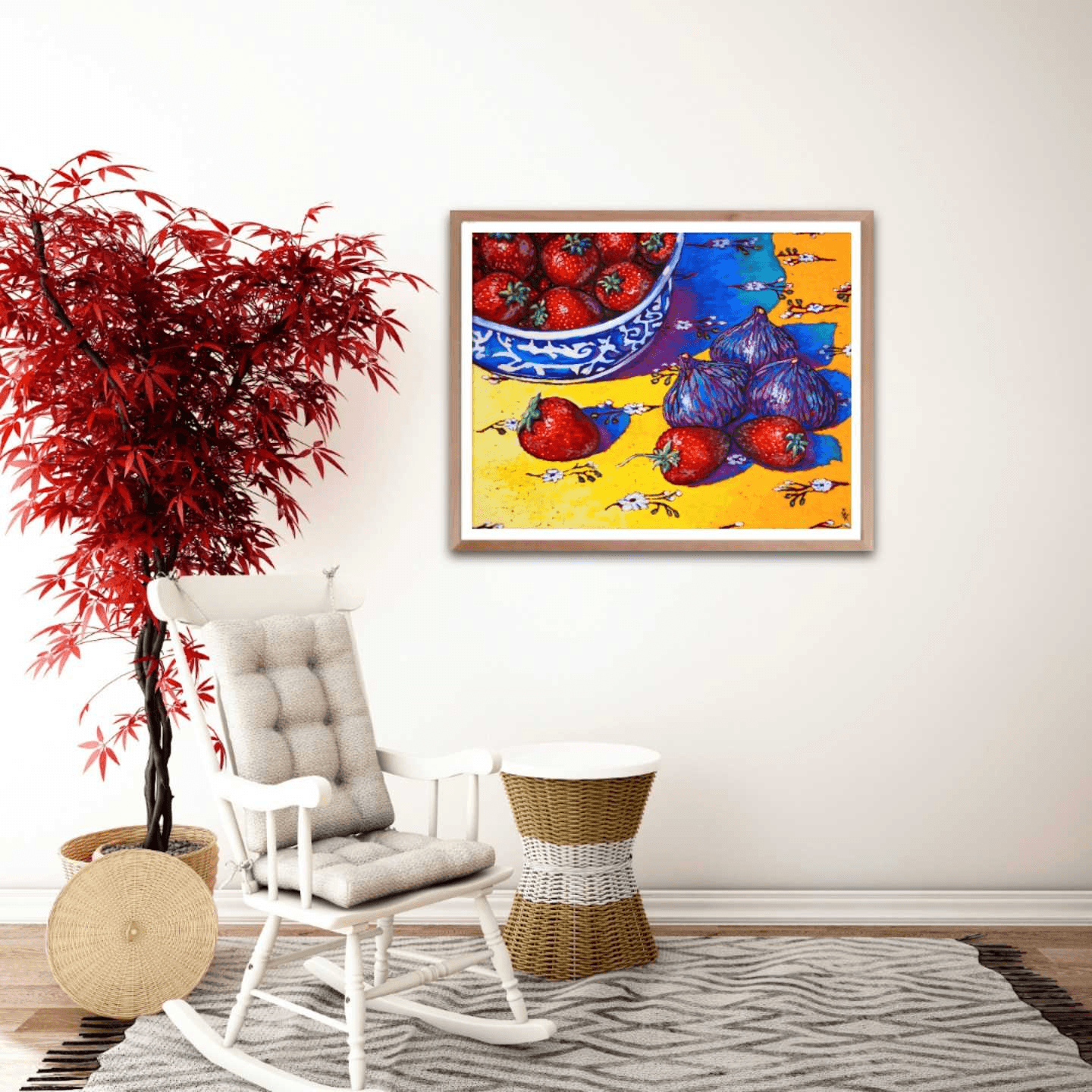 A lovely collection of fresh, juicy strawberries and figs, set against a vibrant yellow background with an amazing play of colors in the bright and shadow sections of the painting. This still life is one of my favorites and its beautiful, rich colors would add a lovely accent to any home.
