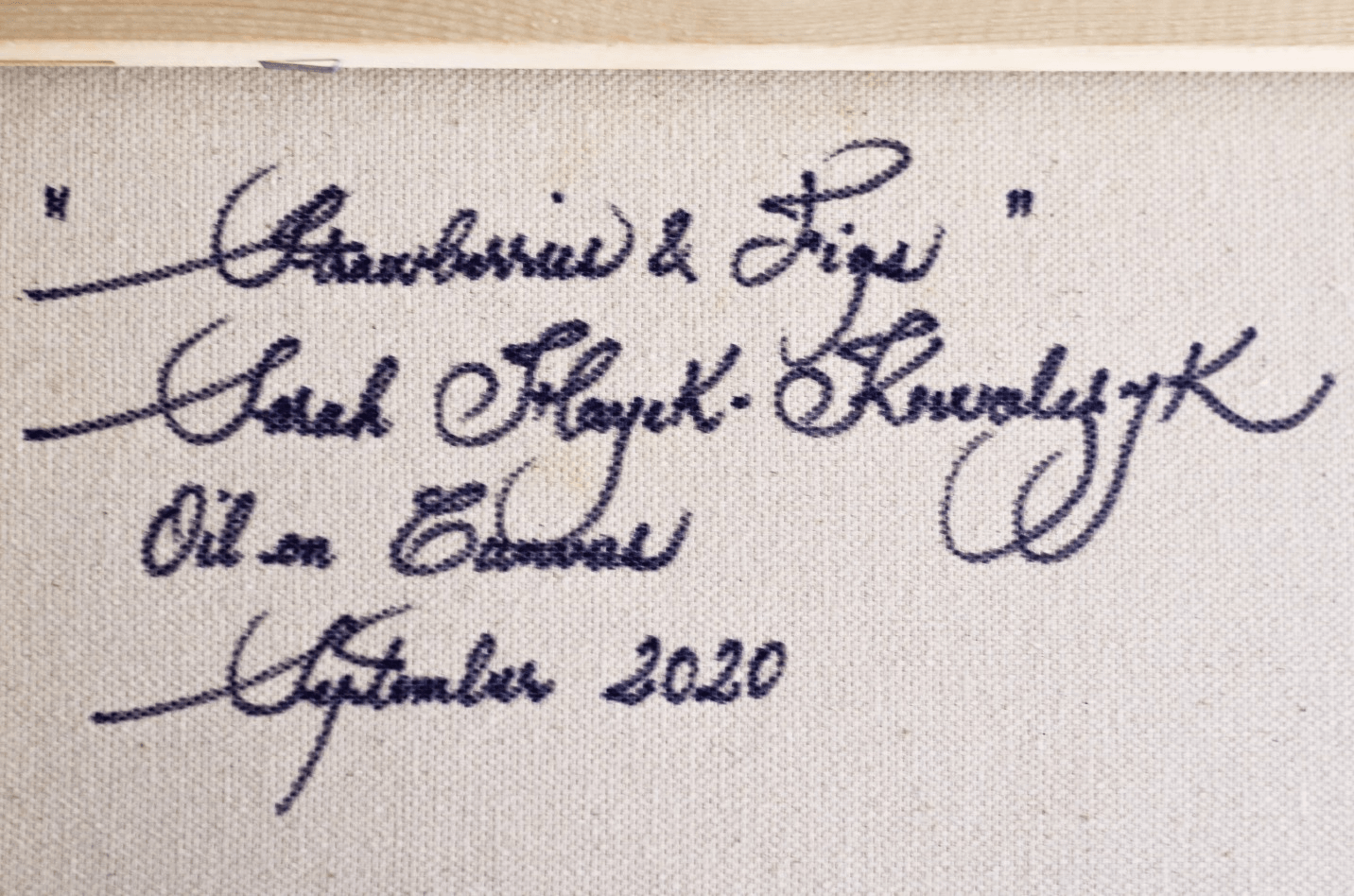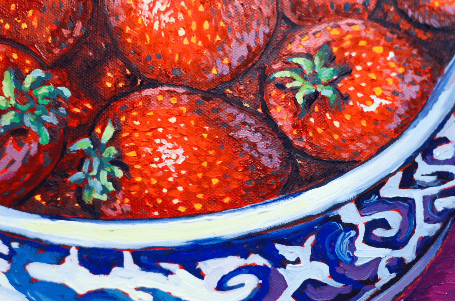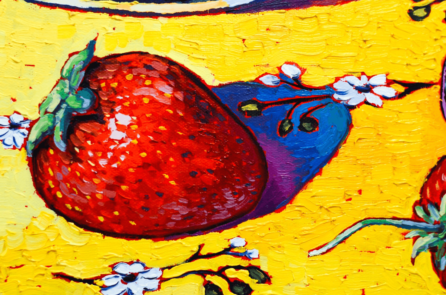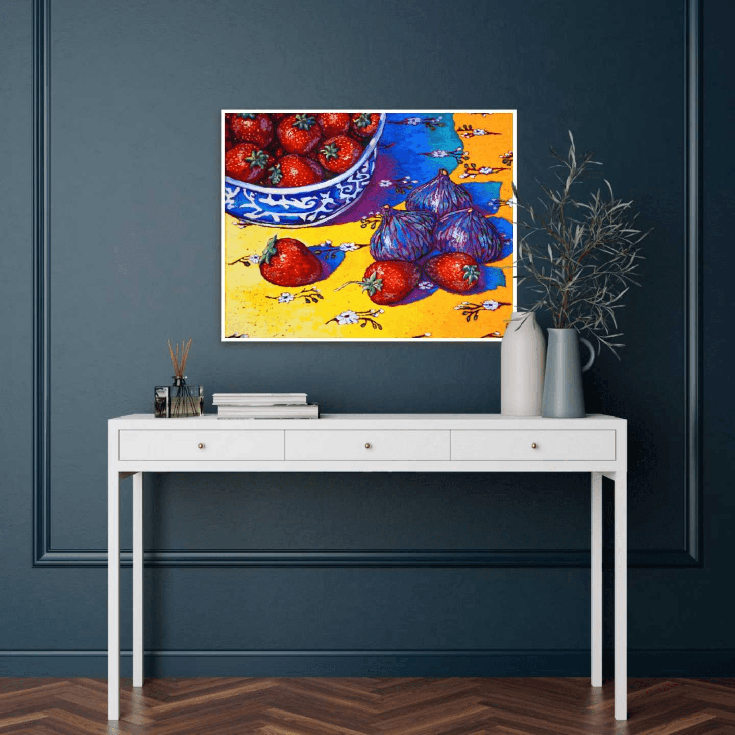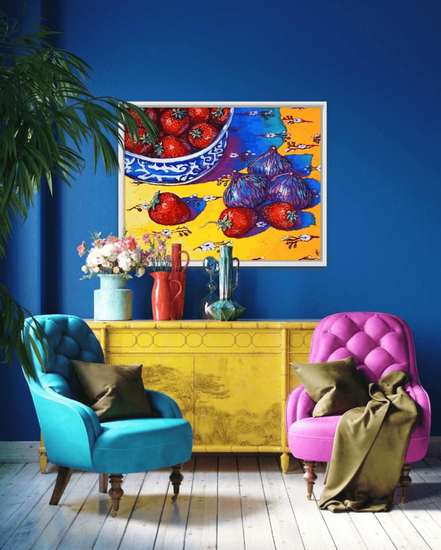 A lovely collection of fresh, juicy strawberries and figs, set against a vibrant yellow background with an amazing play of colors in the bright and shadow sections of the painting. This still life is one of my favorites and its beautiful, rich colors would add a lovely accent to any home.