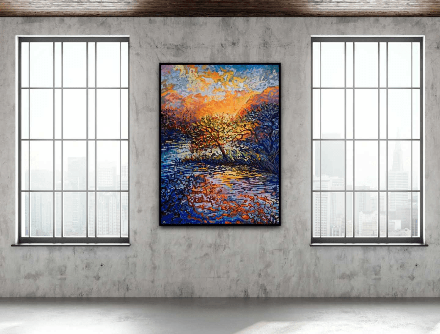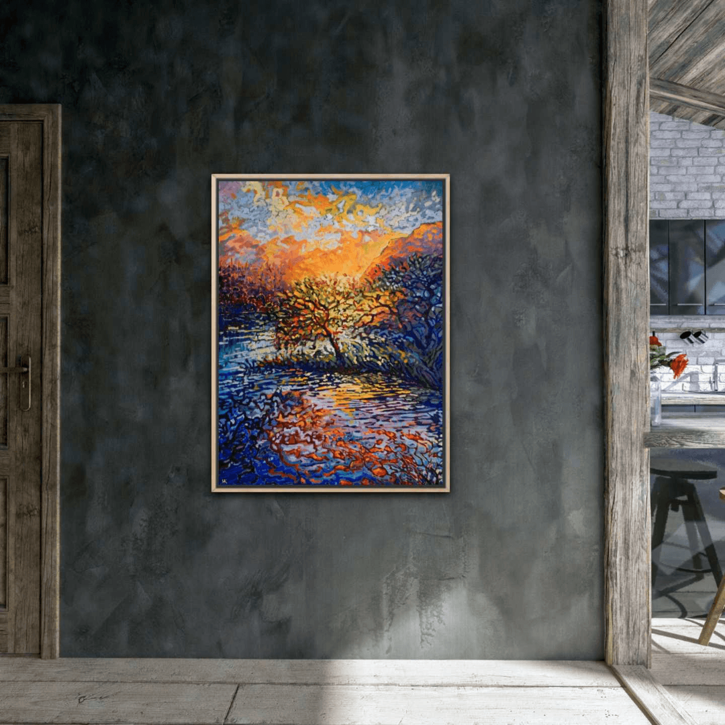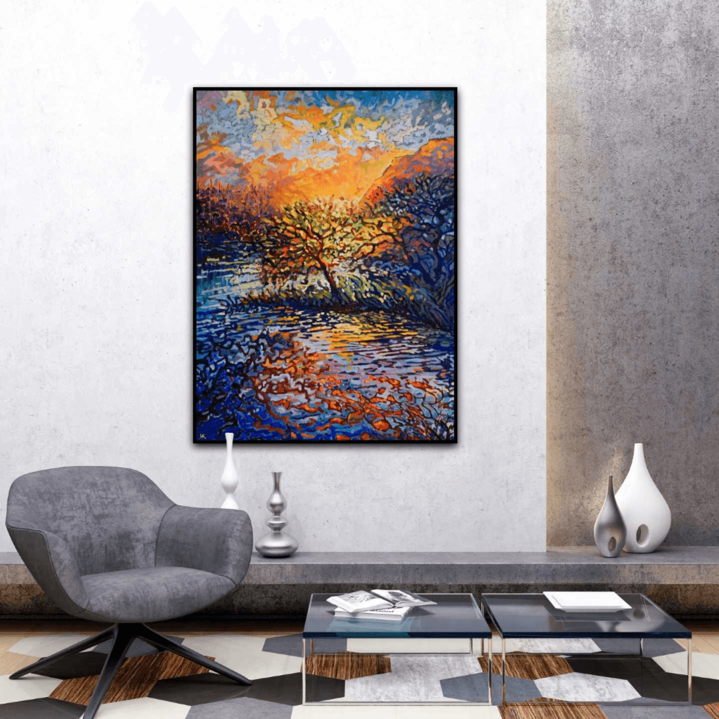 A bright, brilliant sun peaks through the hills and thick branches of trees, casting its rays like arms reaching out across the clouds in the skies and through the leaves to create a dazzling display on the surface of the dormant water. The thick brushstrokes in this painting are laid generously with paint to create a beautiful effect on canvas.