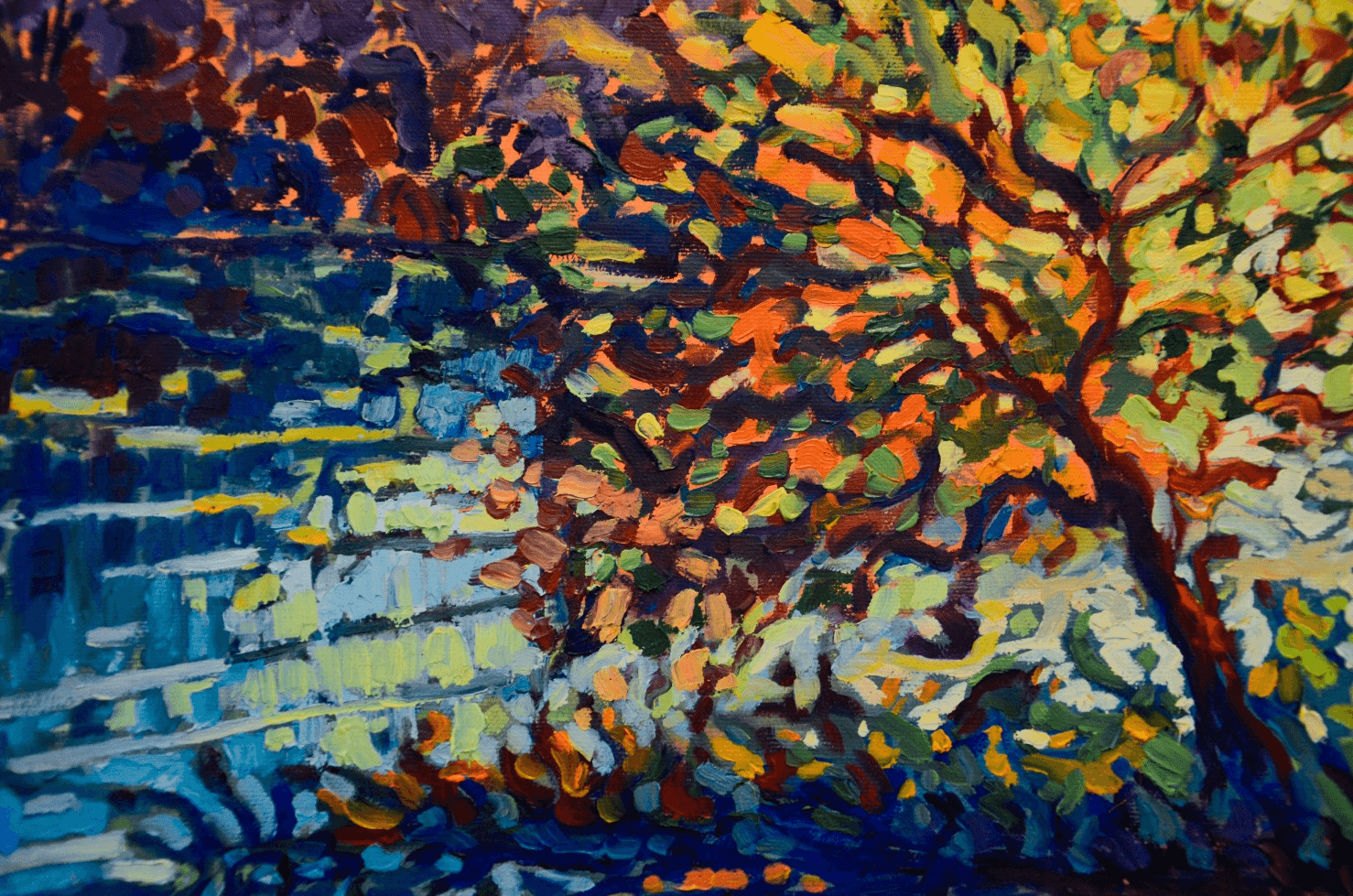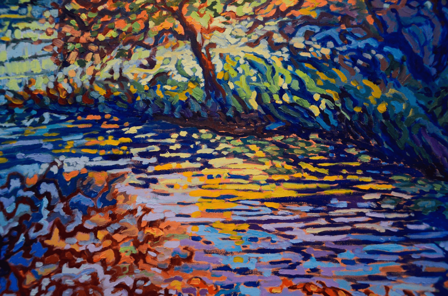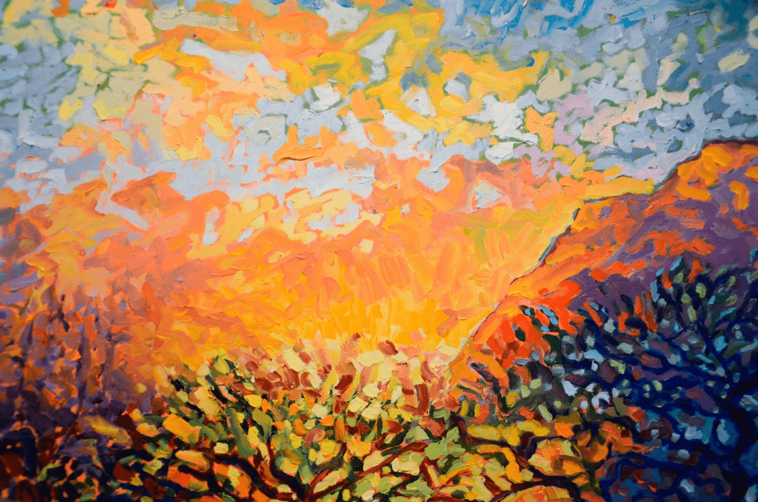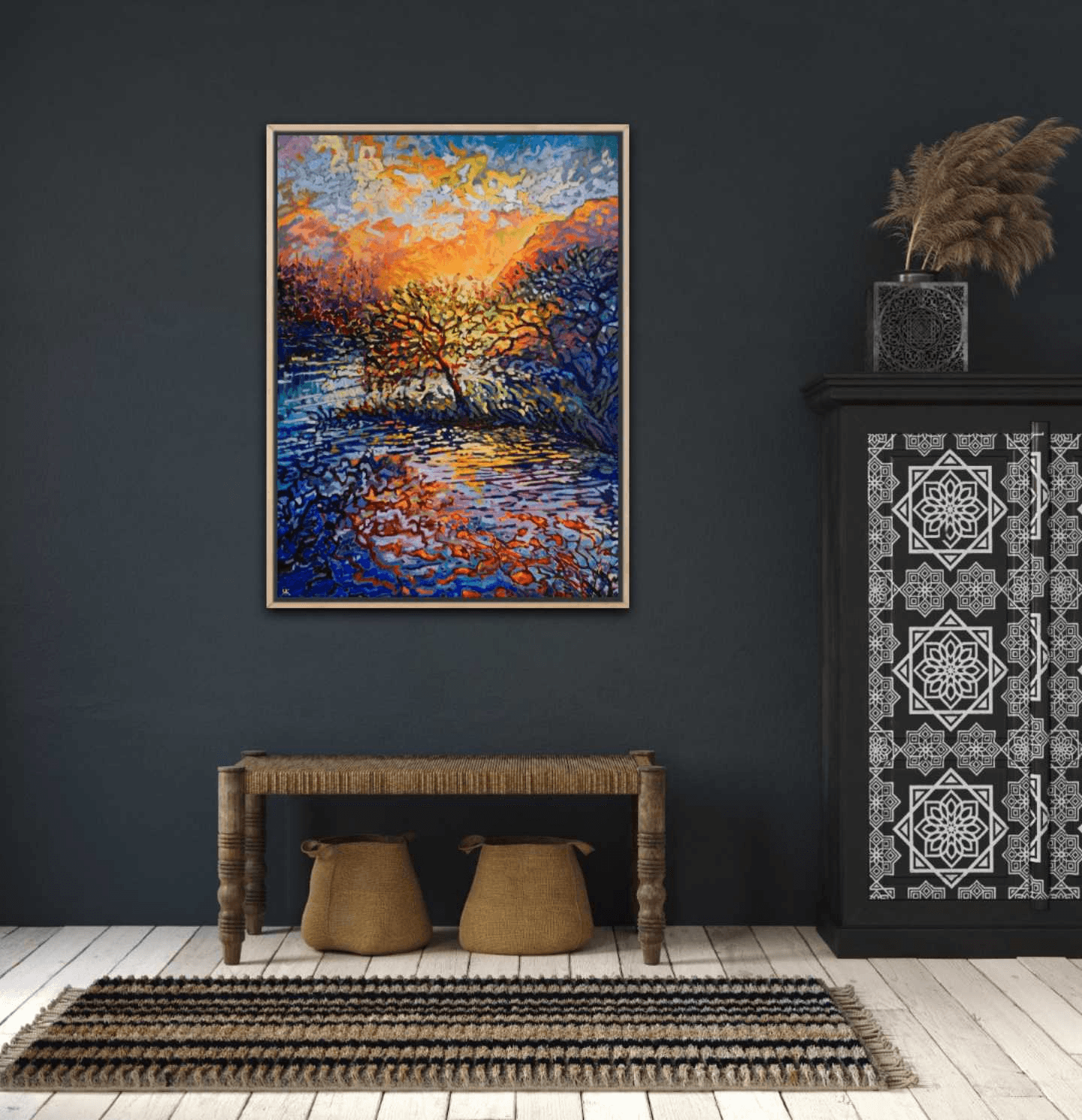 A bright, brilliant sun peaks through the hills and thick branches of trees, casting its rays like arms reaching out across the clouds in the skies and through the leaves to create a dazzling display on the surface of the dormant water. The thick brushstrokes in this painting are laid generously with paint to create a beautiful effect on canvas.
