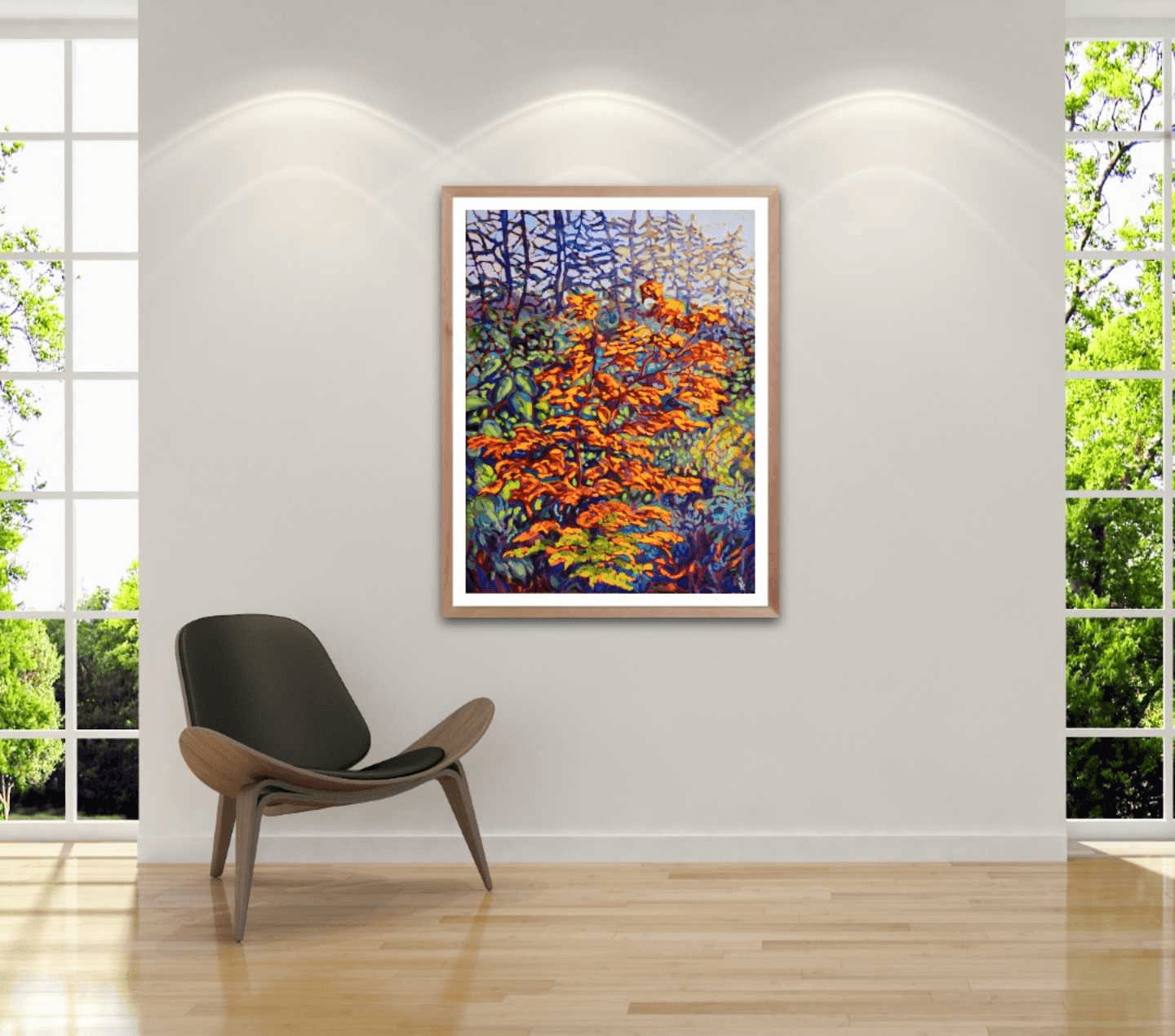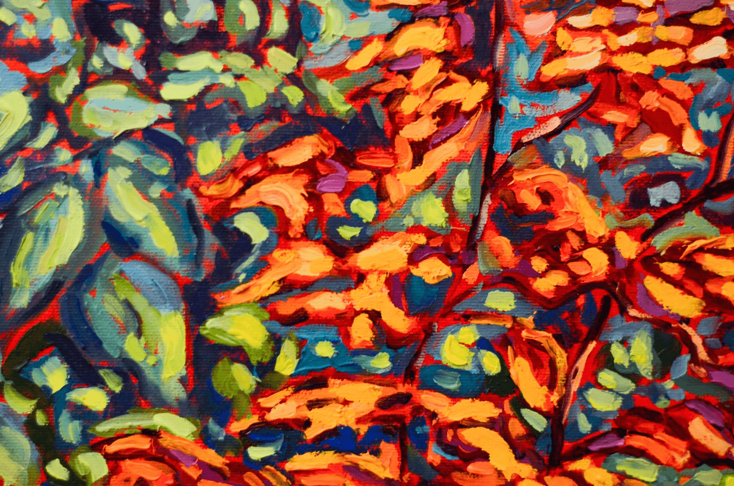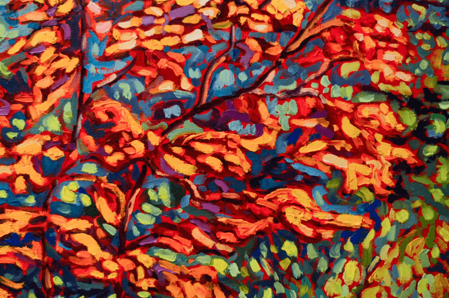 Autumn is a mesmerizing season! Just when you think that nature cannot be more enchanting, it stuns you with all those wonderfully unbelievable colors and contrasts. I collect many reference pictures during my hikes and as an ode to the joys and pleasures that fall brings and to the beauty of nature during that special season, I created this painting, displaying the gorgeous contrast between yellowed leaves against a still green, sun-kissed background, reaching out to a clear sky through a collection of twirling pine trees.