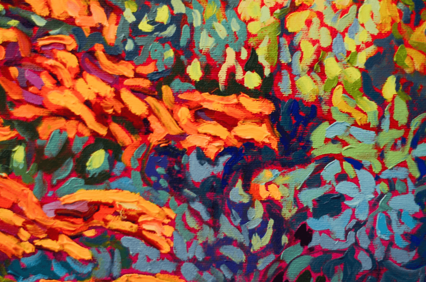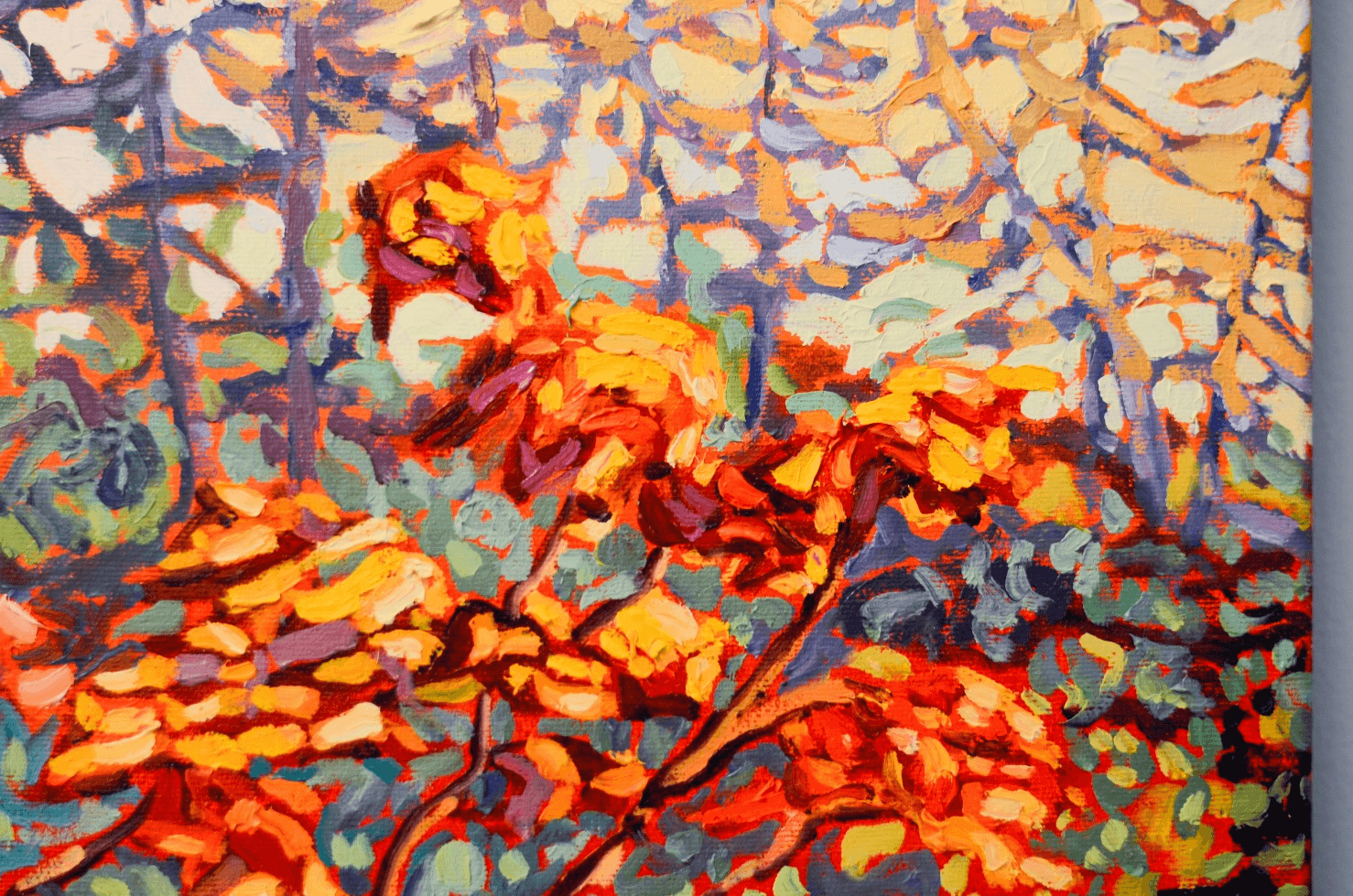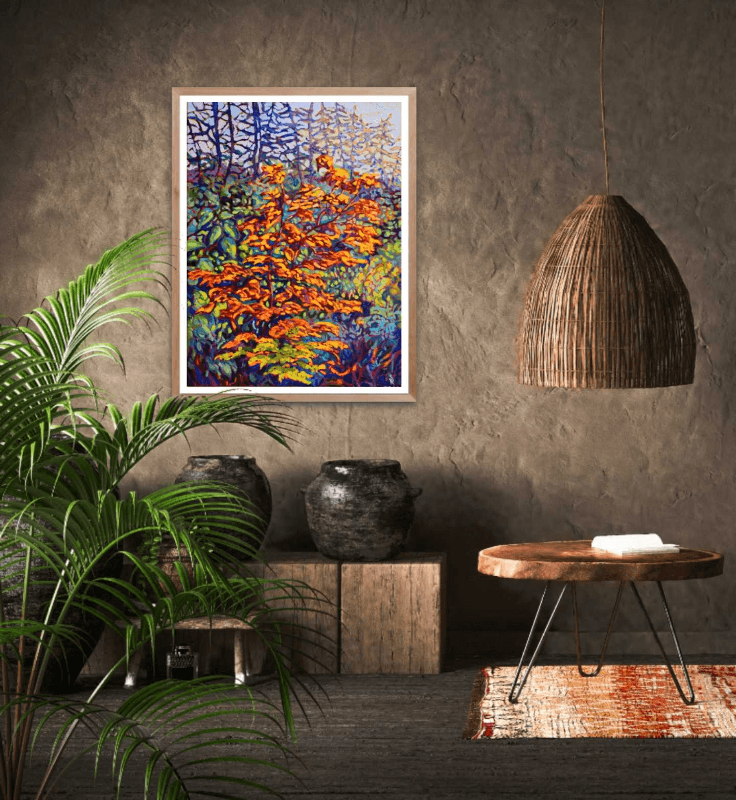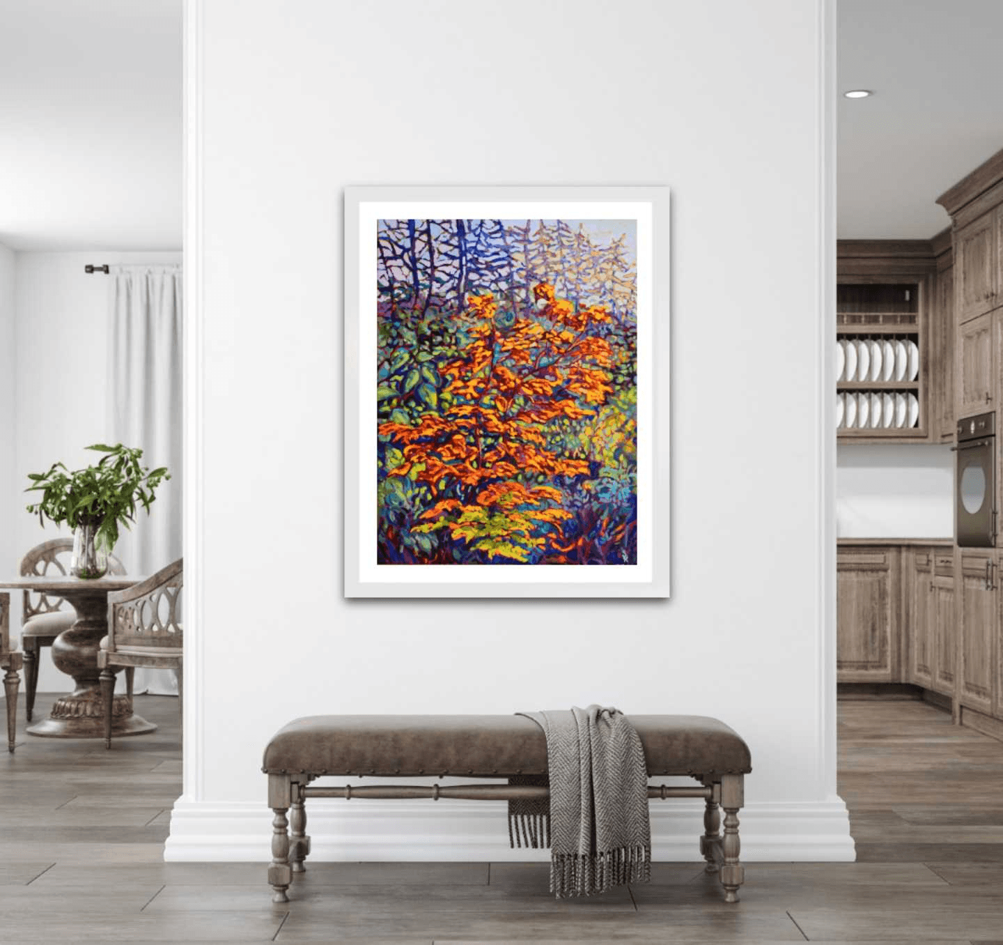 Autumn is a mesmerizing season! Just when you think that nature cannot be more enchanting, it stuns you with all those wonderfully unbelievable colors and contrasts. I collect many reference pictures during my hikes and as an ode to the joys and pleasures that fall brings and to the beauty of nature during that special season, I created this painting, displaying the gorgeous contrast between yellowed leaves against a still green, sun-kissed background, reaching out to a clear sky through a collection of twirling pine trees.