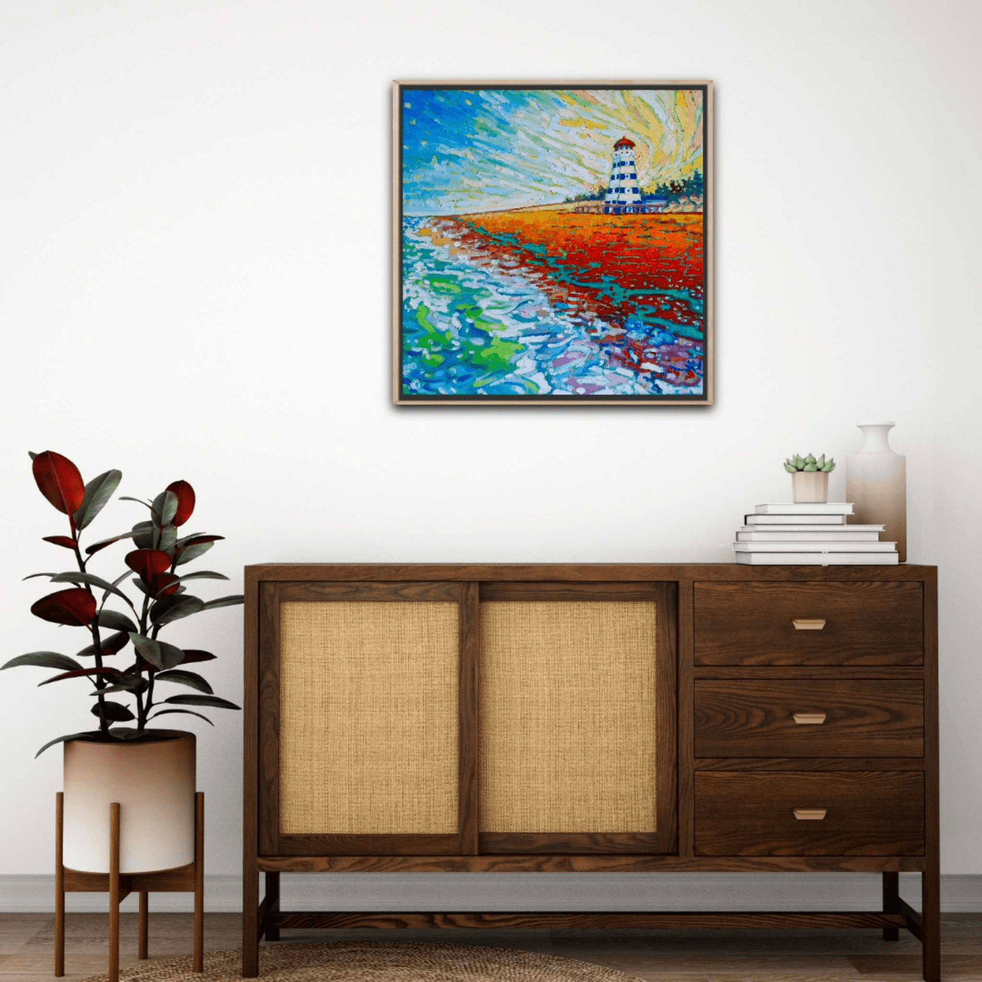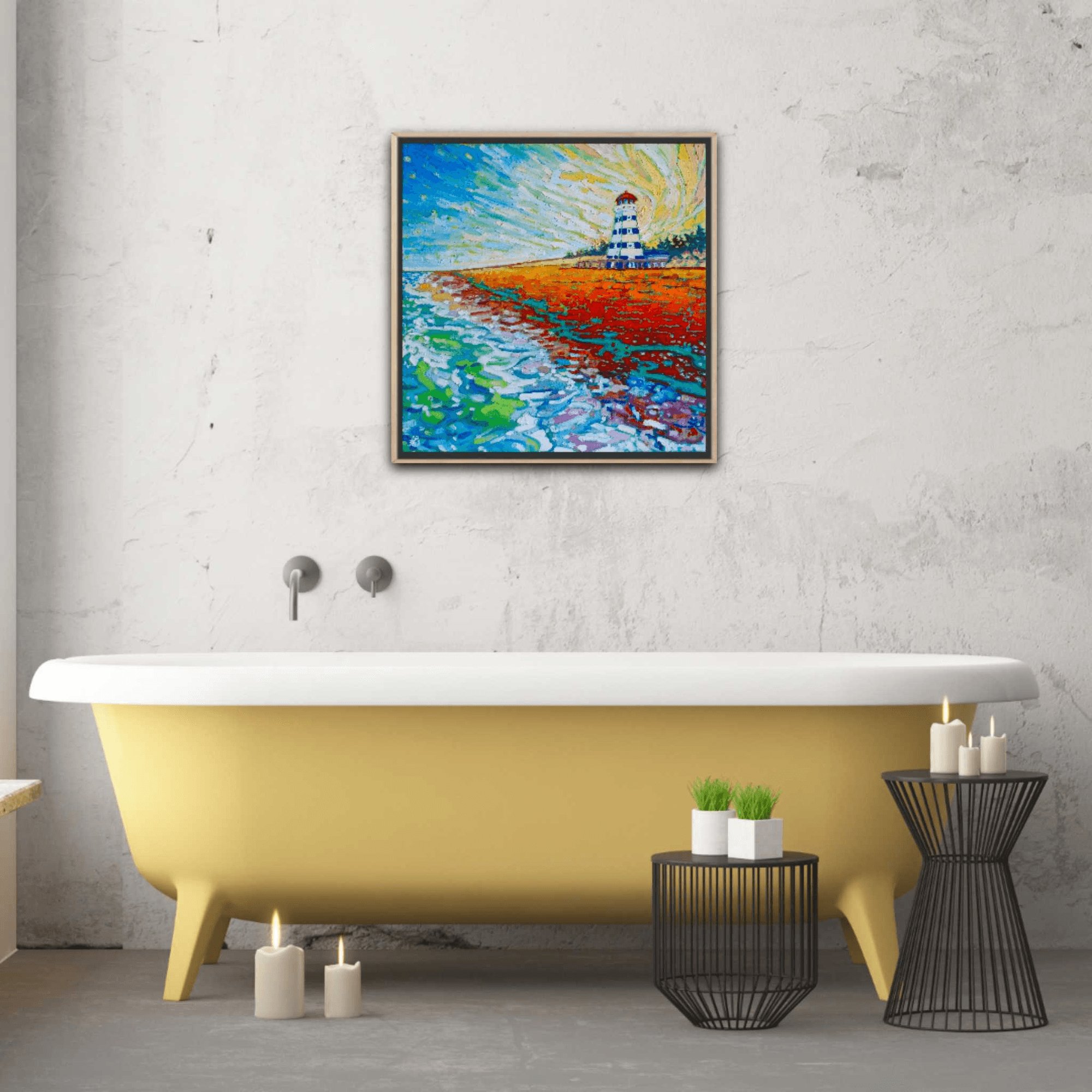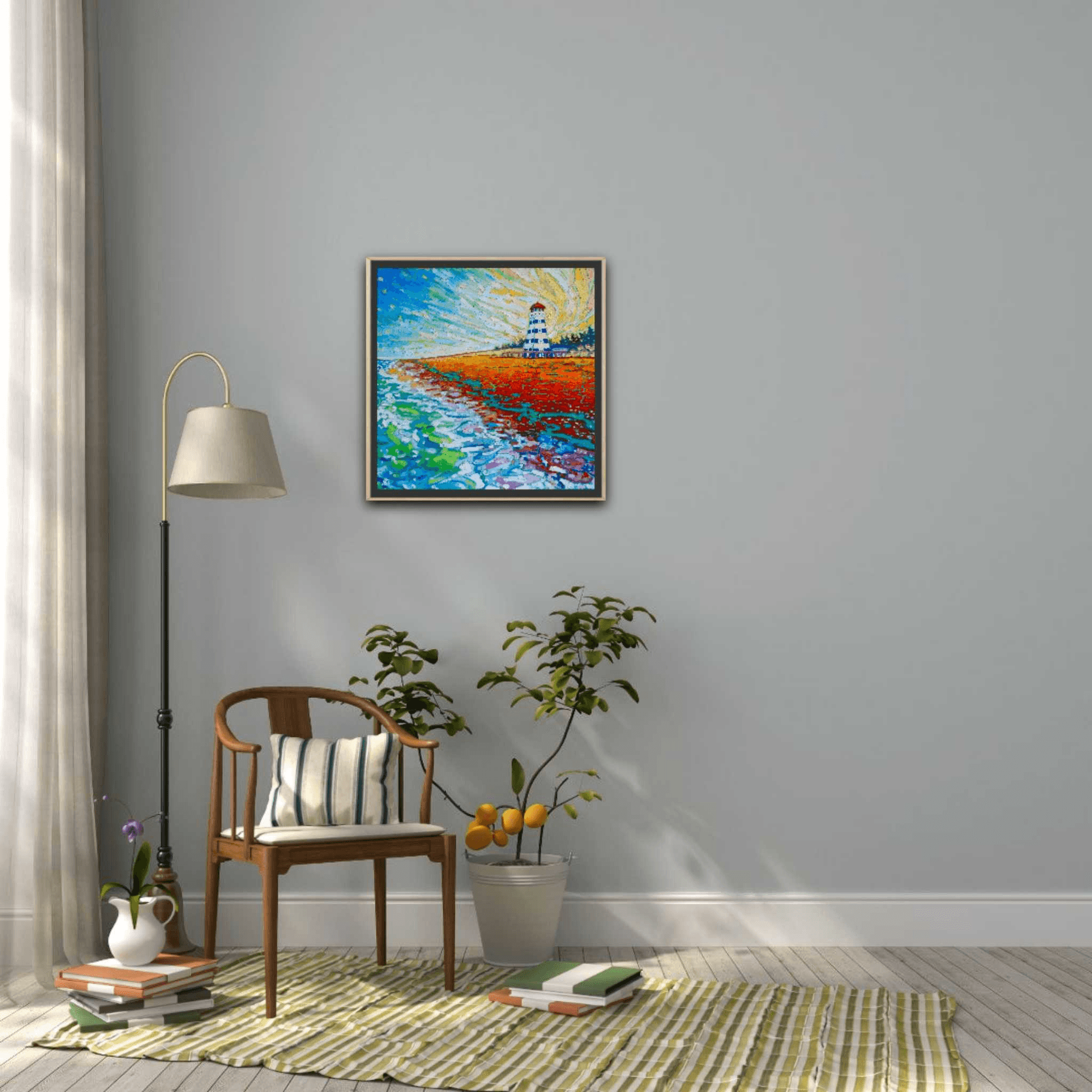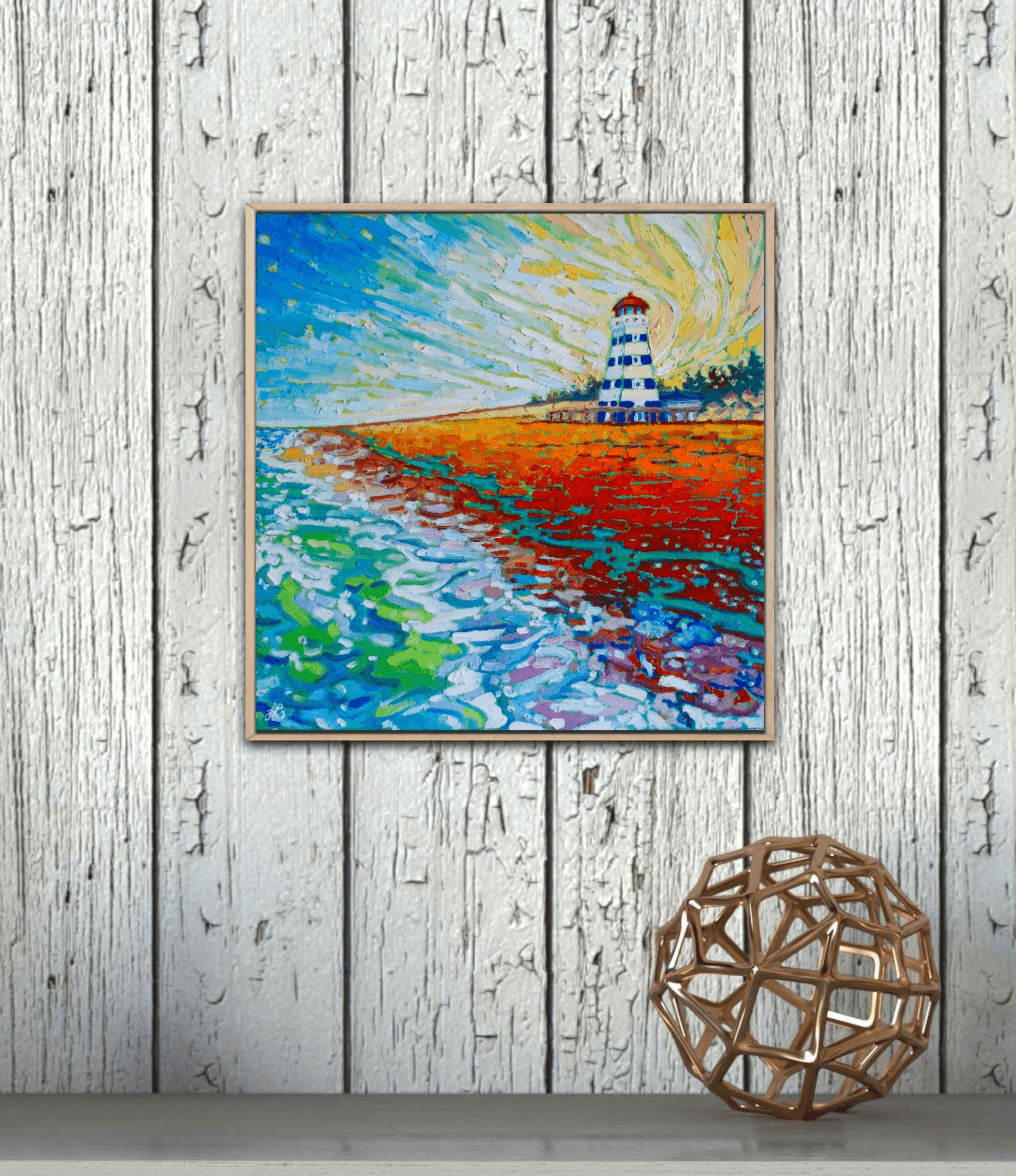 "The Four Elements II" displays the beauty of the beaches of Prince Edward Island. West Point Beach with its red sand covered in seashells, and its famous lighthouse overlooking the shore is skillfully framed by the movement of the waves in the foreground, mirrored by the clouds in motion in the background. This painting would be a great addition to your home, adding charm, beauty and magic.