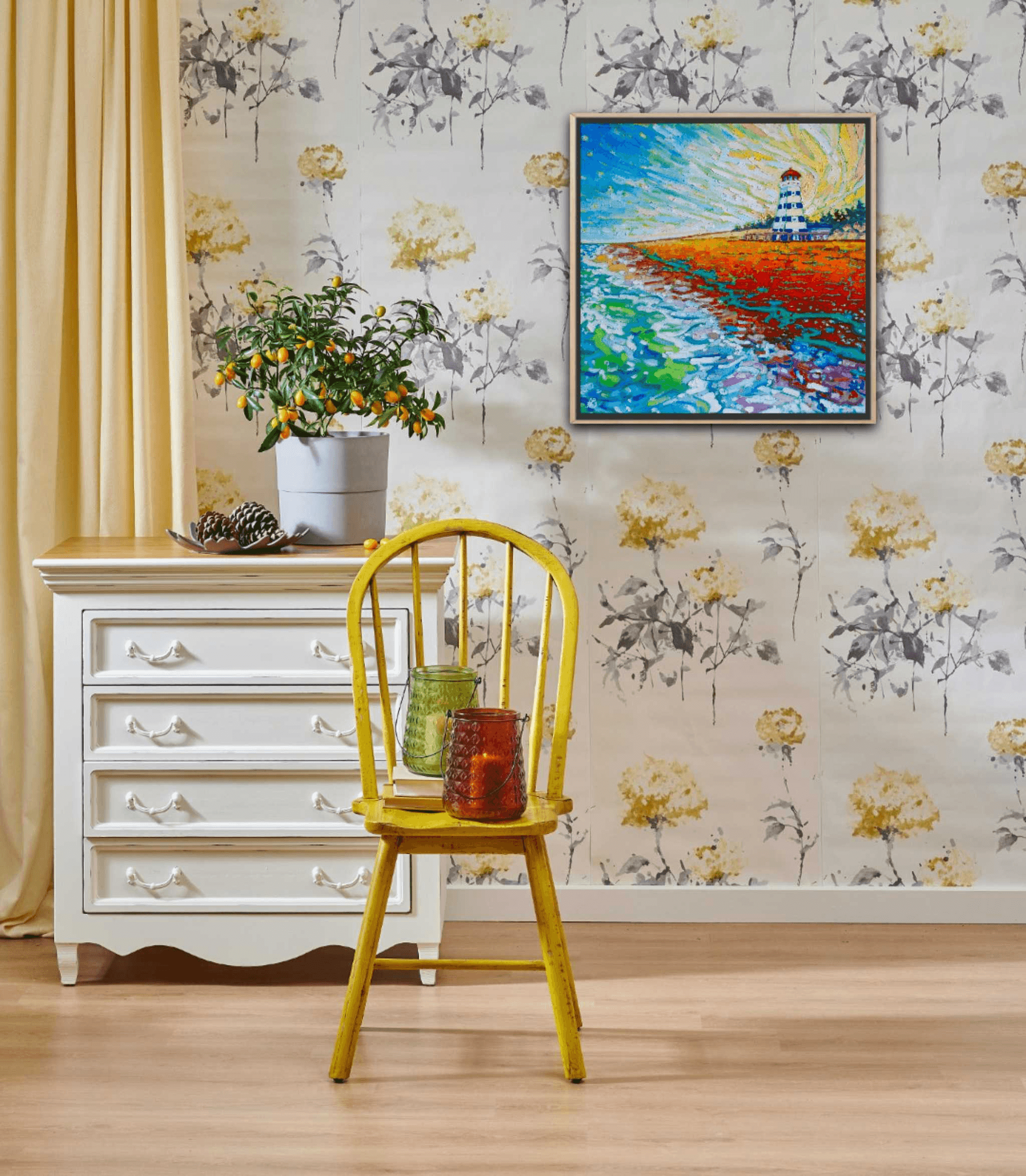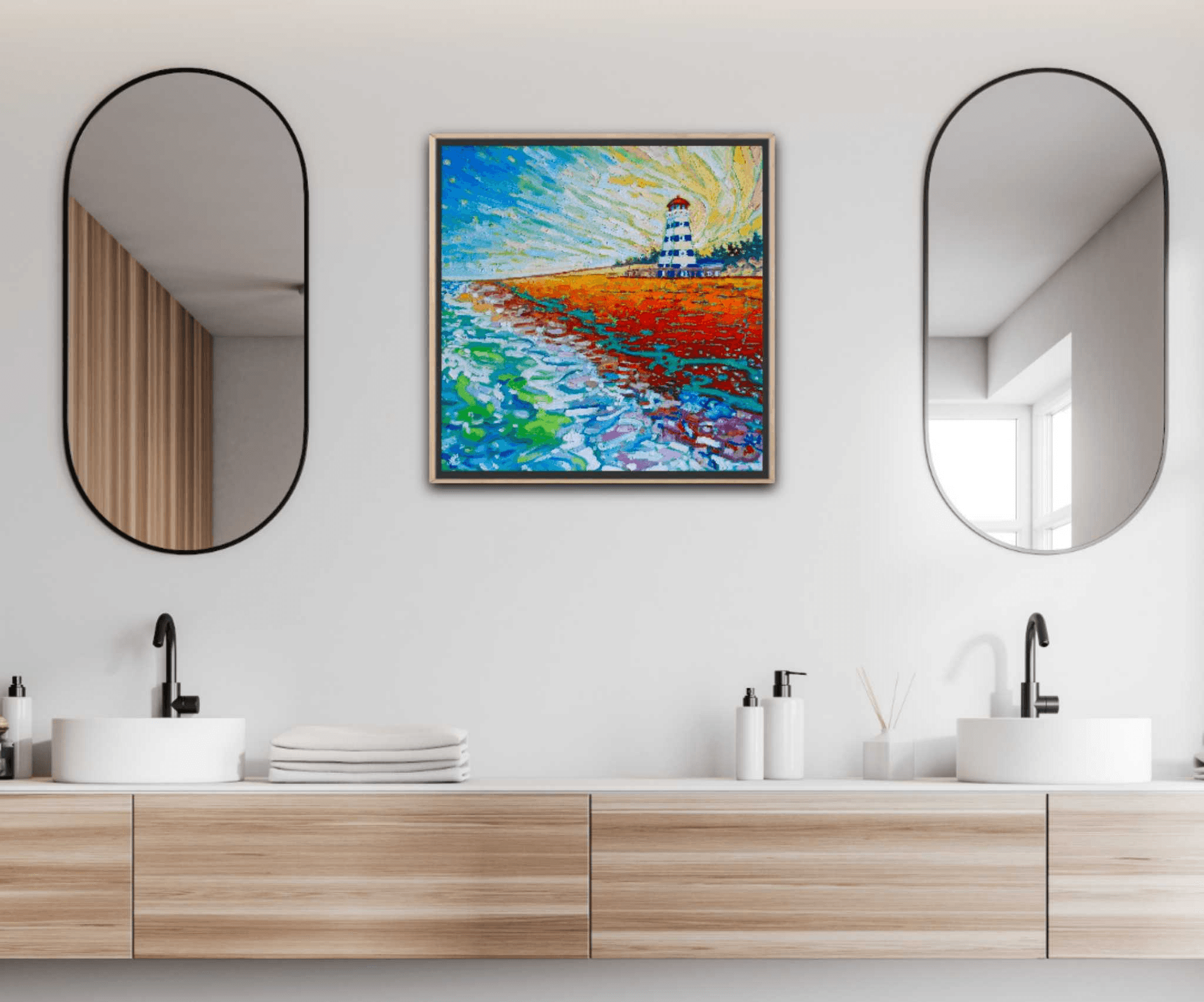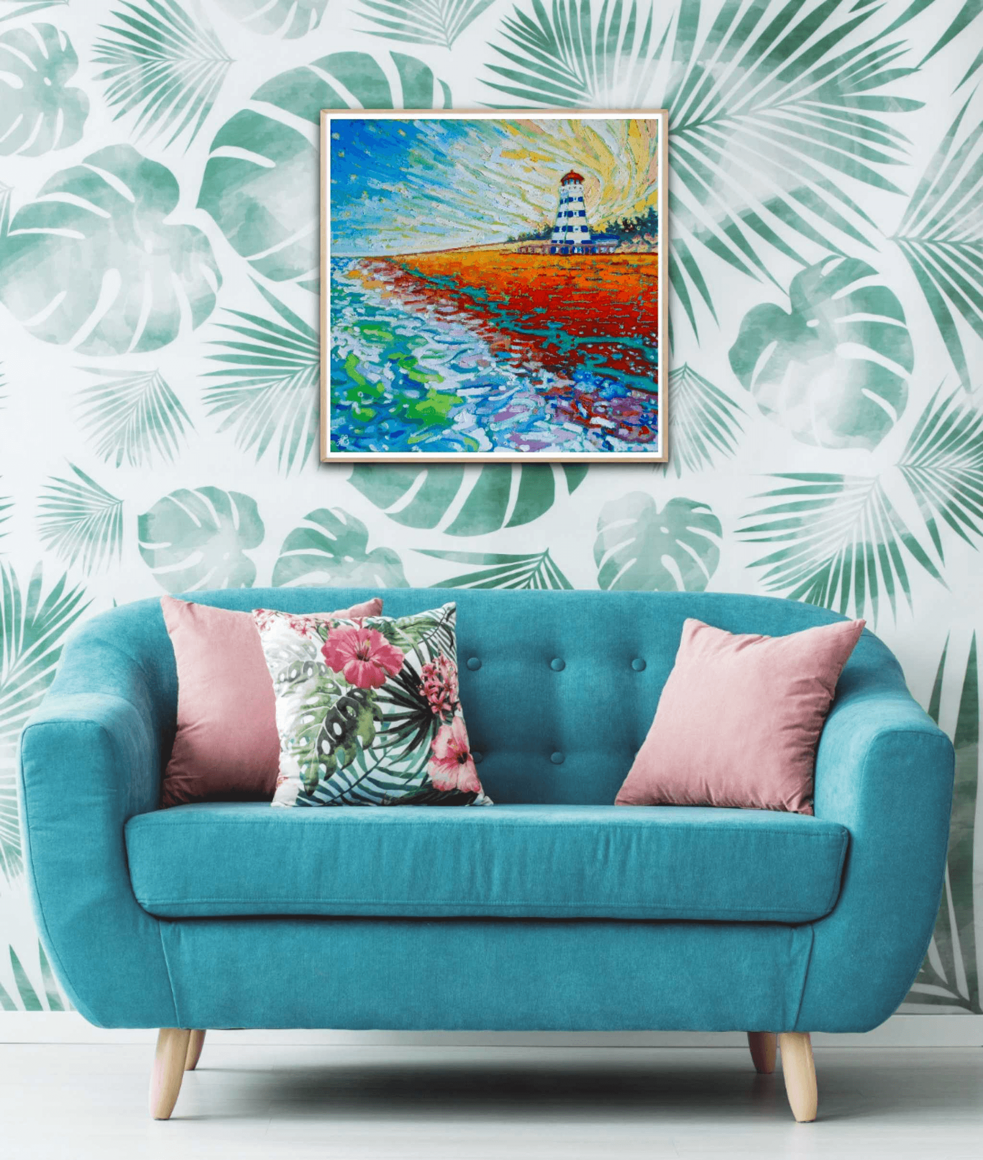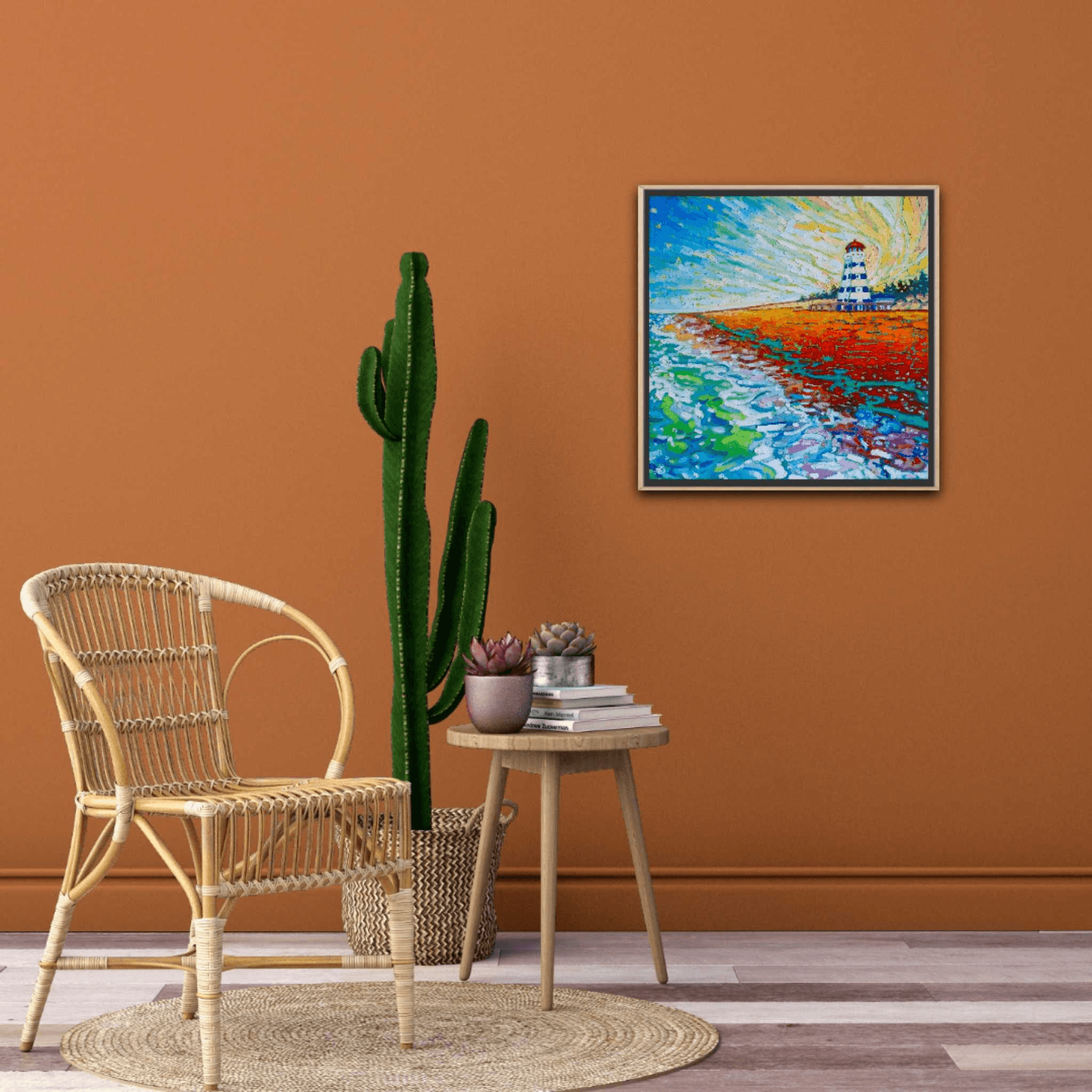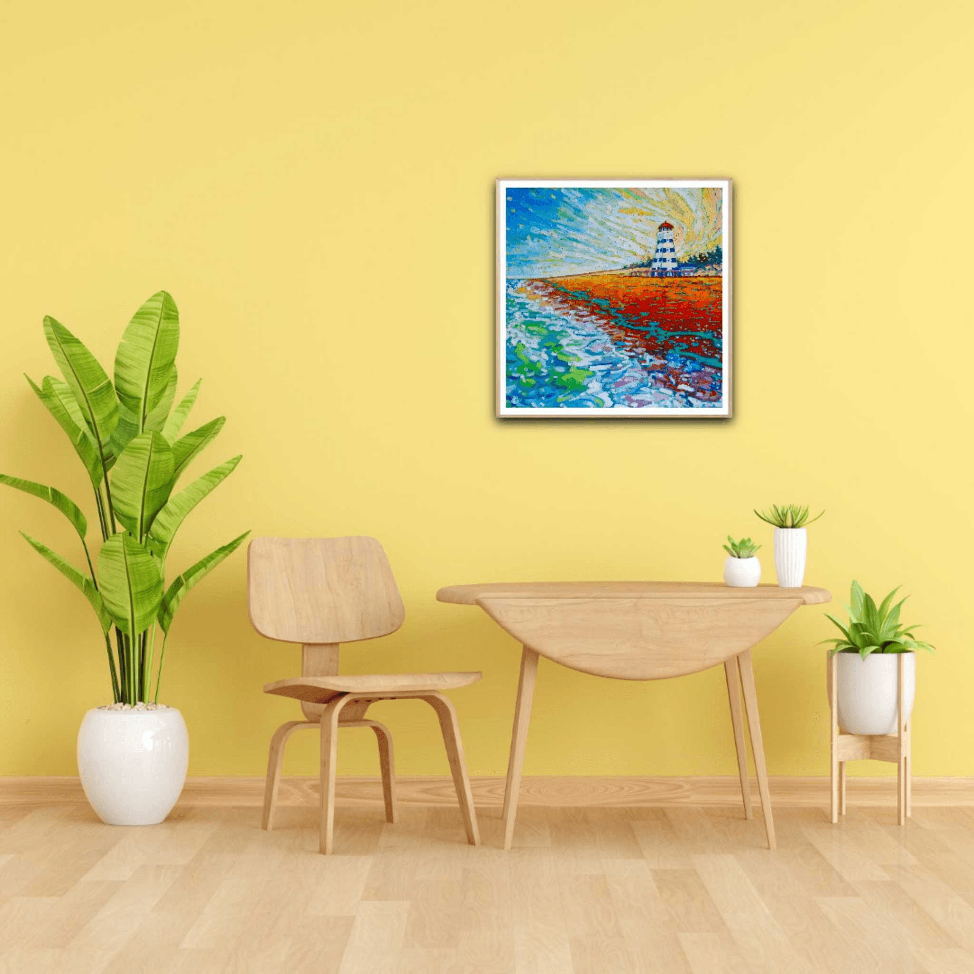 "The Four Elements II" displays the beauty of the beaches of Prince Edward Island. West Point Beach with its red sand covered in seashells, and its famous lighthouse overlooking the shore is skillfully framed by the movement of the waves in the foreground, mirrored by the clouds in motion in the background. This painting would be a great addition to your home, adding charm, beauty and magic.