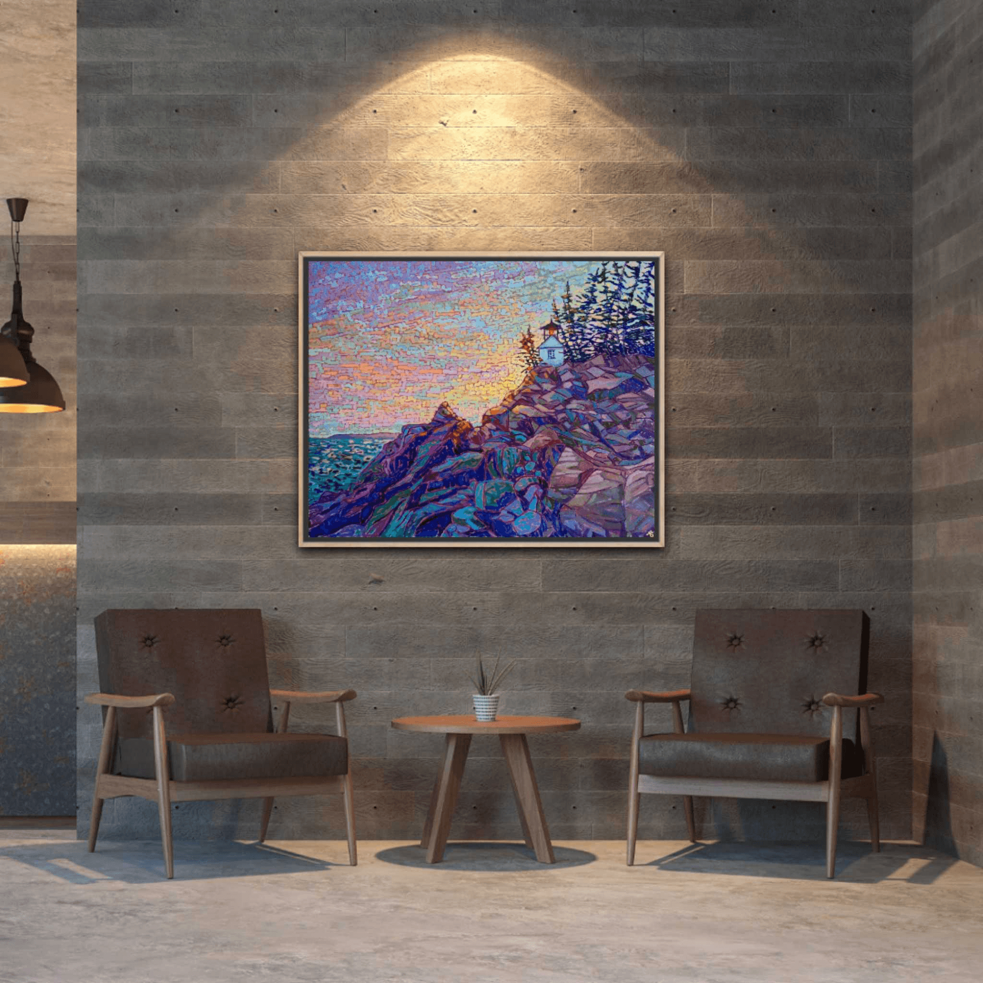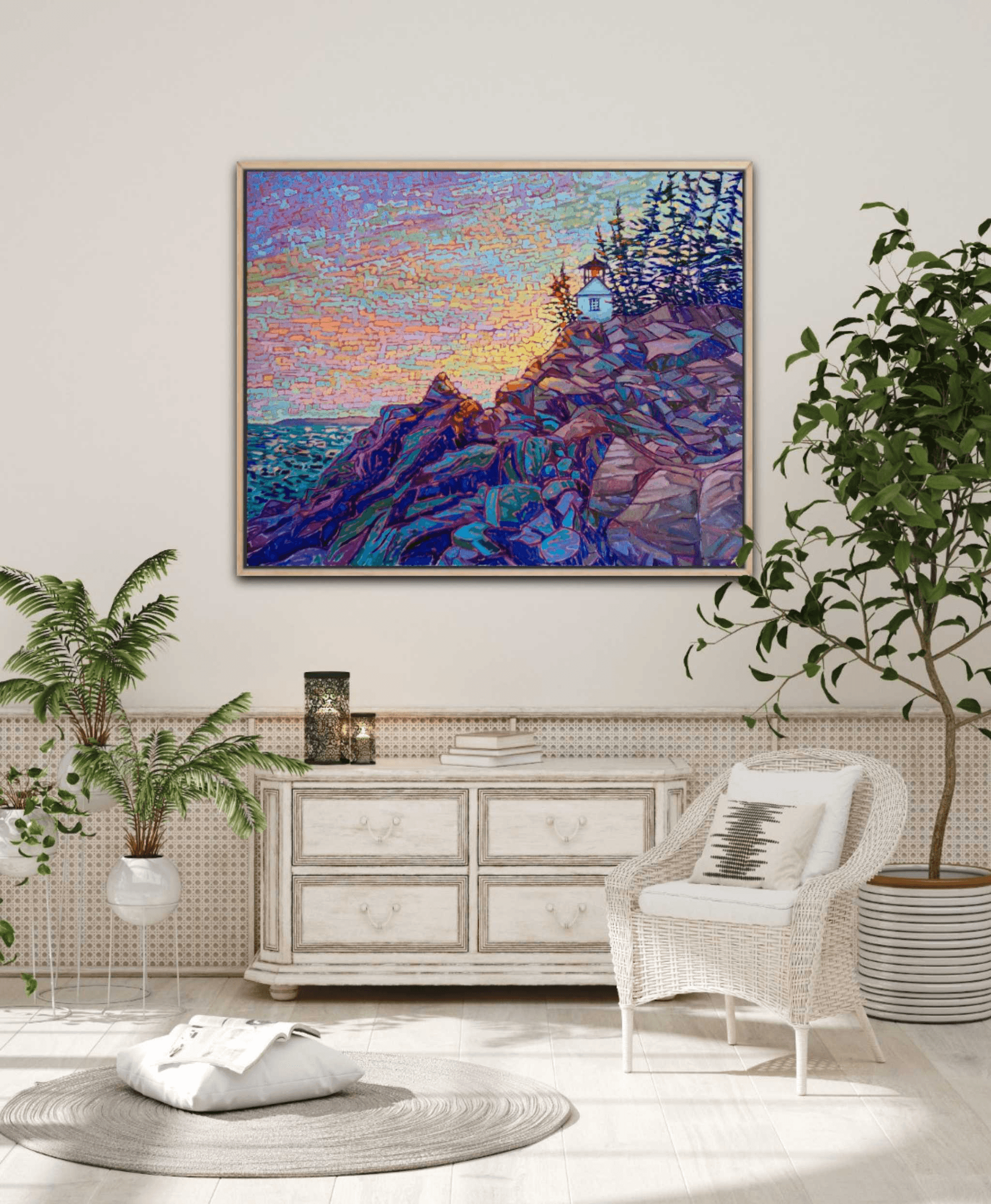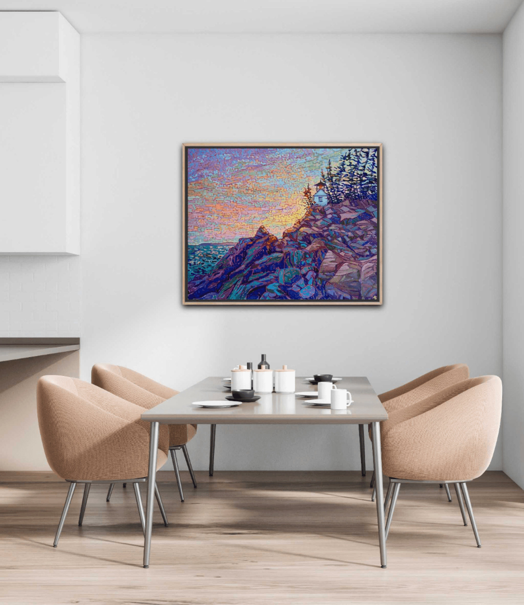 The sun is setting behind the Bass Harbor lighthouse as its last rays peer from behind the big rock formation. The light touches the edge of the rocks one last time before the sun dips behind the Atlantic Ocean, illuminating the landscape and casting a heavenly glow on the land. The title of this painting hints at both sources of light, the setting sun as well as the magnificent lighthouse.