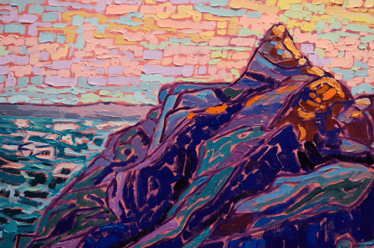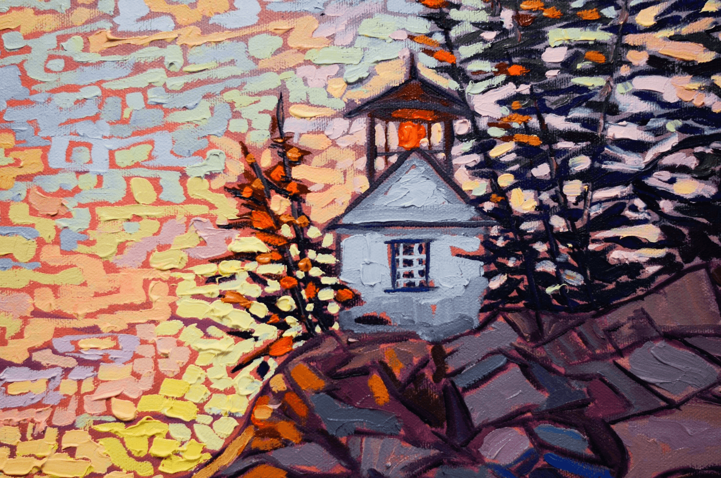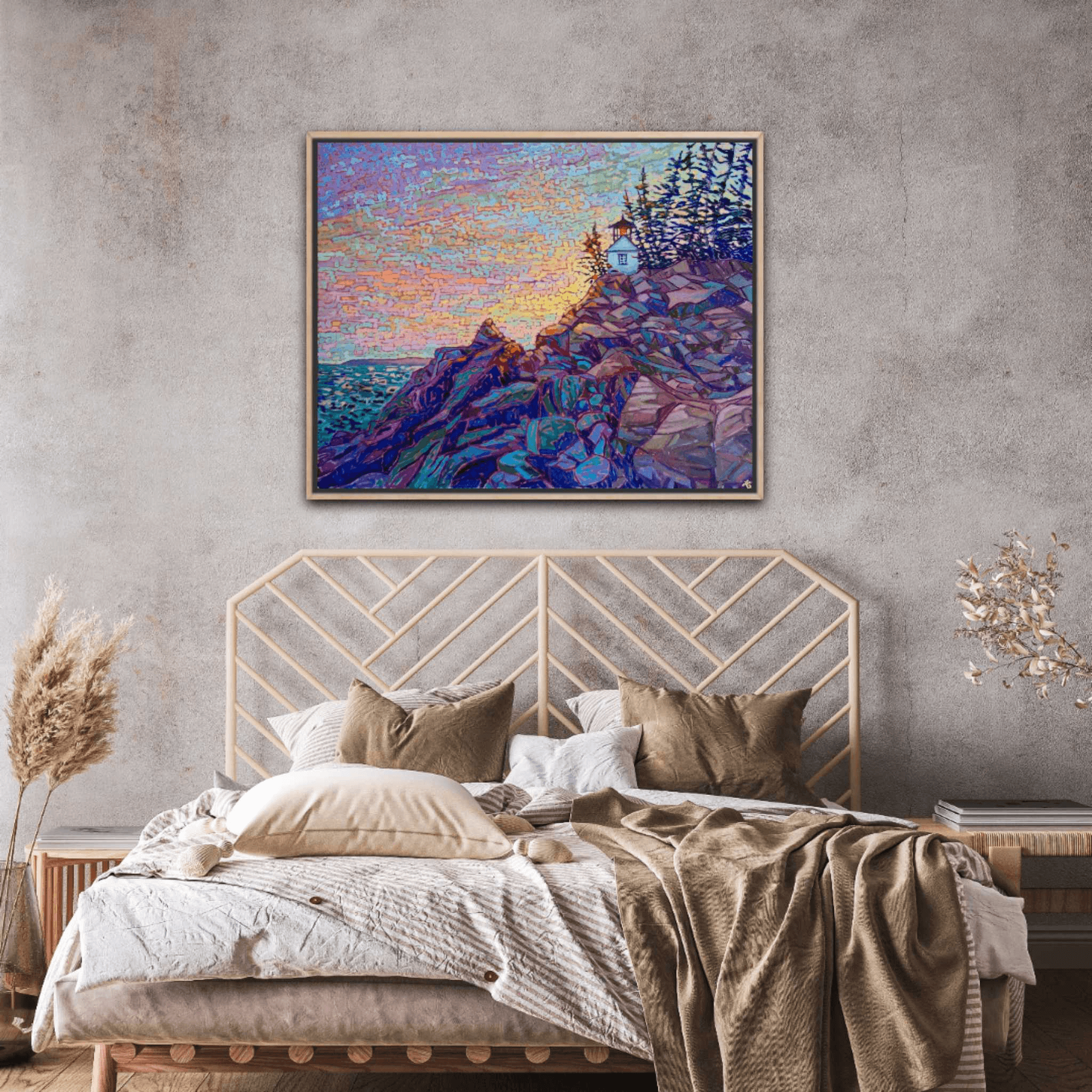The sun is setting behind the Bass Harbor lighthouse as its last rays peer from behind the big rock formation. The light touches the edge of the rocks one last time before the sun dips behind the Atlantic Ocean, illuminating the landscape and casting a heavenly glow on the land. The title of this painting hints at both sources of light, the setting sun as well as the magnificent lighthouse.