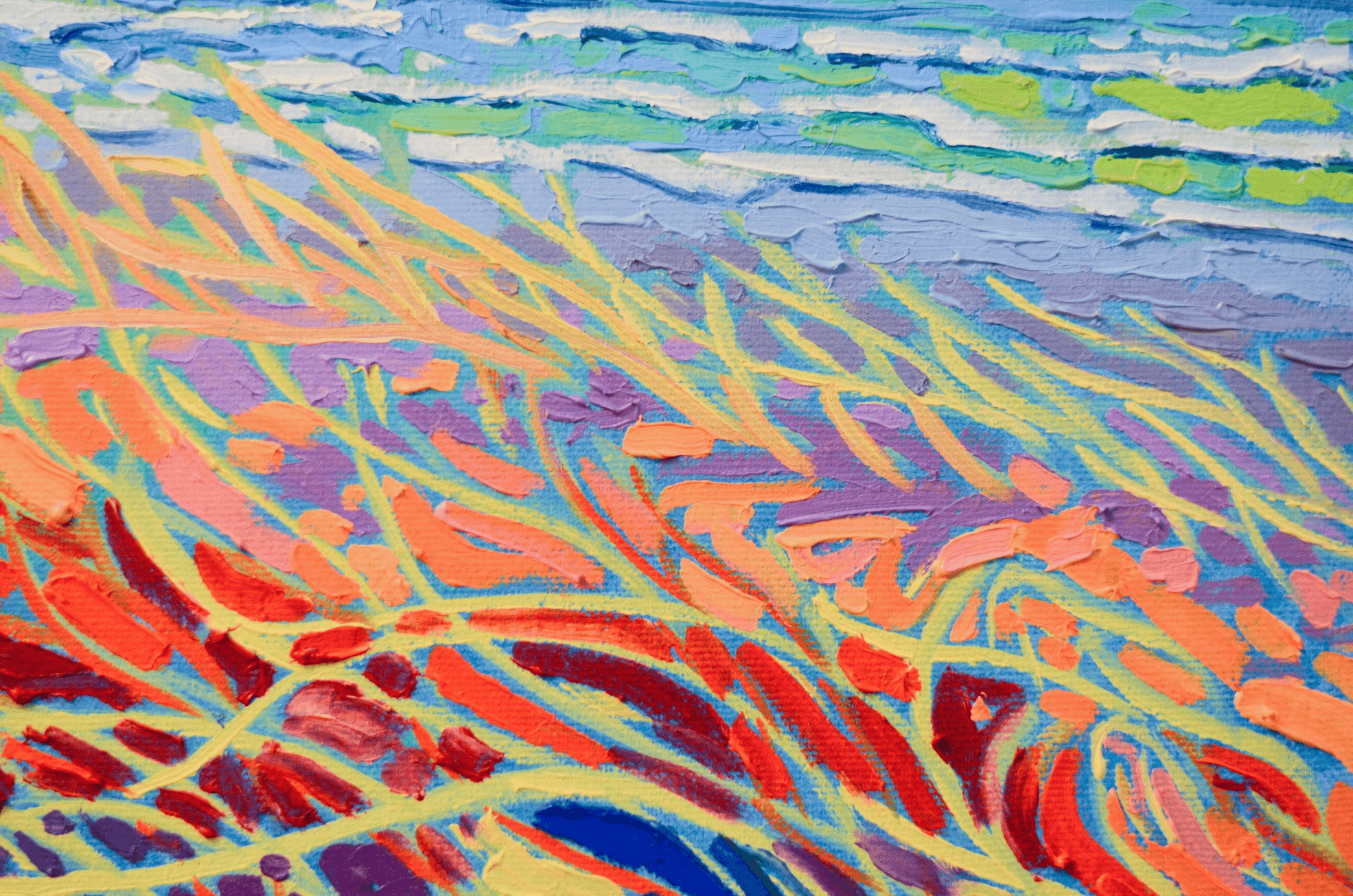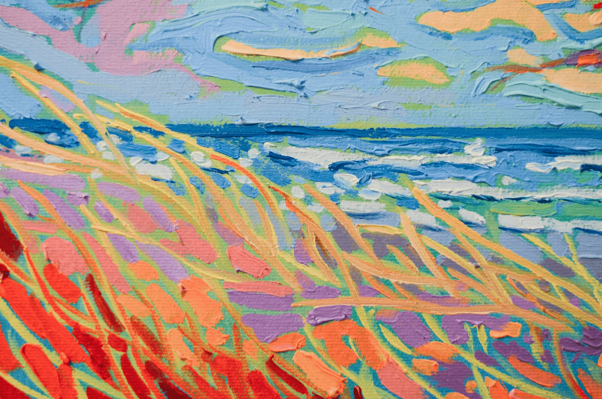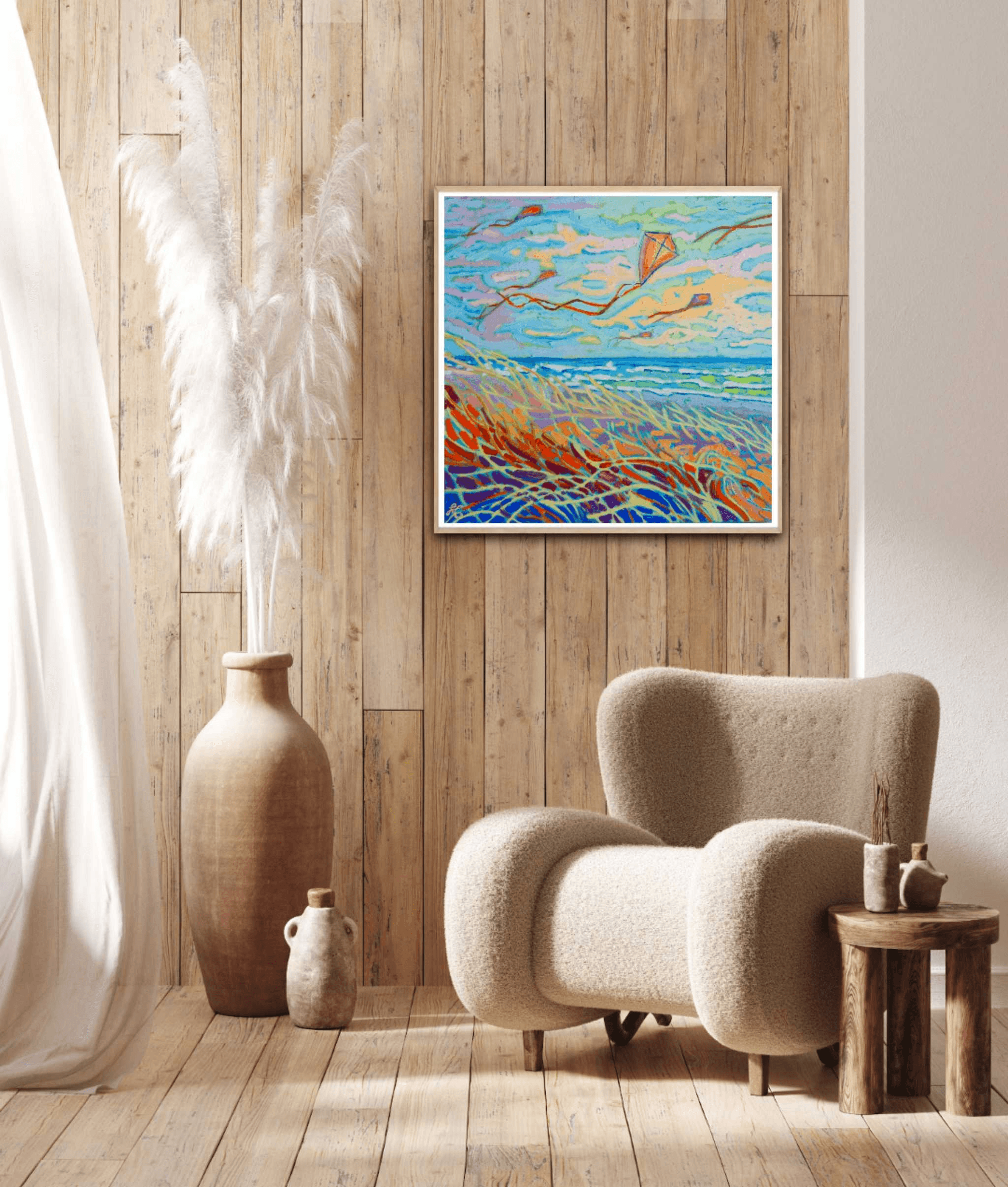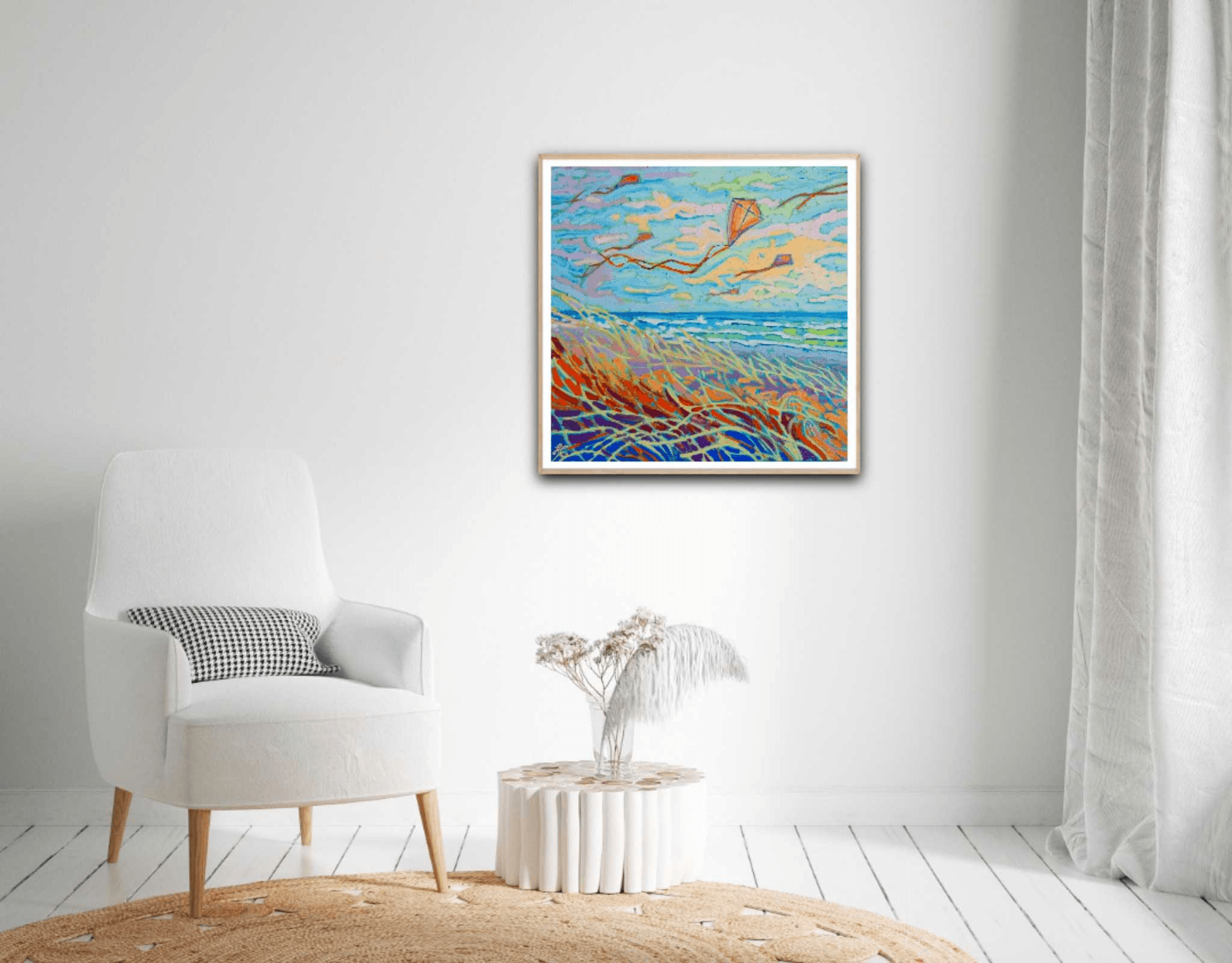 Nothing says summer and freedom like a collection of colorful kites swaying to the sea breeze on a sandy shore. The scene is beautifully framed by the grass stems in the foreground as they also dance to the light touch of the soft coastal zephyr carrying the aromas of sea salt, wet sand and warm sun in its midst.