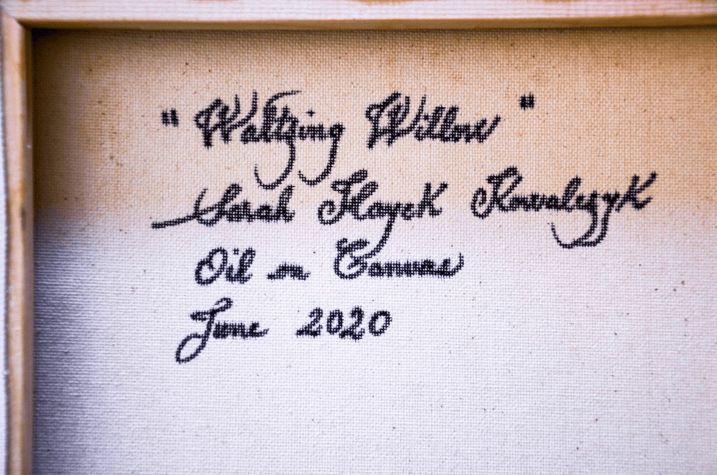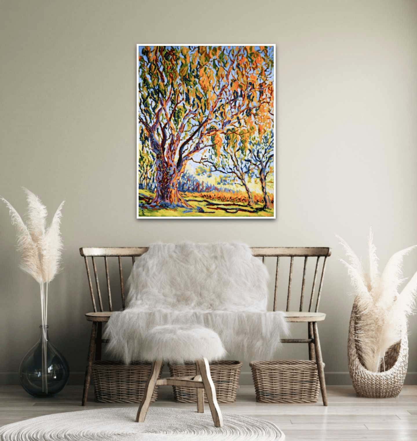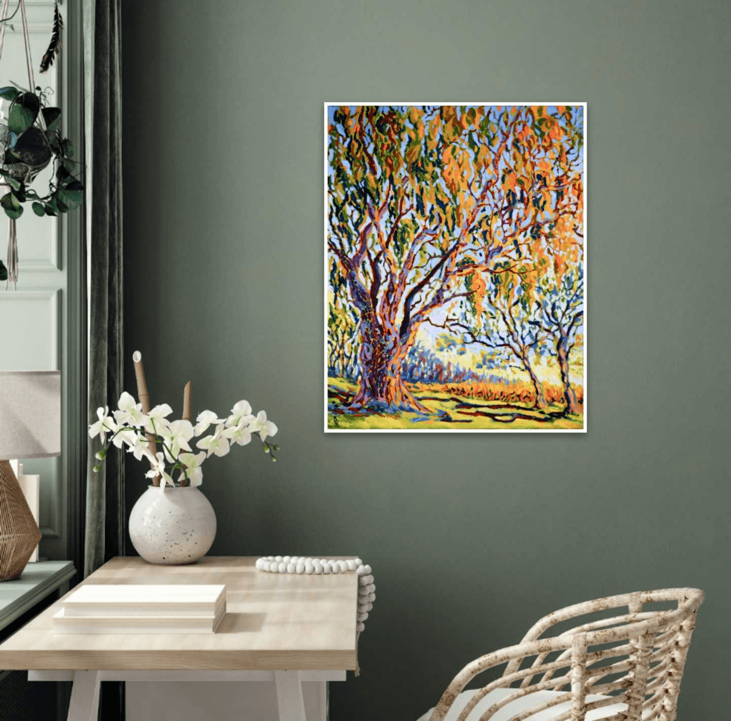 I don't agree with the naming of Weeping Willows. It evokes sadness when in reality these gorgeous trees actually bring so much beauty and joy to a place. So I renamed them "Waltzing Willows" a moniker that rightly gives them a charming, dance-like quality reserved only to glorious trees such as these. And so, my "Waltzing Willow" portrayed on a zesty green splash of grass, surrounded by more lush greenery and foliage, stands tall and proud as the wind plays with its tousled leaves like children's curls in the breeze.