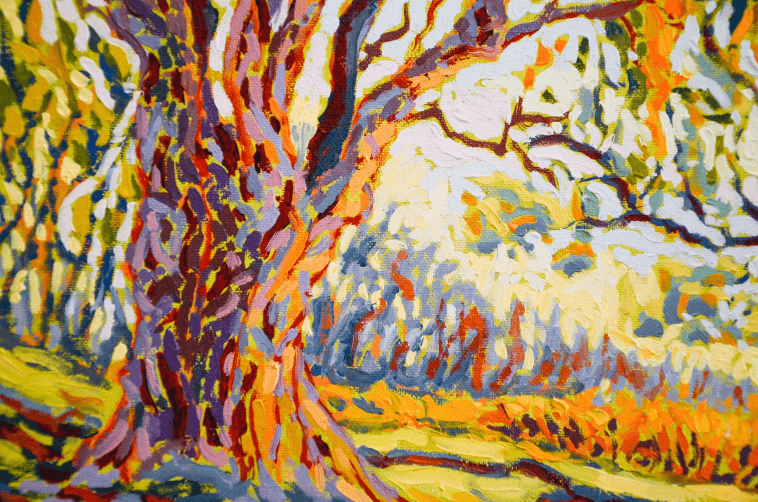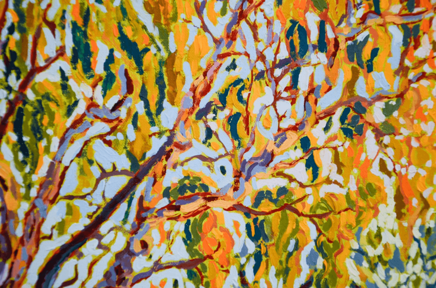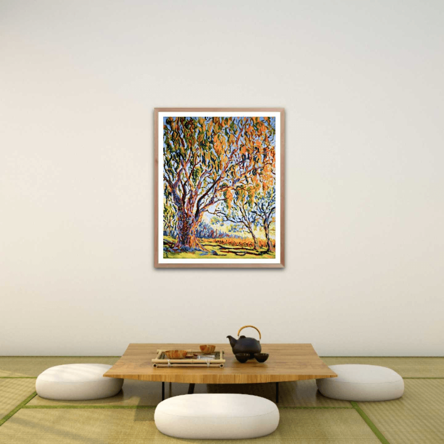 I don't agree with the naming of Weeping Willows. It evokes sadness when in reality these gorgeous trees actually bring so much beauty and joy to a place. So I renamed them "Waltzing Willows" a moniker that rightly gives them a charming, dance-like quality reserved only to glorious trees such as these. And so, my "Waltzing Willow" portrayed on a zesty green splash of grass, surrounded by more lush greenery and foliage, stands tall and proud as the wind plays with its tousled leaves like children's curls in the breeze.