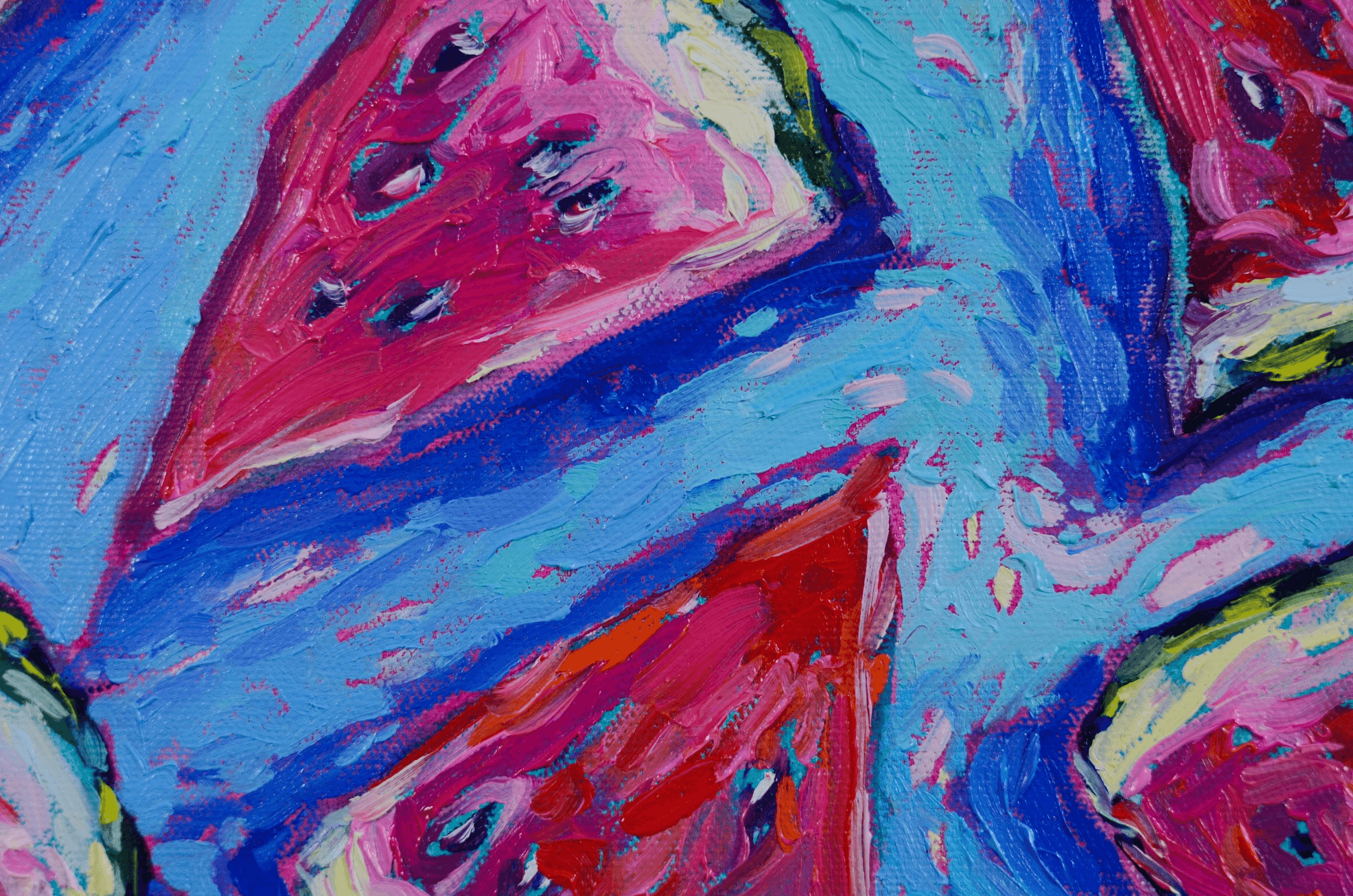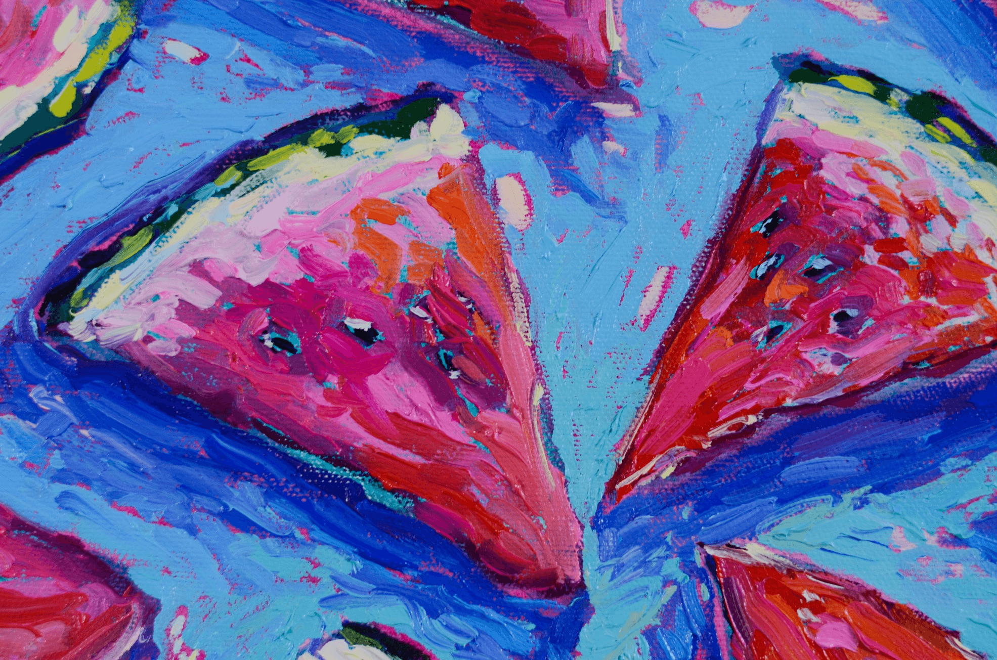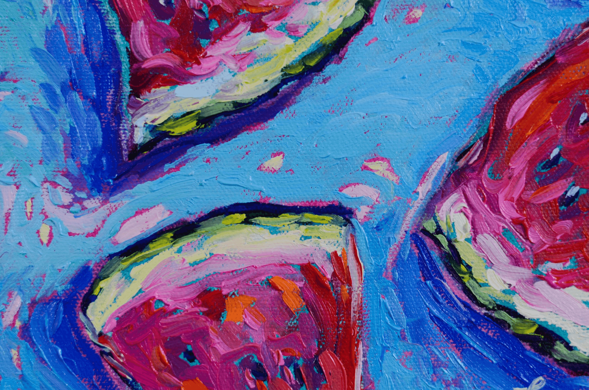 Watermelon wedges as red and juicy as can be against a blue vibrant background. As much as this painting is a still-life, it has movement, vitality an...