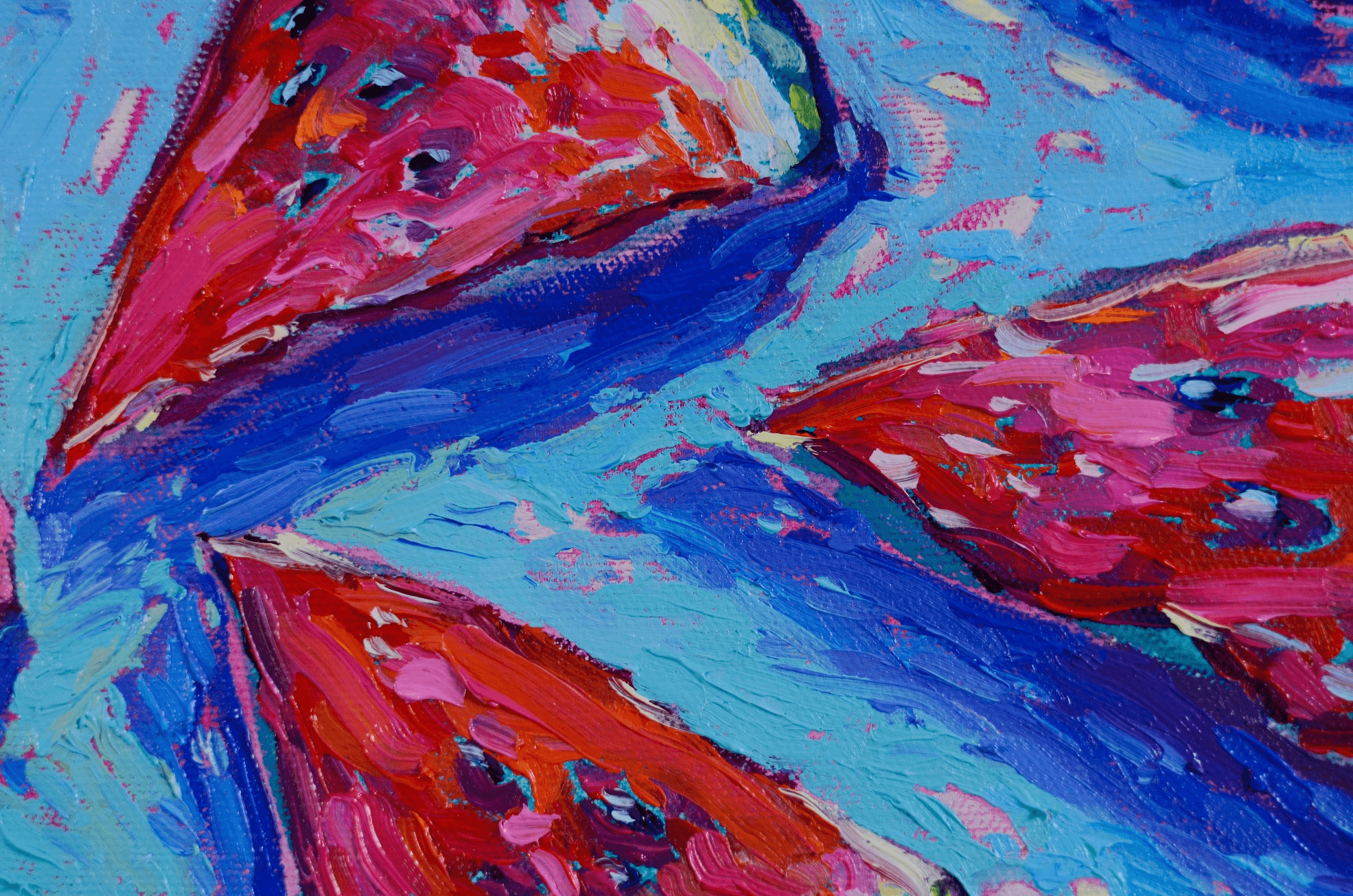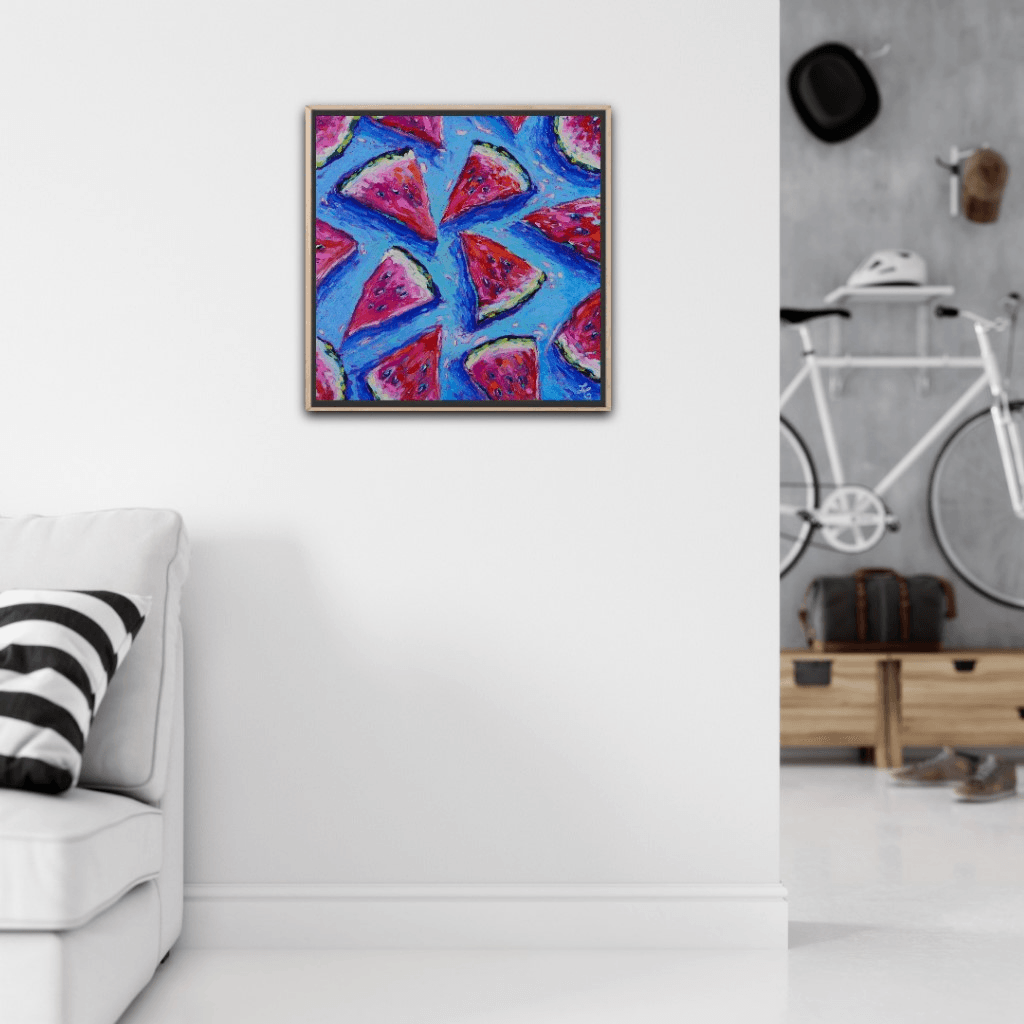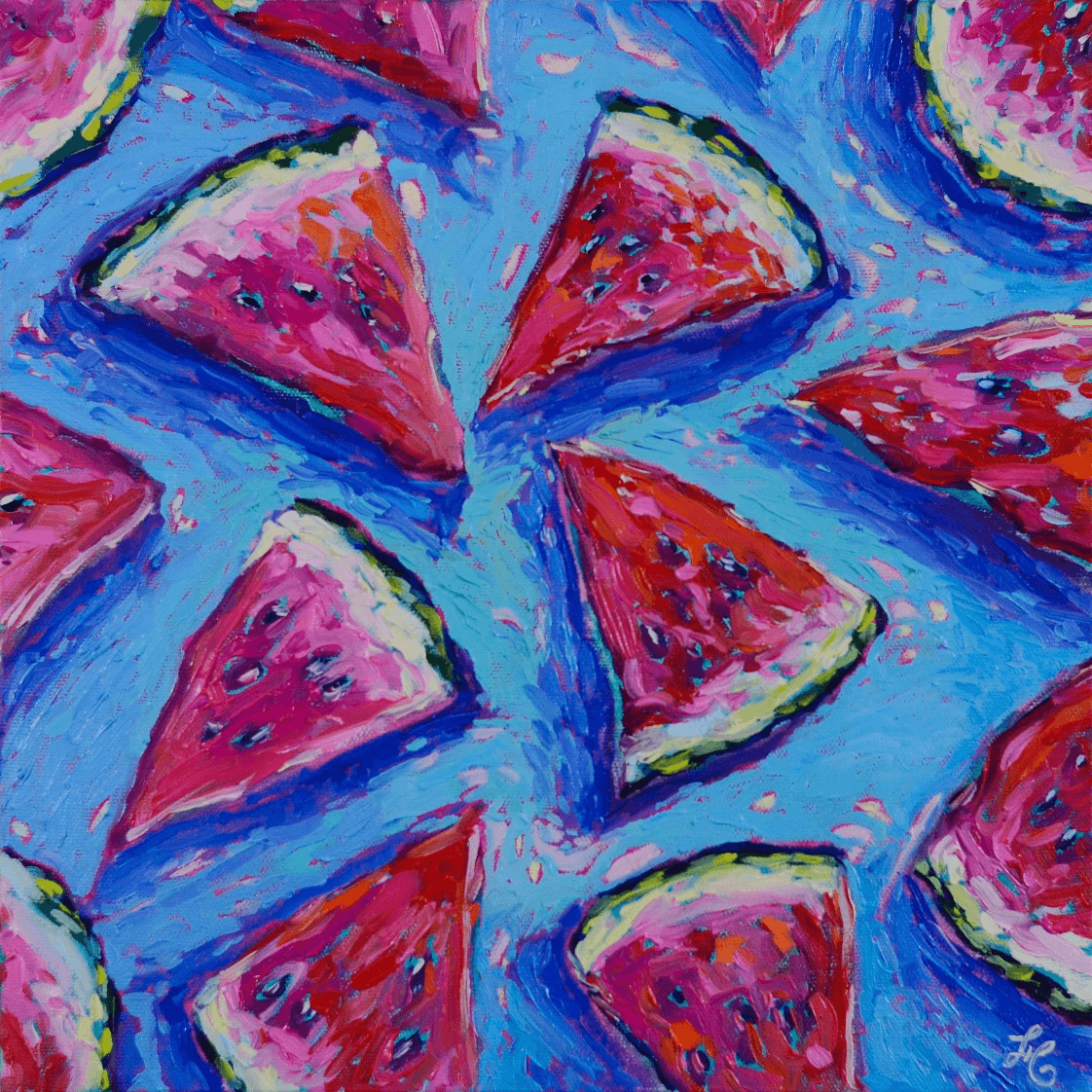 Watermelon wedges as red and juicy as can be against a blue vibrant background. As much as this painting is a still-life, it has movement, vitality and life just like a beating heart.