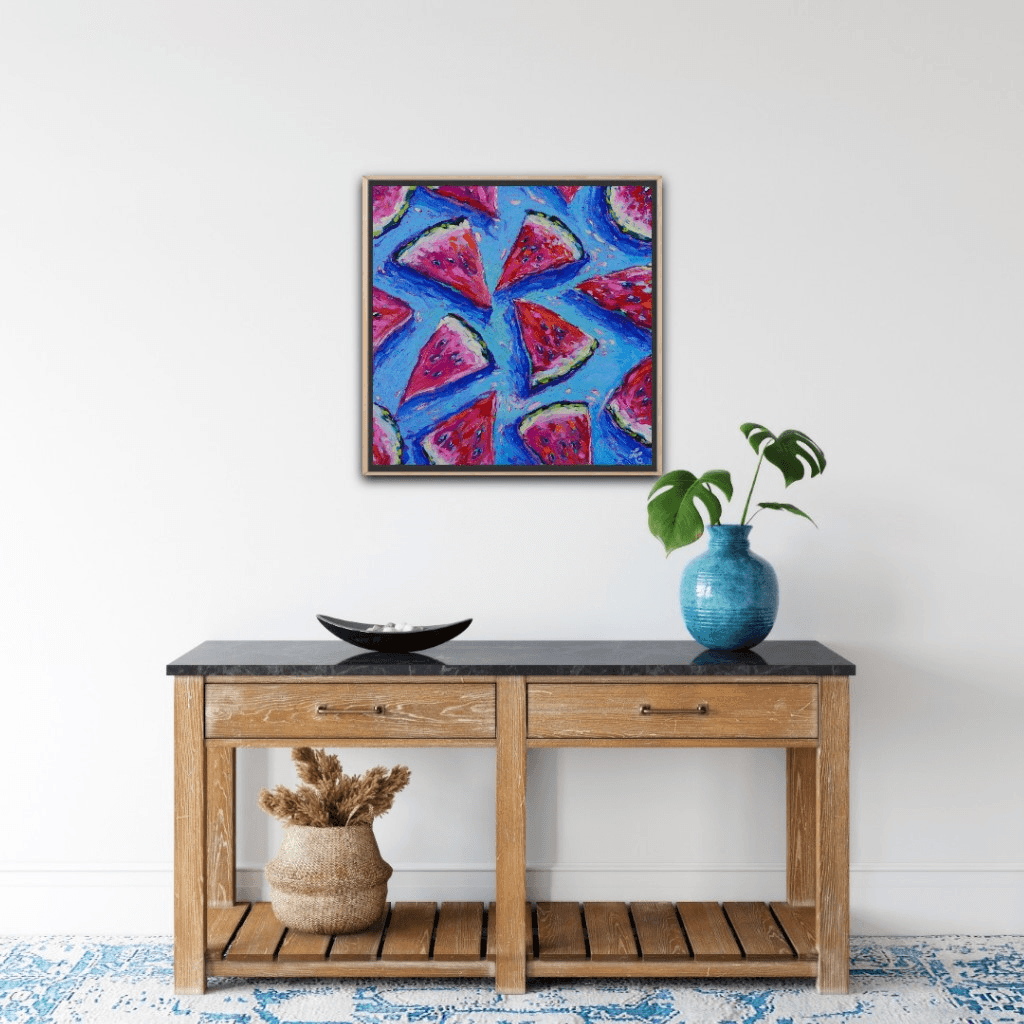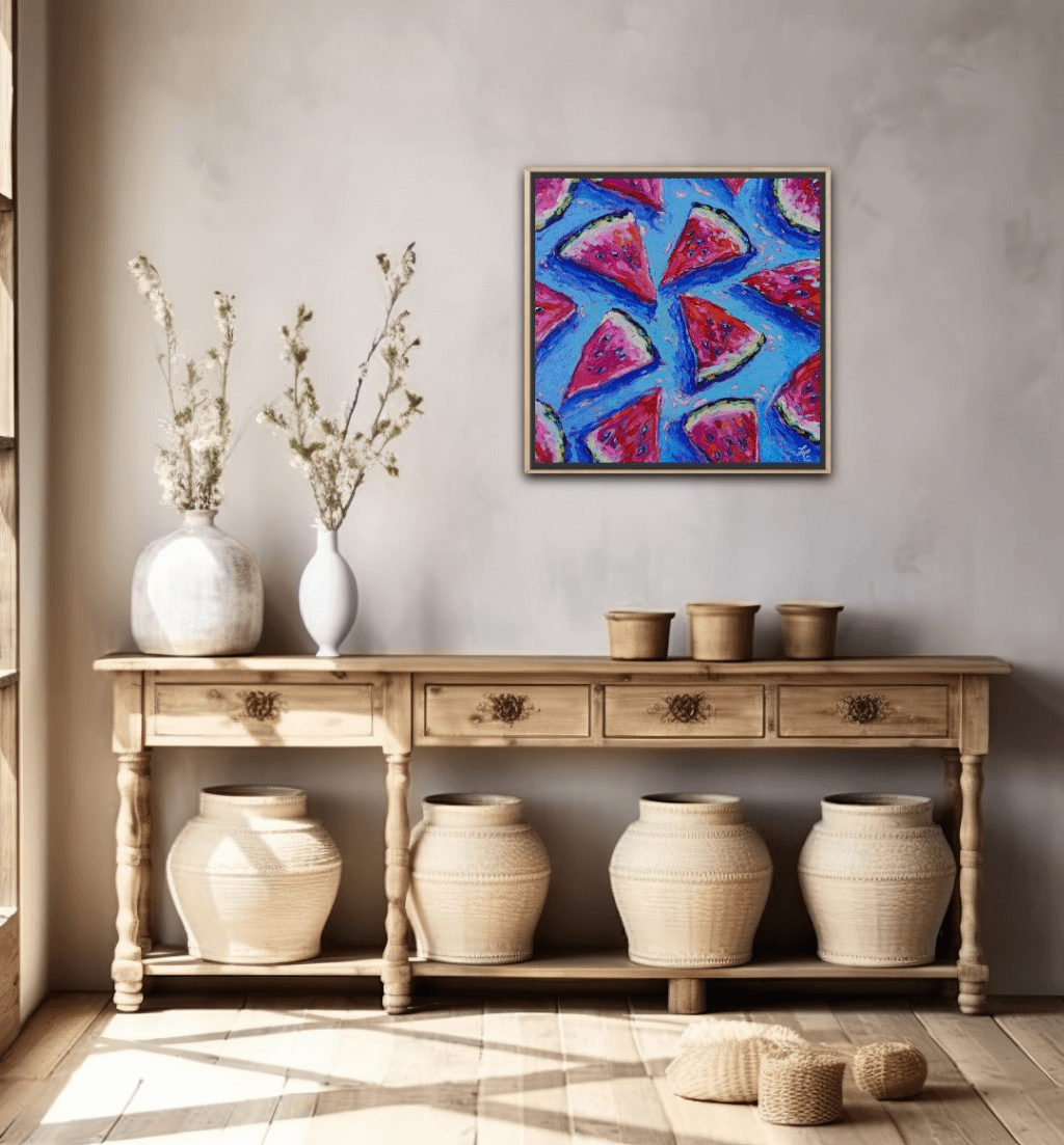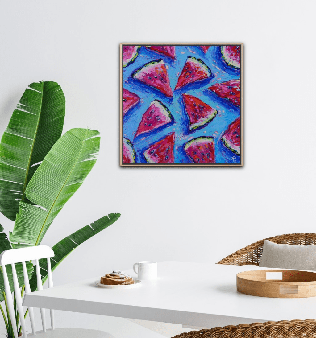 Watermelon wedges as red and juicy as can be against a blue vibrant background. As much as this painting is a still-life, it has movement, vitality and life just like a beating heart.