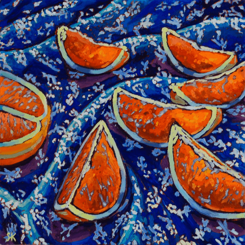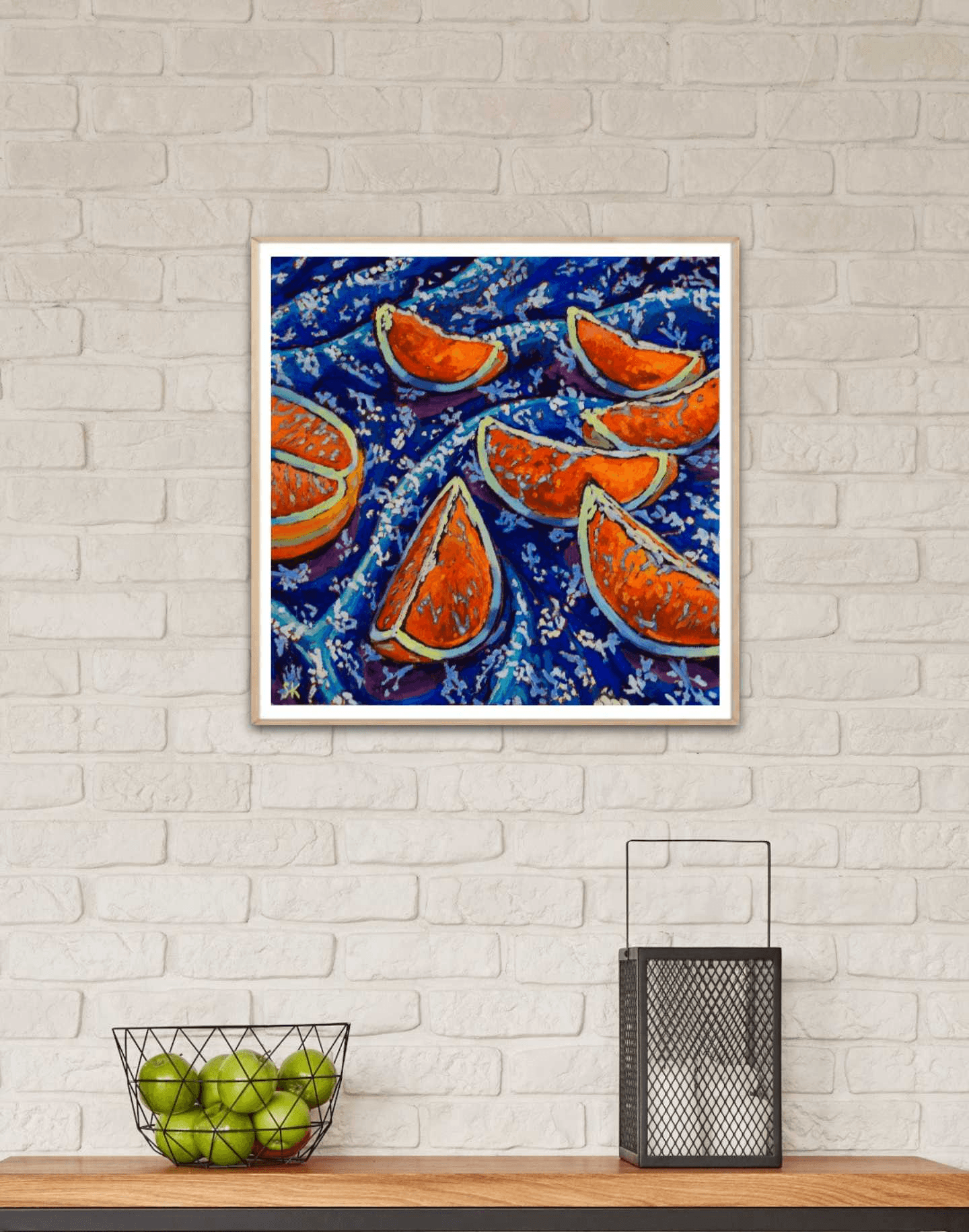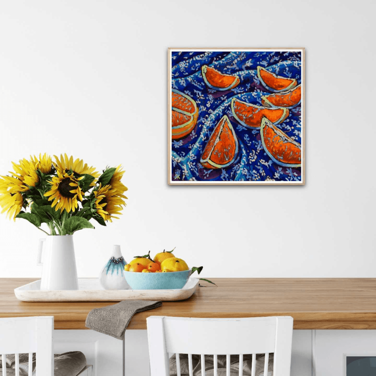 Vibrant and fresh looking orange slices set against a contrasting, fluid and rich blue background. The thick brushstrokes and paint add a beautiful three-dimensional quality to this artwork bringing it more to life. The pattern on the blue throw that makes the background marries well with the overall effect of this still-life and its textured finish.