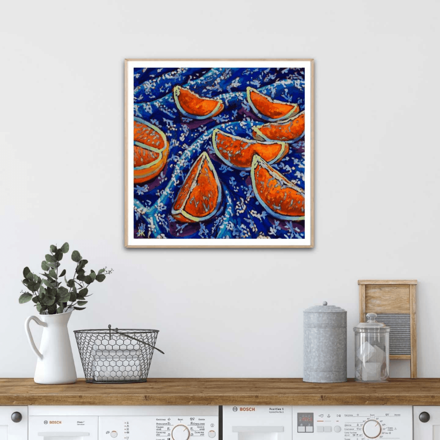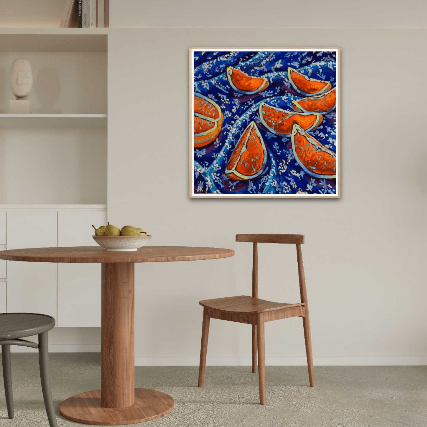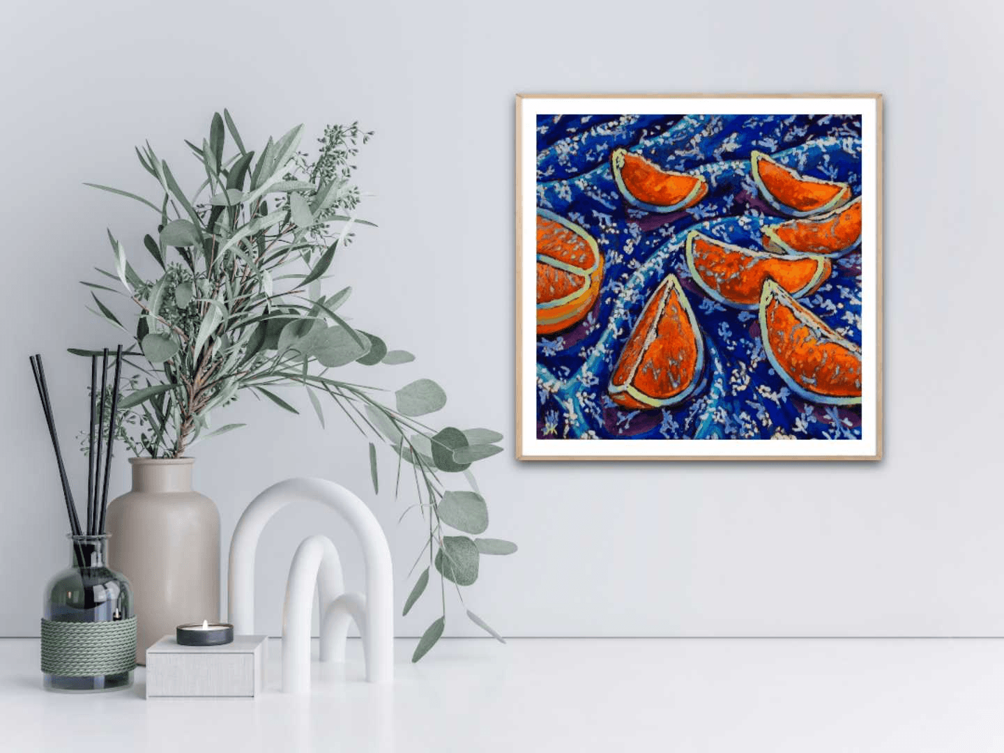 Vibrant and fresh looking orange slices set against a contrasting, fluid and rich blue background. The thick brushstrokes and paint add a beautiful three-dimensional quality to this artwork bringing it more to life. The pattern on the blue throw that makes the background marries well with the overall effect of this still-life and its textured finish.